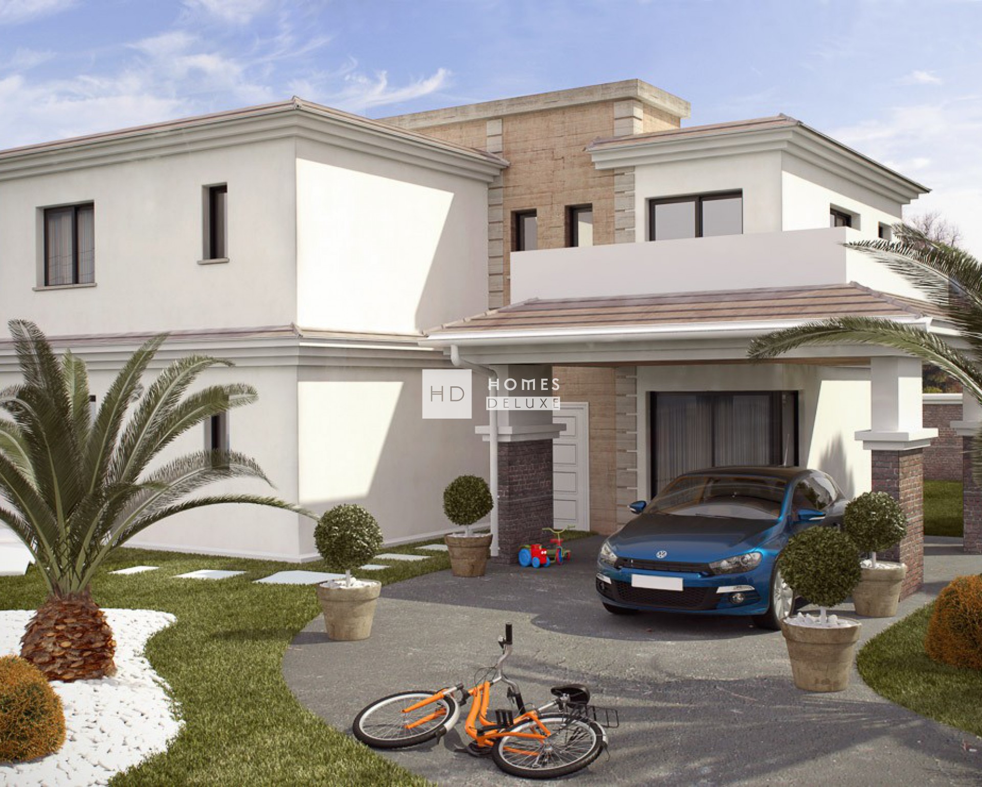 La villa se compose d'un salon et d'une salle à manger ouverts, spacieux et lumineux, avec des portes-fenêtres donnant accès à la terrasse et au jardin, d'une cuisine indépendante avec des portes-fenêtres donnant accès à l'extérieur, d'une chambre double et d'une salle de bains d'invités au rez-de-chaussée. L'escalier interne vous mène au premier étage avec la chambre principale avec salle de bain en-suite et accès à une terrasse privée de 11m2, deux autres chambres doubles qui ont accès à une grande terrasse de 23m2 pour profiter du soleil toute la journée. Il y a beaucoup d'espace extérieur au niveau du rez-de-chaussée avec le grand jardin et la terrasse pour profiter des zones de détente et des repas en plein air, un parking privé pour deux véhicules sur le terrain et la possibilité d'ajouter une piscine privée. Avec le choix des matériaux, des finitions et de la distribution, la villa peut être adaptée en fonction de vos goûts et besoins personnels. Il existe un choix de revêtements de sol et de carrelages, les propriétés sont également livrées avec une pré-installation pour la climatisation par conduits et un système d'énergie renouvelable (Aerotermo).