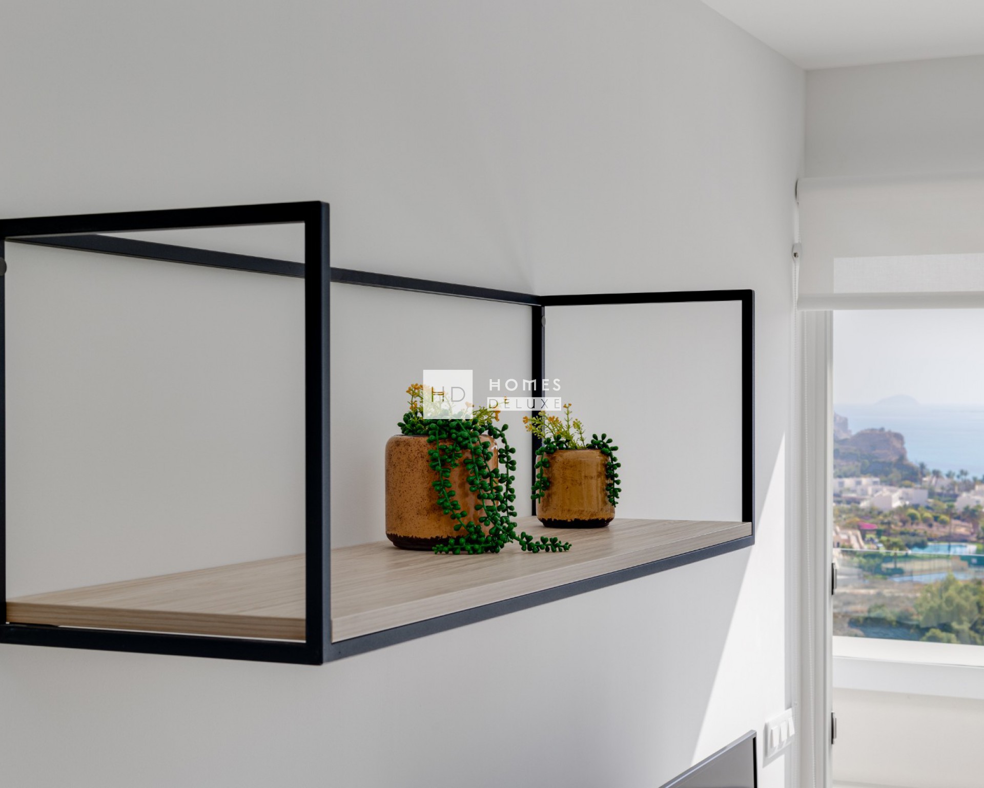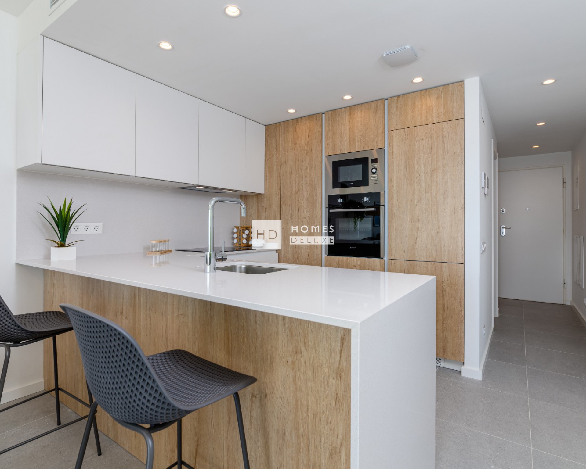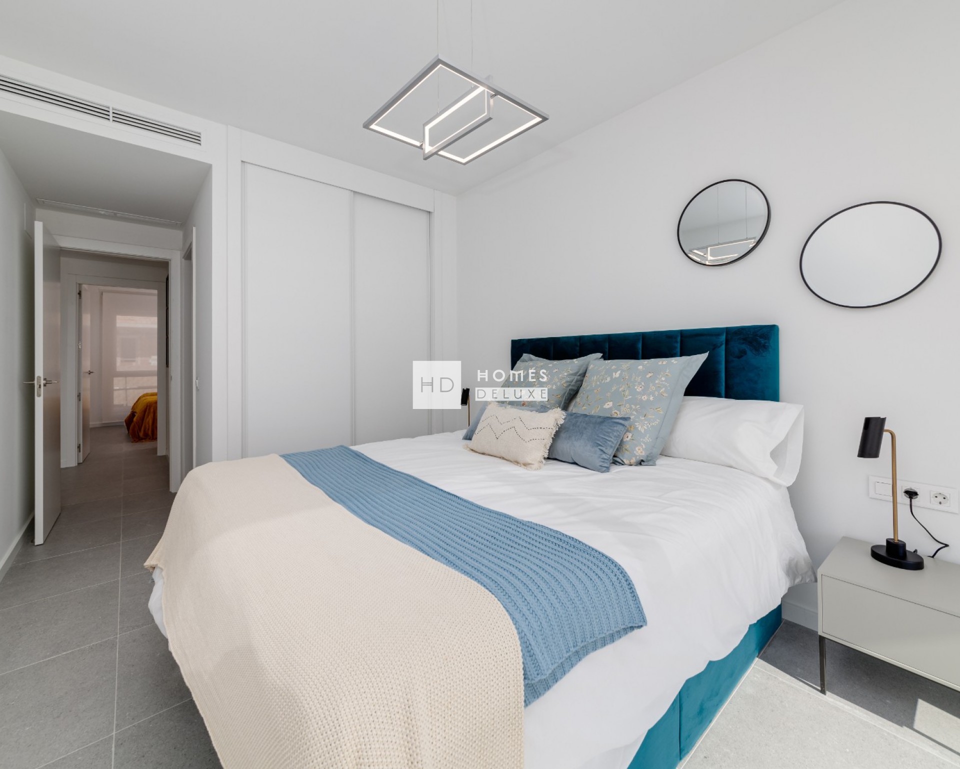 De indeling van het interieur bestaat uit een lichte en ruime woon- en eetkamer met grote ramen die direct uitkomen op het terras, zodat je vanuit het interieur kunt genieten van het landschap, een volledig ingerichte moderne keuken in Amerikaanse stijl, een grote slaapkamer met en-suite badkamer, nog twee tweepersoonsslaapkamers en een aparte gastenbadkamer die ook toegankelijk is vanuit een van de slaapkamers. Afhankelijk van het modelappartement dat je kiest, heb je een privésolarium of een privétuin en een open onderbouw.