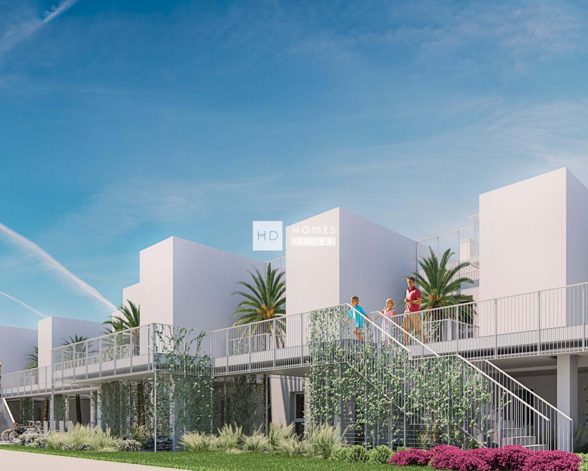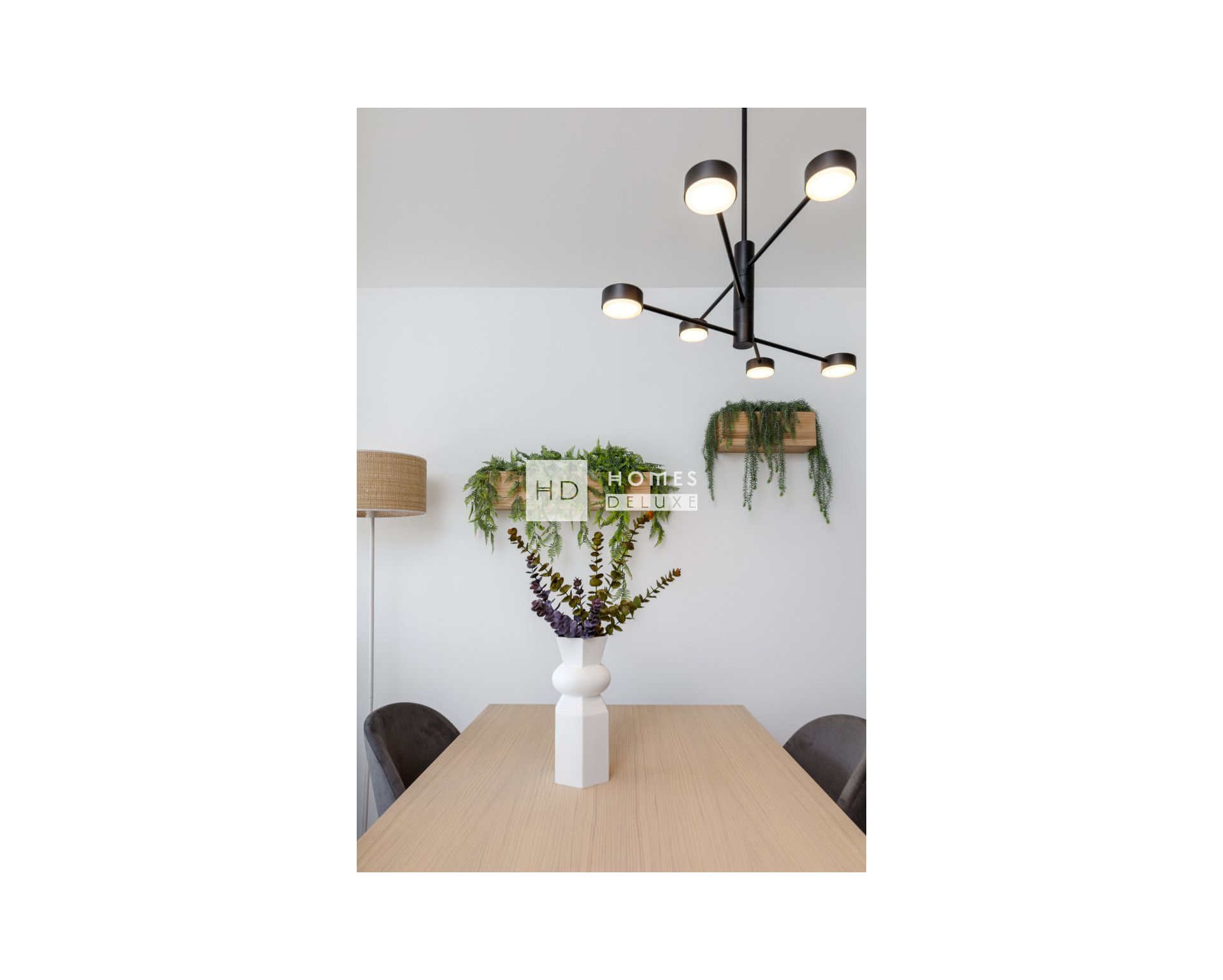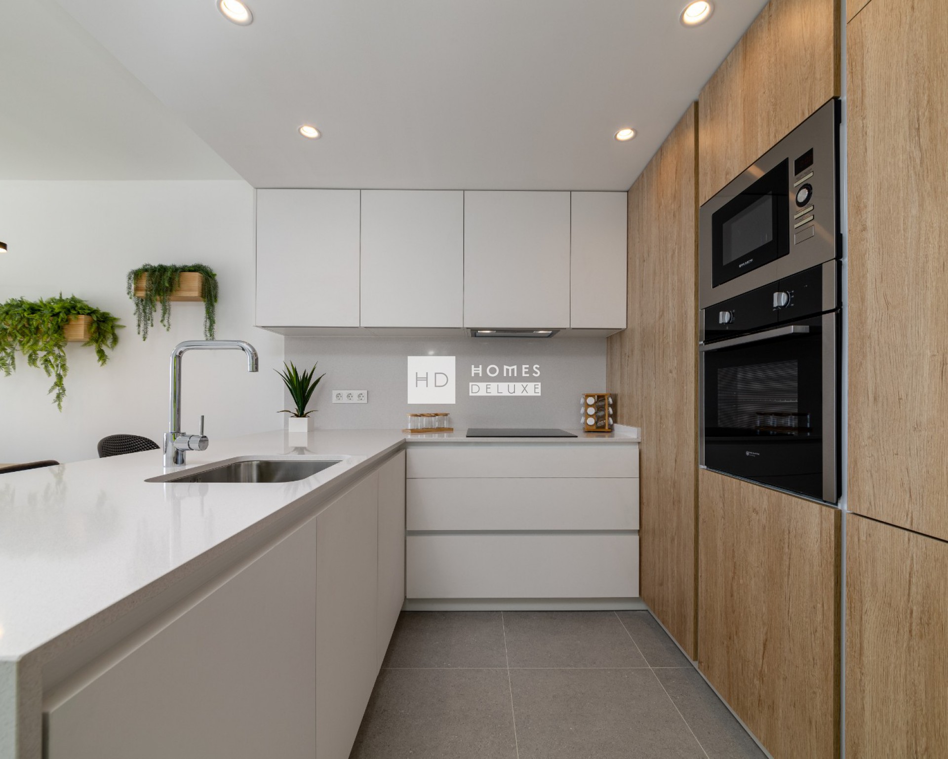 De indeling van het interieur bestaat uit een lichte en ruime woon- en eetkamer met grote ramen die direct uitkomen op het terras, zodat je vanuit het interieur kunt genieten van het landschap, een volledig ingerichte moderne keuken in Amerikaanse stijl, een grote slaapkamer met en-suite badkamer, nog twee tweepersoonsslaapkamers en een aparte gastenbadkamer die ook toegankelijk is vanuit een van de slaapkamers. Afhankelijk van het modelappartement dat je kiest, heb je een privésolarium of een privétuin en een open onderbouw.