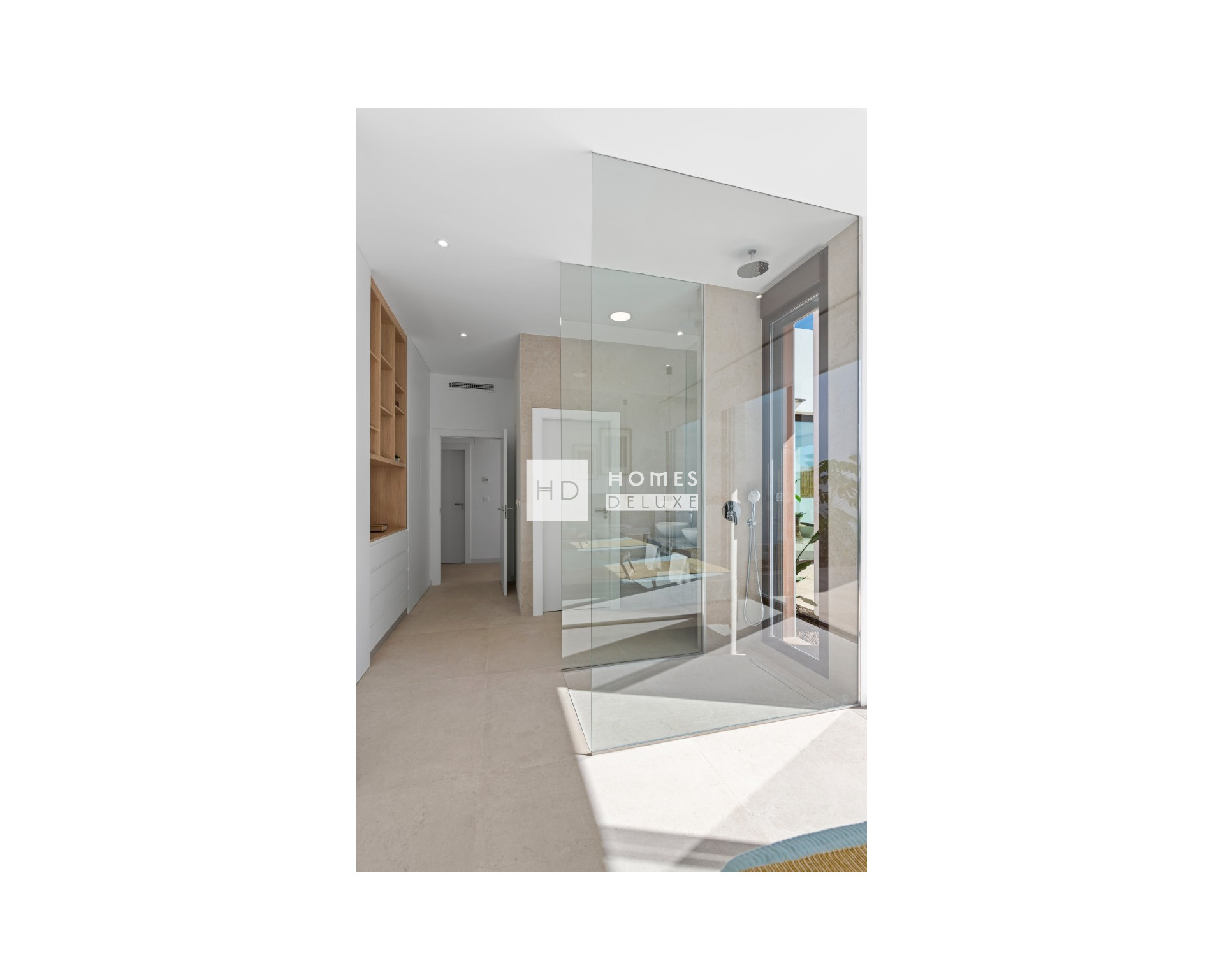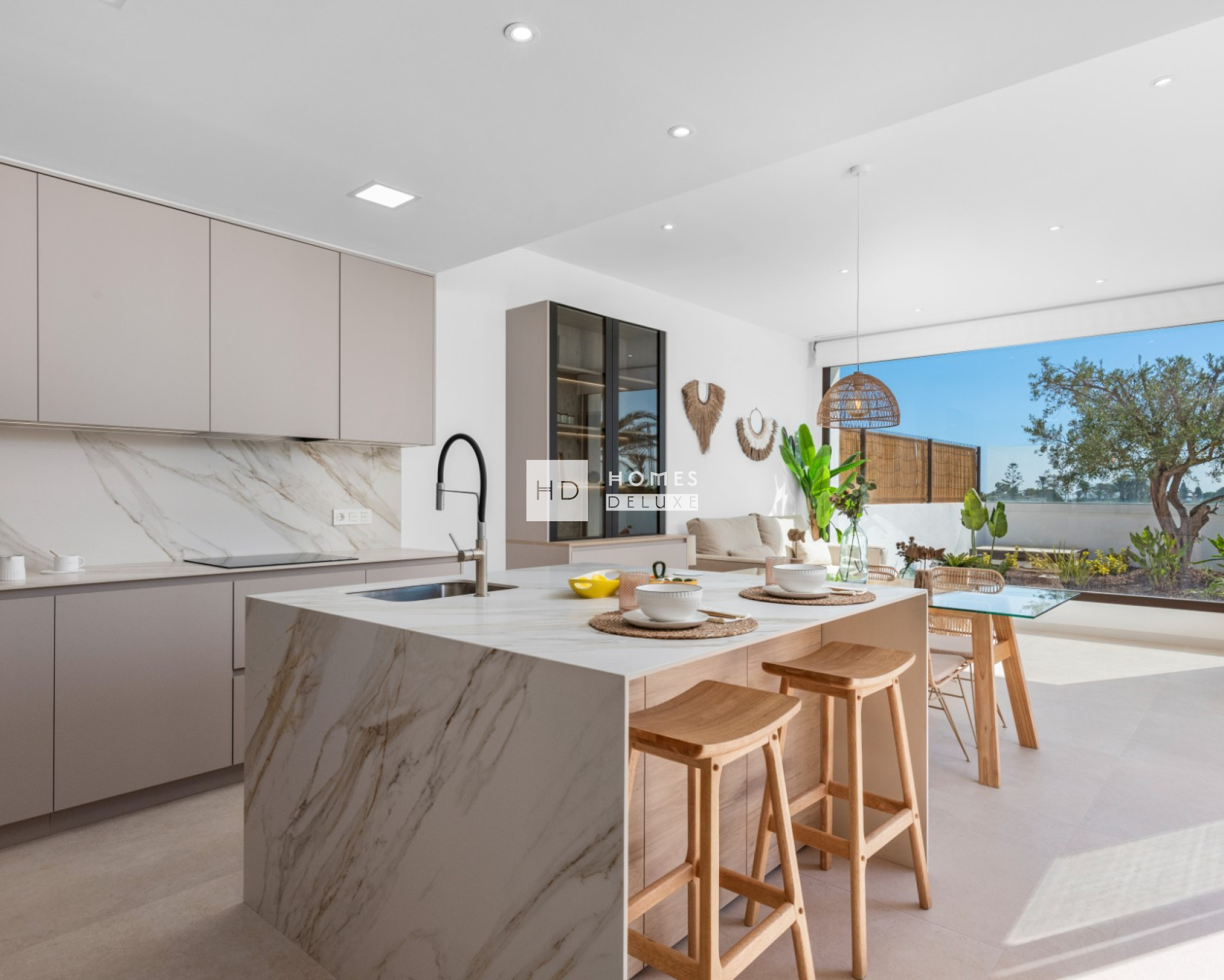 Het interieur bestaat uit een hal die leidt naar de lichte en ruime open lounge en eetkamer met grote dubbele ramen die uitkomen op het terras, een volledig ingerichte moderne keuken in Amerikaanse stijl, grote slaapkamer met en-suite badkamer, kleedruimte en openslaande deuren naar het terras en het zwembad, nog twee slaapkamers en een aparte badkamer voor gasten. Het optionele solarium op het dak is toegankelijk via een buitentrap op het terras. De woningen zijn inclusief pre-installatie voor airconditioning, ingebouwde kasten in alle slaapkamers, LED-verlichting binnen en buiten, elektrische rolluiken in alle slaapkamers, video-intercomsysteem, privézwembad met pre-installatie voor een warmtepomp en een eigen parkeerplaats op het perceel.