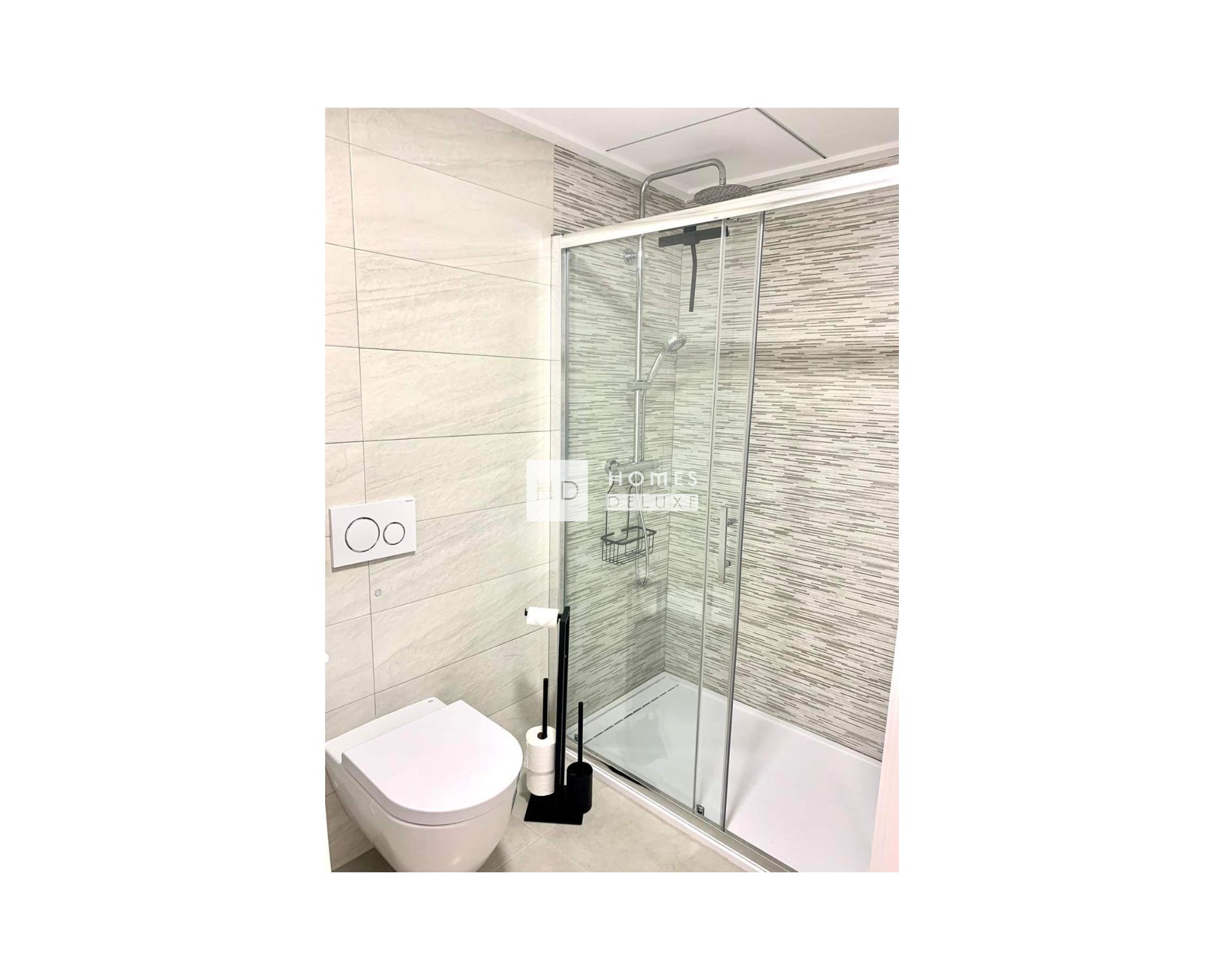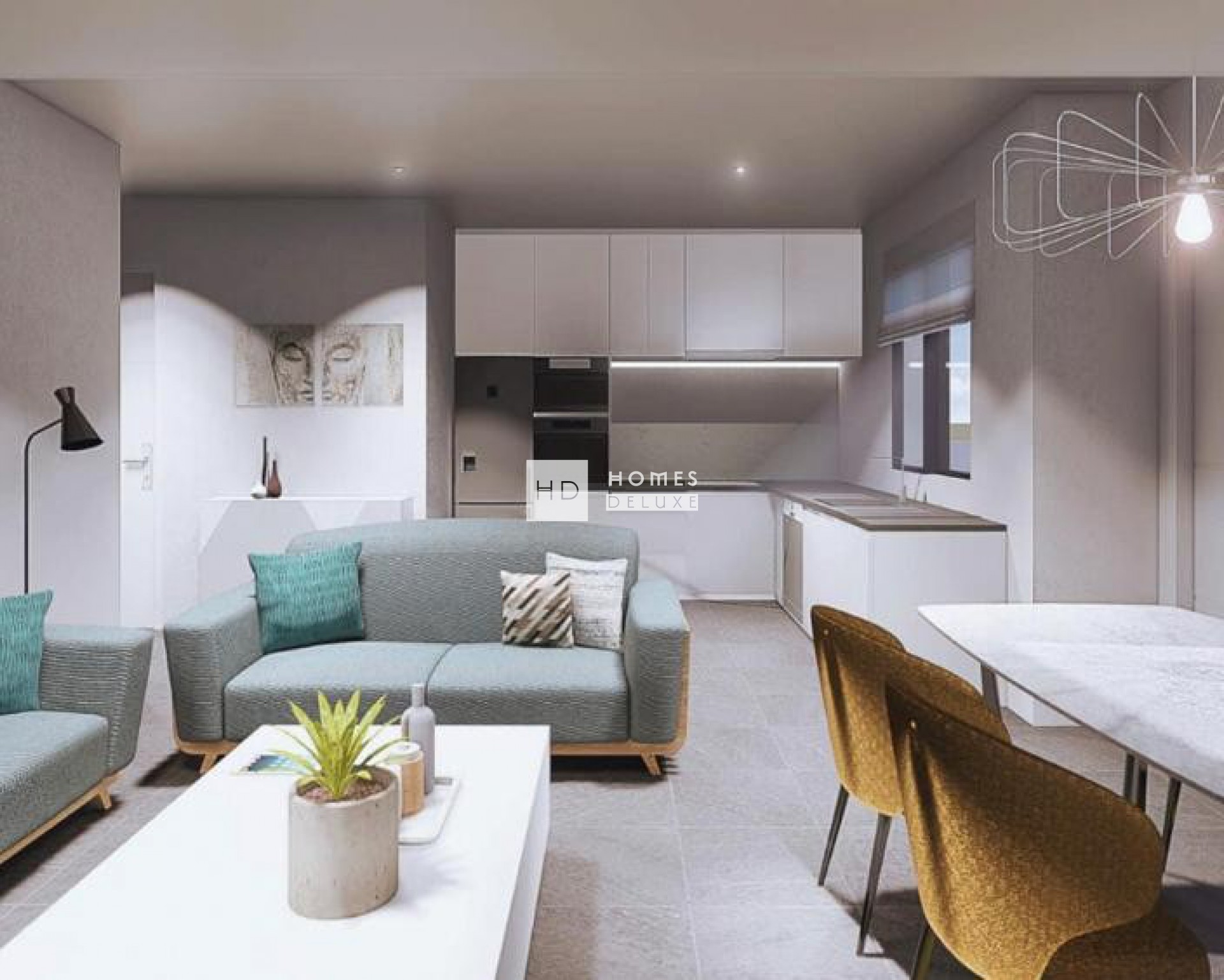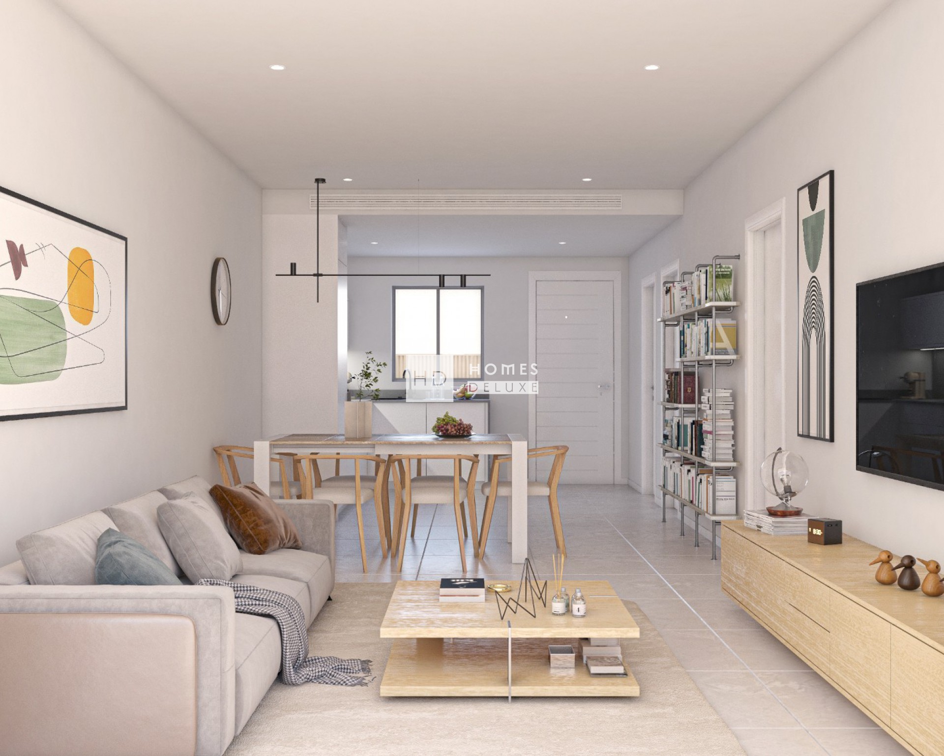 Het interieur bestaat uit een ruime open lounge en eetkamer met grote openslaande deuren die toegang geven tot het terras, een volledig ingerichte moderne Amerikaanse keuken, grote slaapkamer met en-suite badkamer en openslaande deur naar het terras, nog een slaapkamer met tweepersoonsbed en een aparte gastenbadkamer. De appartementen op de bovenste verdieping hebben nog een tweepersoonsslaapkamer en een buitentrap op het terras die leidt naar het uitgebreide dakterras van bijna 76m2 om de hele dag van de zon te genieten.