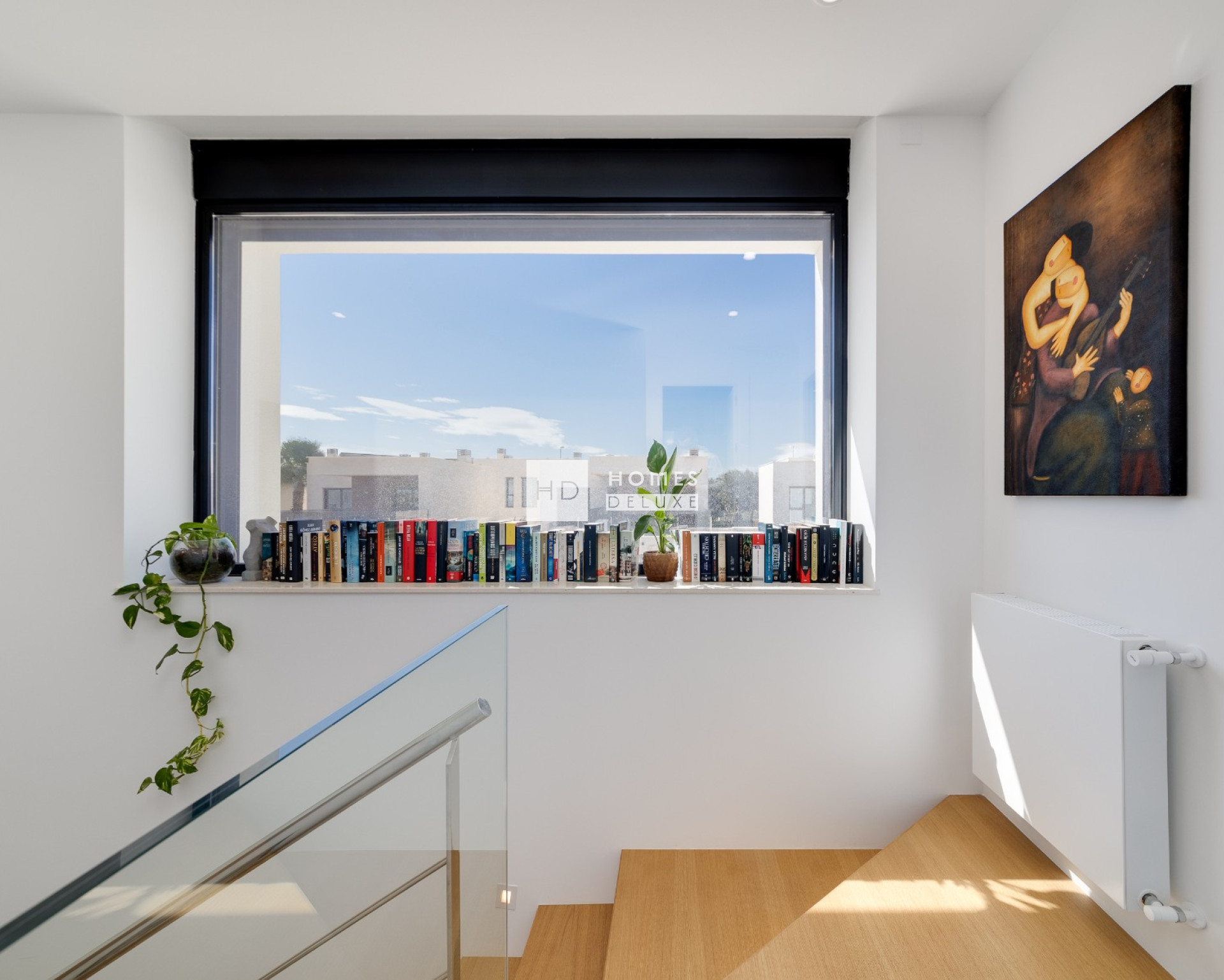 Dit specifieke villamodel is verdeeld over twee verdiepingen en de interieurindeling bestaat uit een hal die leidt naar de ruime open lounge en eetkamer met grote ramen in de hele leefruimte die zorgen voor maximaal natuurlijk licht en openslaande deuren naar het terras en de tuin, een grote volledig ingerichte moderne Amerikaanse keuken met kookeiland, een aparte wasruimte en een gastentoilet. Op de begane grond is ook de hoofdslaapkamer met en-suite badkamer. De binnentrap leidt naar de eerste verdieping met nog eens twee tweepersoonsslaapkamers, beide met openslaande deuren naar het zonneterras, en een aparte gastenbadkamer. De villa geniet van uitgebreide buitenruimte met een privétuin, grote terrasgedeeltes om te chillen naast het privézwembad van 6x3m, en ruimtes om buiten te dineren met een zomerkeuken om familie en vrienden te vermaken. Het perceel heeft ook een privéparkeerplaats met een pergola.