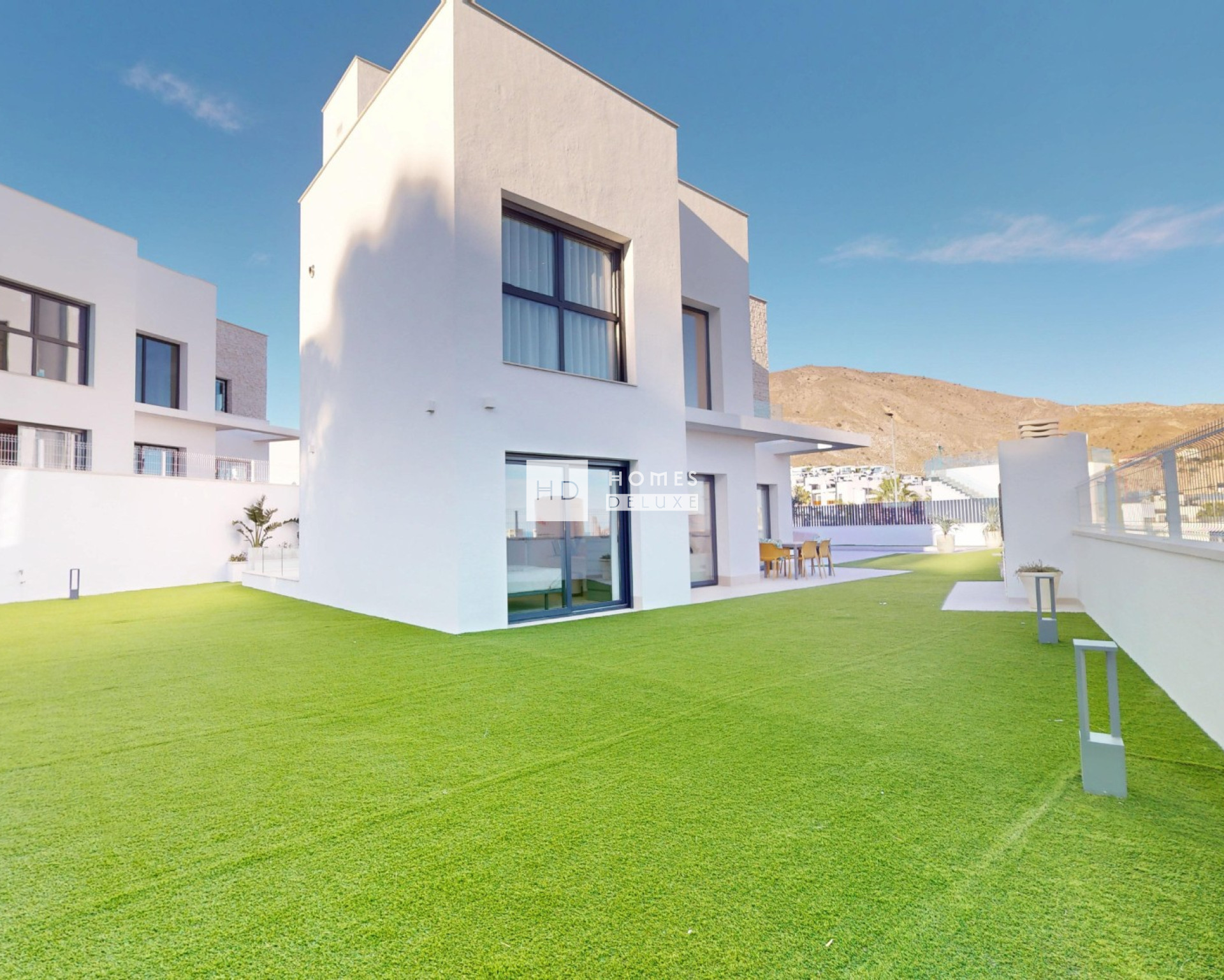 De villa's hebben twee verdiepingen met een privésolarium op het dak. Het interieur bestaat uit een hal die leidt naar de lichte en ruime open lounge en eetkamer met hoge plafonds en grote ramen in de hele leefruimte die zorgen voor een maximale natuurlijke lichtinval en openslaande deuren naar het terras en de tuin, een volledig ingerichte moderne Amerikaanse keuken met ontbijtbar, de begane grond heeft ook een andere hal die leidt naar een slaapkamer met tweepersoonsbed en een aparte badkamer voor gasten. De binnentrap leidt je naar de eerste verdieping met de ruime hoofdslaapkamer met en-suite badkamer, kleedruimte en toegang tot een privéterras. Er is ook nog een grote slaapkamer met en-suite badkamer. De binnentrap leidt je ook naar het uitgebreide dakterras van 68m2 om de hele dag van de zon te genieten.
