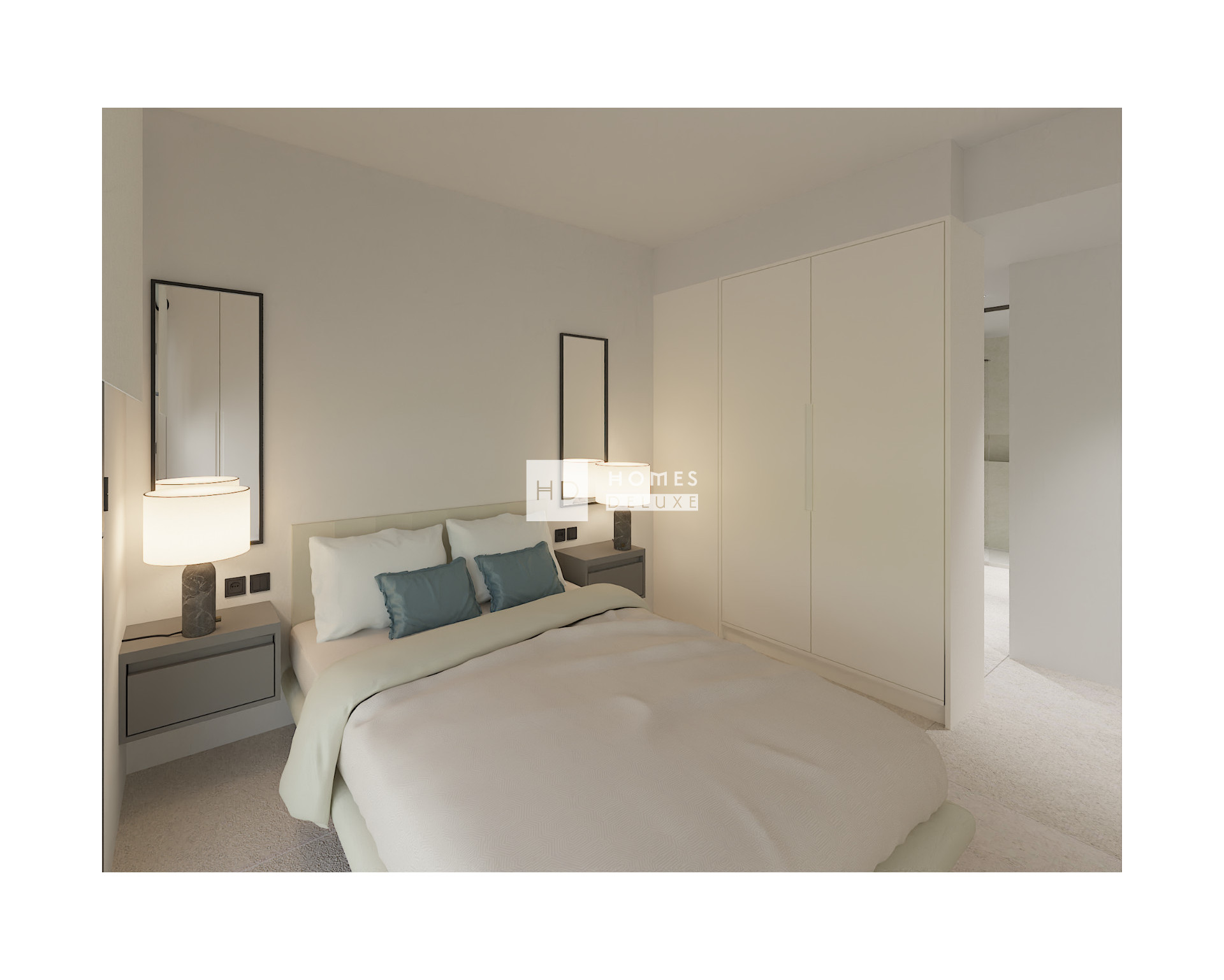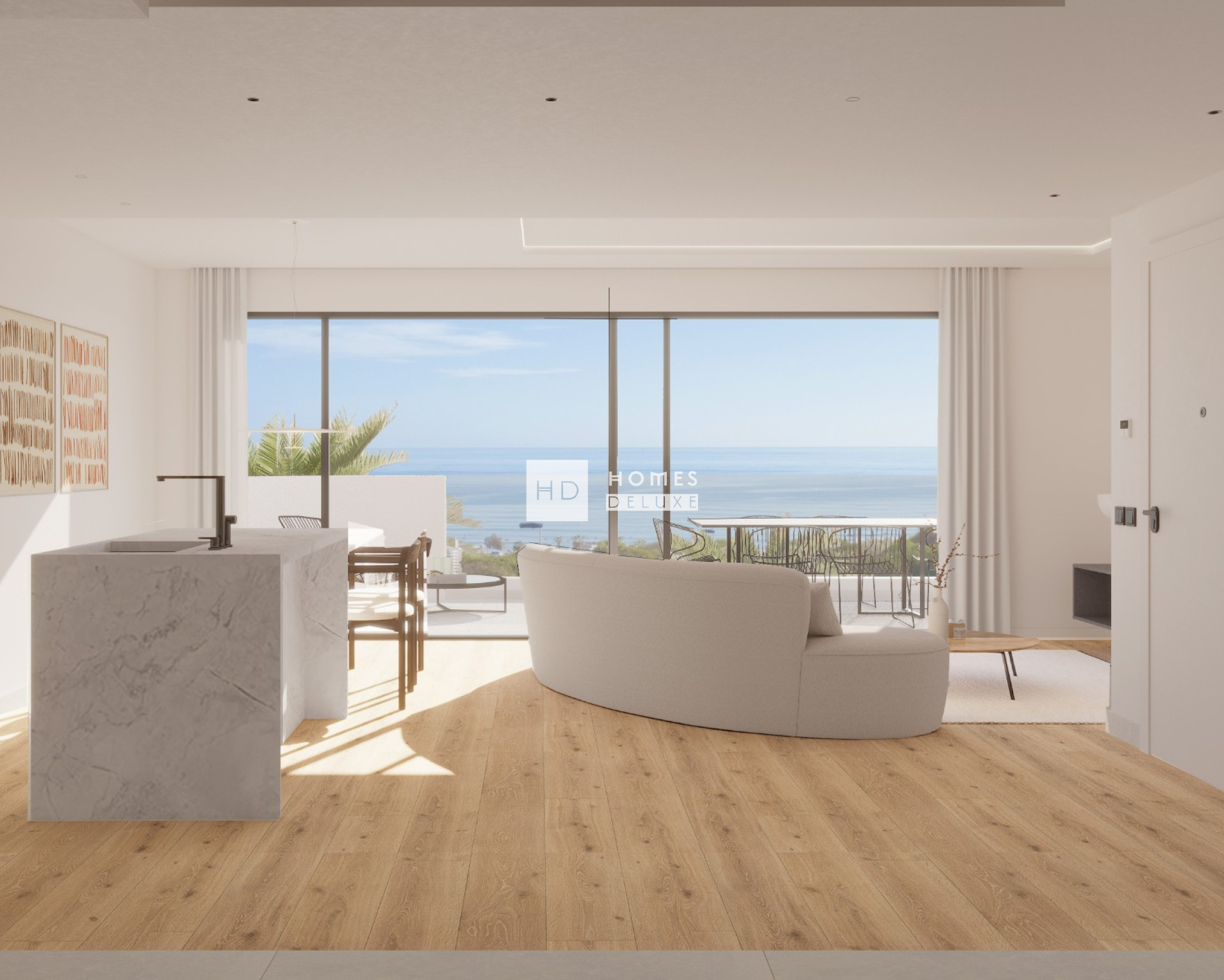 Het interieur bestaat uit een lichte en ruime open lounge en eetkamer met grote ramen die uitkomen op het terras. In de belangrijkste leefruimte bevindt zich een moderne Amerikaanse keuken. De grote hoofdslaapkamer heeft een en-suite badkamer en kleedruimte. Er is nog een ruime tweepersoonsslaapkamer en een aparte gastenbadkamer. De appartementen op de begane grond hebben een halfkelderverdieping met ruimte voor twee extra slaapkamers. De appartementen op de bovenste verdieping hebben flexibele ruimte voor het toevoegen van een logeerkamer of kantoor aan huis. De binnentrap in het pand leidt je naar het uitgebreide solarium op het dak van meer dan 60m2 om de hele dag van de zon te genieten en het prachtige uitzicht op zee te bewonderen.