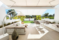 Het interieur is luxueus afgewerkt met apparatuur van topkwaliteit. De indeling bestaat uit een hal die leidt naar de lichte en ruime open woon- en eetkamer met grote ramen die uitkijken op het terras en de tuin. Binnen de belangrijkste leefruimte is een volledig uitgeruste Amerikaanse keuken afgewerkt in wit met een slanke design functie waar de voedselbereiding gebied kan volledig worden afgesloten wanneer niet in gebruik. De grote hoofdslaapkamer heeft een en-suite badkamer met regendouche, inbouwkasten en openslaande deuren naar het hoofdterras. Er zijn nog twee ruime slaapkamers met uitzicht op het groene landschap aan de achterkant van het pand, beide slaapkamers met ingebouwde kasten, en er is een aparte badkamer voor gasten met een regendouche. Het pand is smaakvol ontworpen en ingericht met neutrale tinten, waaronder lichte houtkleurige tegels in het hele appartement die doorlopen naar het terras dat de binnen- en buitenruimtes samenbrengt. De woning wordt volledig gemeubileerd verkocht en is inclusief volledige installatie van airconditioning, vloerverwarming in beide badkamers, domoticasysteem met Domotica, elektrische binnenzonwering en een ondergrondse privéparkeerplaats met berging.