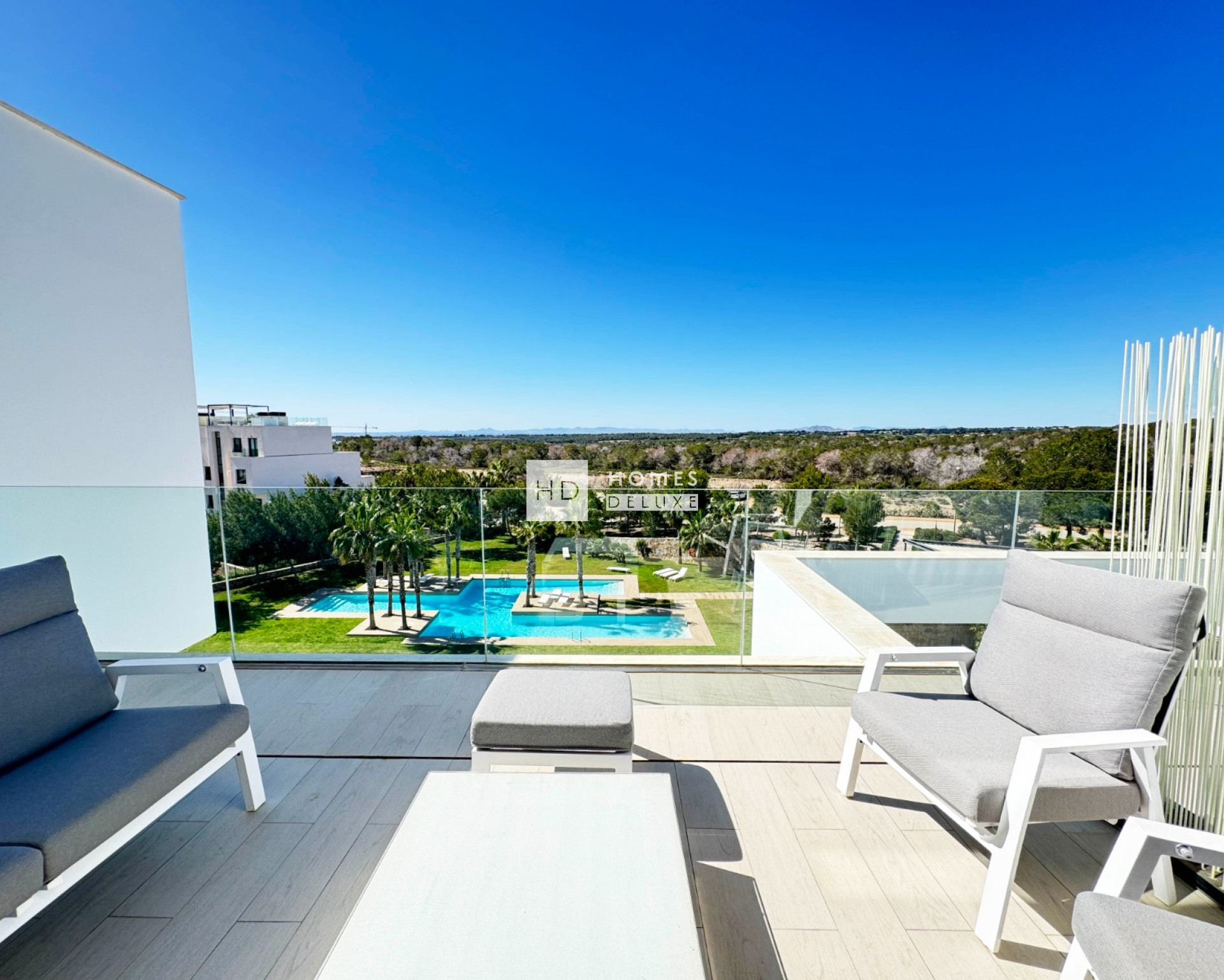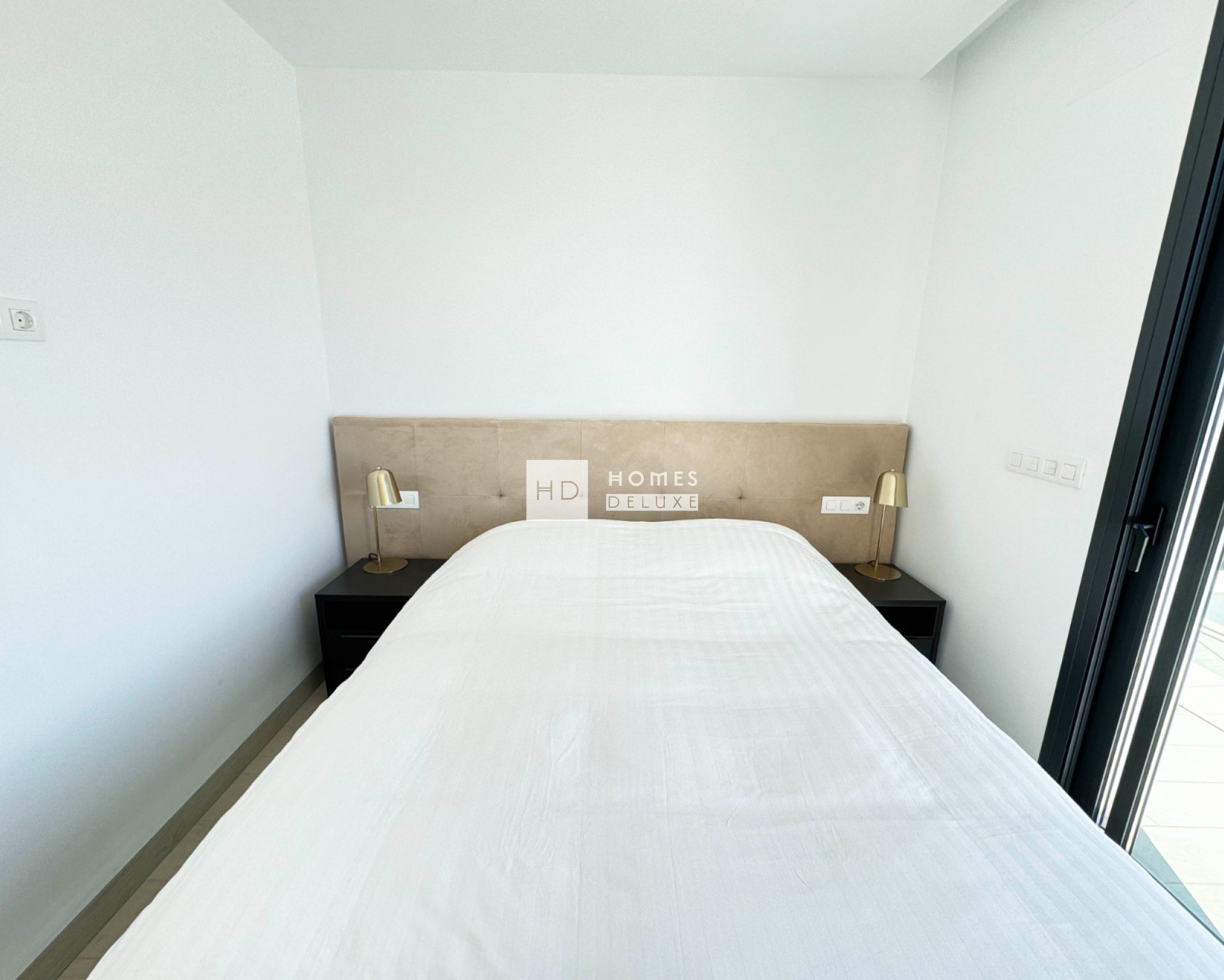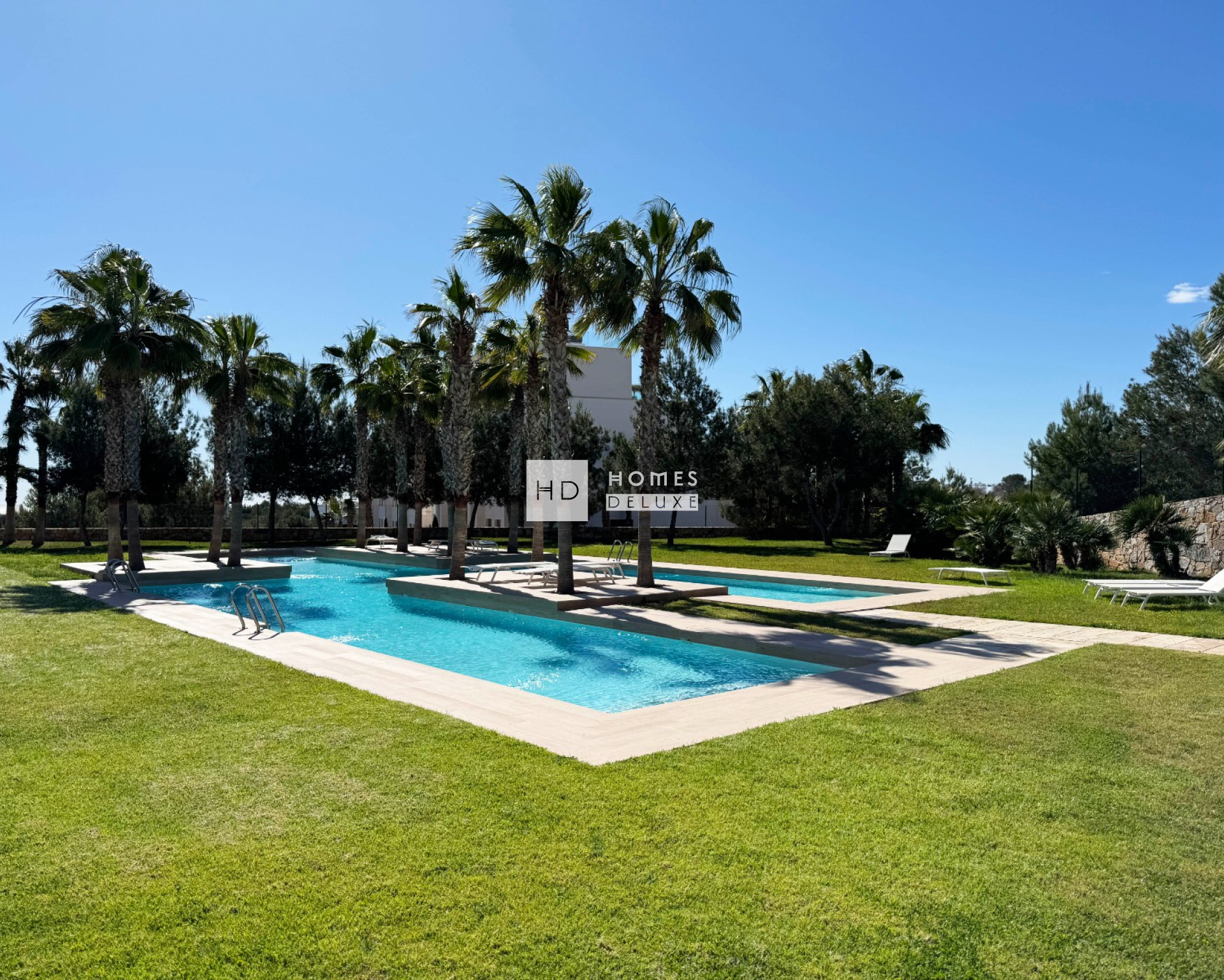 Het interieur is luxueus afgewerkt met apparatuur van topkwaliteit. De indeling bestaat uit een hal die leidt naar de lichte en ruime open lounge en eetkamer met grote dubbele ramen aan weerszijden, waardoor er veel natuurlijk licht door de ruimte stroomt en er toegang is tot het terras. Binnen de belangrijkste leefruimte is een volledig uitgeruste Amerikaanse keuken afgewerkt in een strak design afgewerkt in wit met hoge en lage kasten die extra opslagruimte creëren, en er is een eiland in het midden met een zithoek. De grote hoofdslaapkamer heeft een en-suite badkamer met regendouche, inbouwkasten en openslaande deuren naar het terras. Er zijn nog twee ruime slaapkamers met uitzicht op het groene landschap aan de achterzijde van het pand, beide slaapkamers met ingebouwde kasten, en er is een aparte badkamer voor gasten met een regendouche. Het pand is smaakvol ontworpen en ingericht met een ultramodern thema en neutrale tinten, waaronder lichte houtkleurige tegels in het hele appartement die doorlopen naar het terras dat de binnen- en buitenruimtes samenbrengt. De woning wordt volledig gemeubileerd verkocht en is inclusief volledige installatie van airconditioning, vloerverwarming in beide badkamers, domoticasysteem met Domotica, elektrische binnenzonwering, een eigen ondergrondse parkeergarage en deze woning heeft als extra bonus twee bergruimtes.