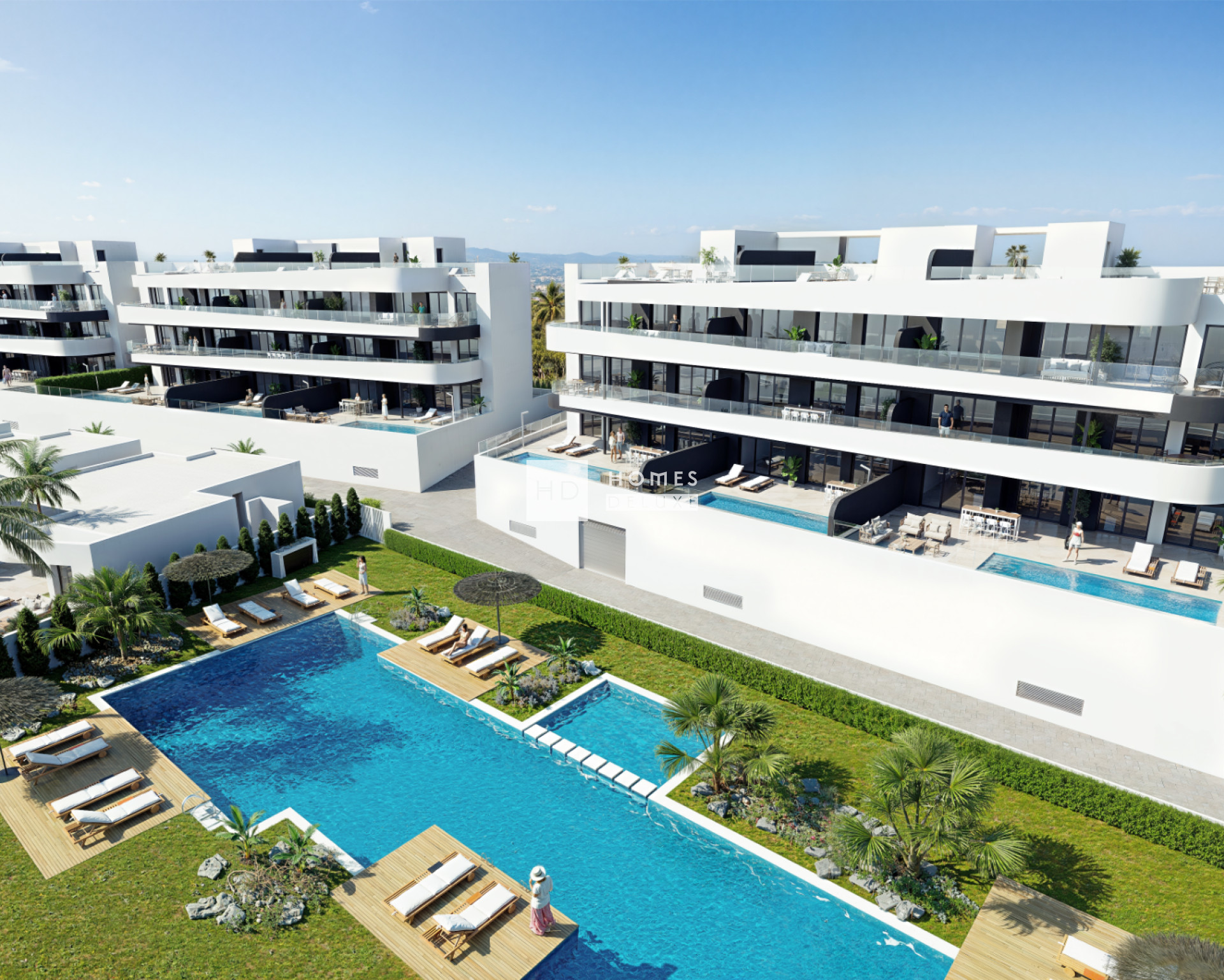 De appartementen onderscheiden zich door hun oriëntatie, privéterrassen, tuinen op de begane grond en panoramisch uitzicht. Ze bestaan uit materialen van hoge kwaliteit en hebben een energiecertificaat "AA". De woningen zijn voorzien van pre-installatie voor airconditioning, keramische kookplaat en afzuigkap in de keuken, ingebouwde kasten in alle slaapkamers, elektrische rolluiken, video-intercomsysteem en een ondergrondse parkeerplaats.