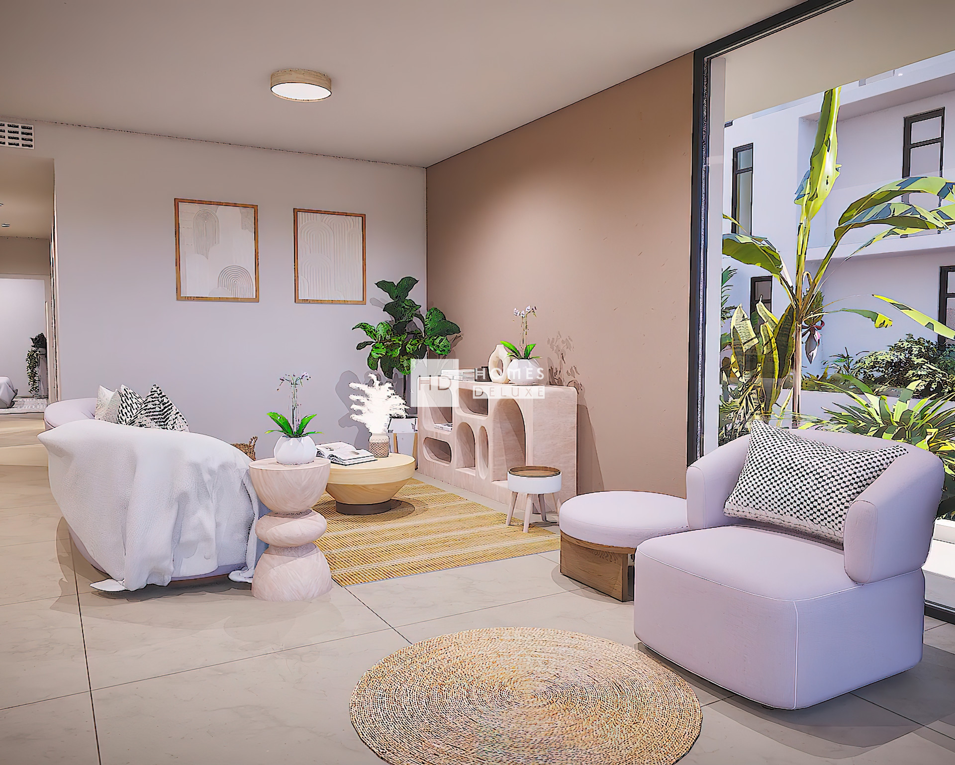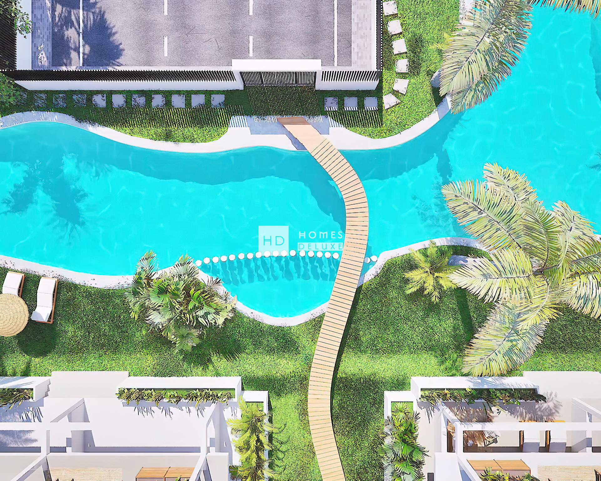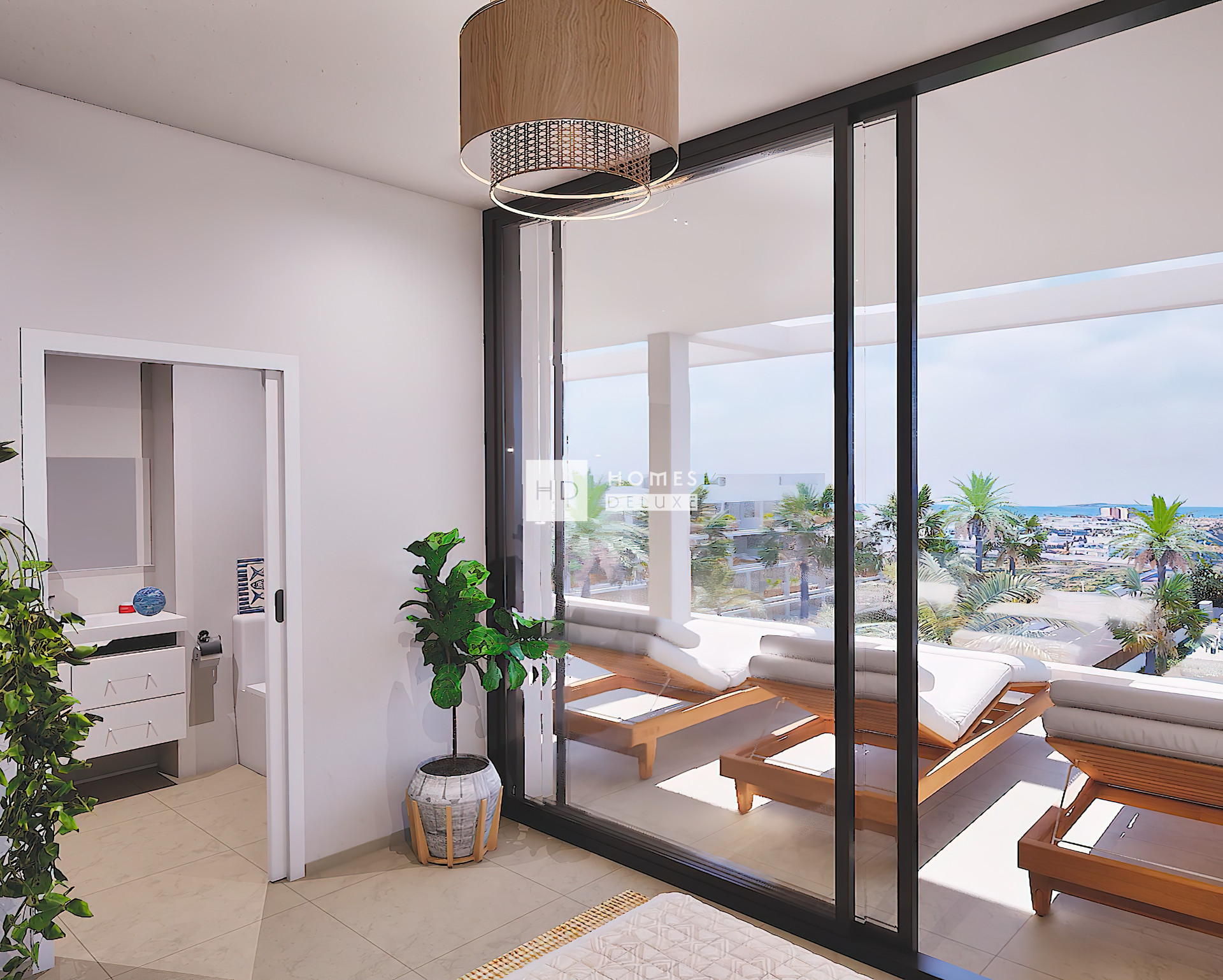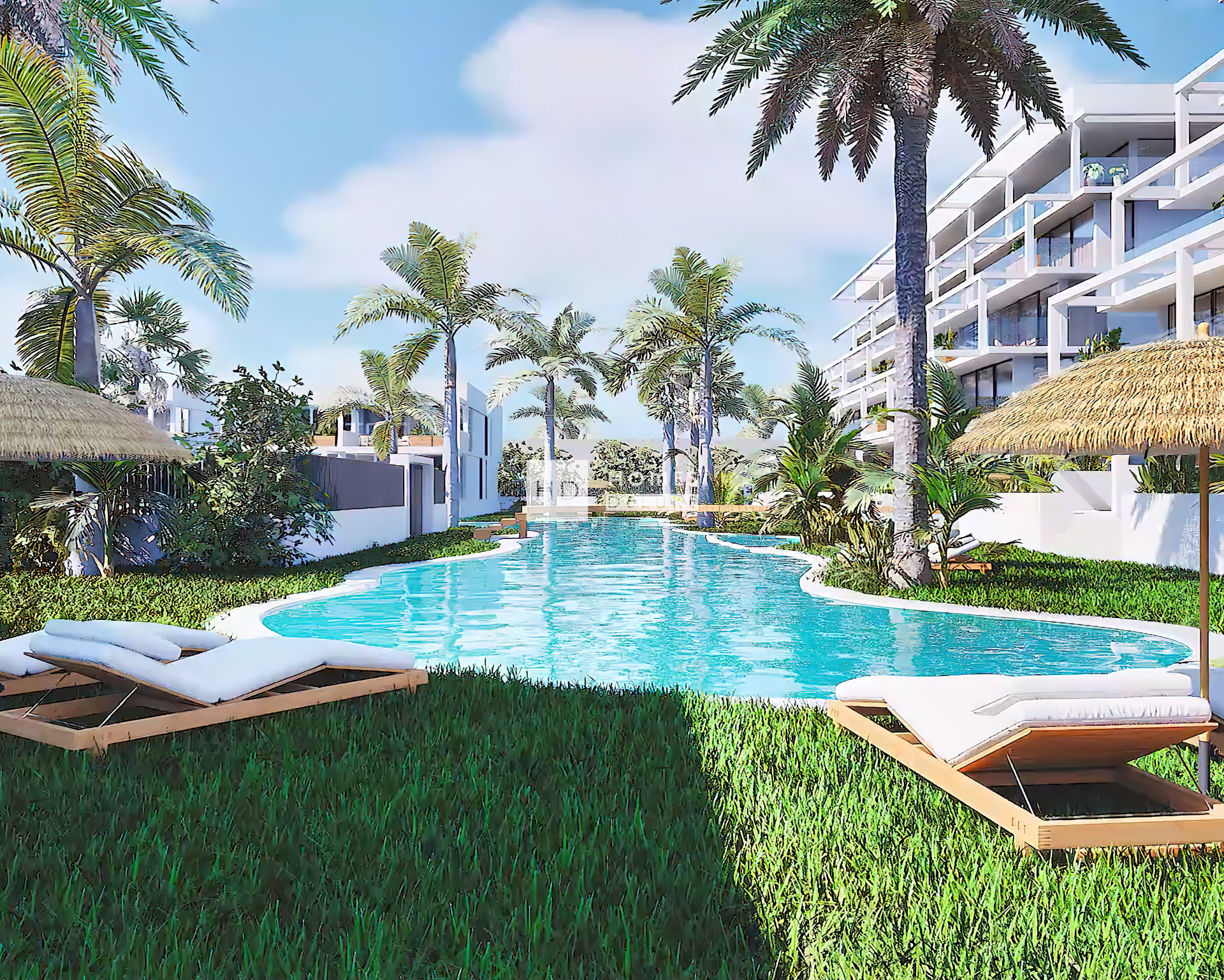 De appartementen zijn ontworpen met open ruimten en eersteklas afwerkingen en beschikken over ruime zonnige terrassen. De penthouse-appartementen hebben een privésolarium op het dak, waardoor je optimaal kunt genieten van het buitenleven in Spanje. De appartementen kijken uit op de prachtig aangelegde tropische tuinen en er is een prachtig lagunezwembad van 800 m2, waar de bewoners kunnen ontspannen en tot rust komen.