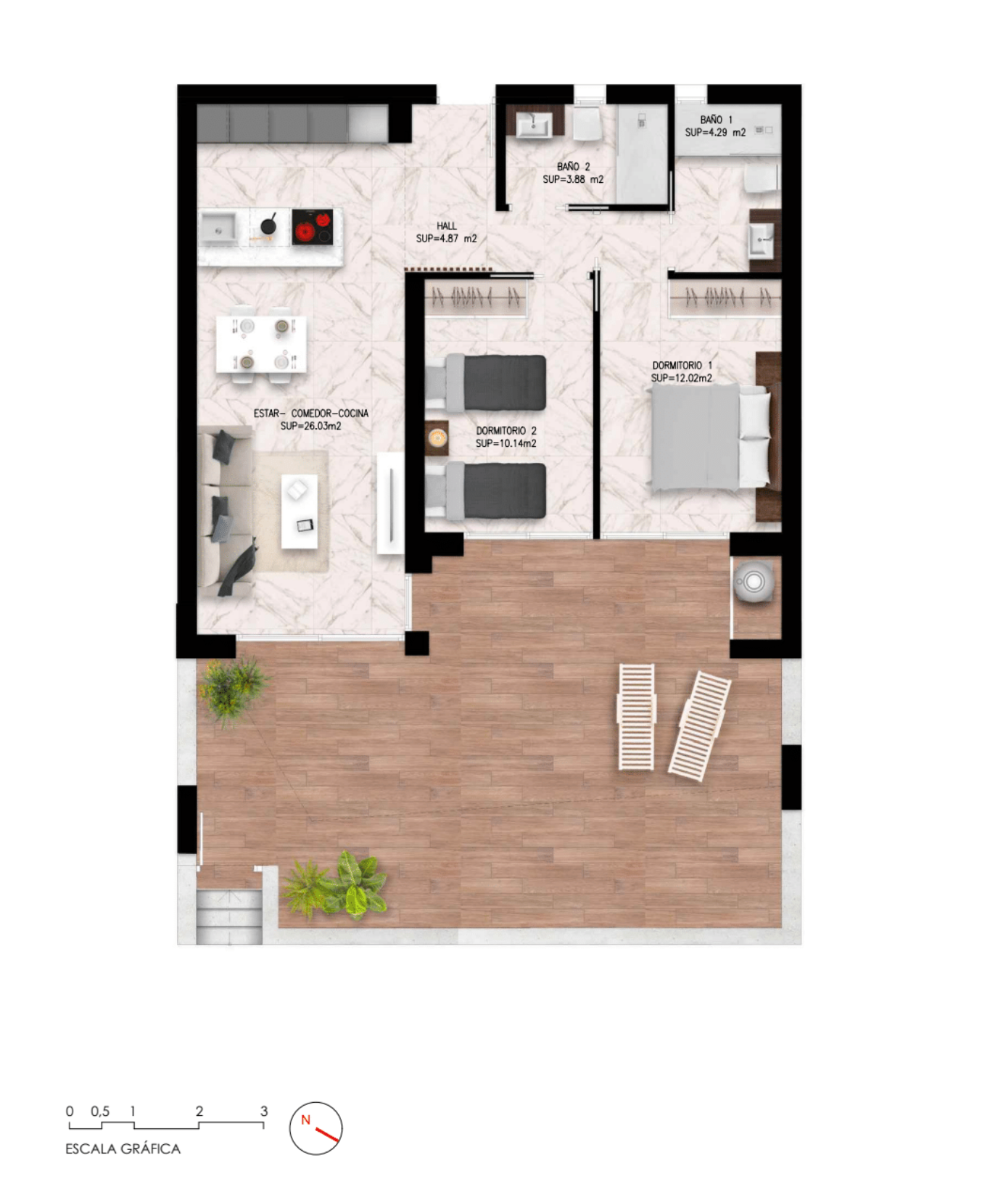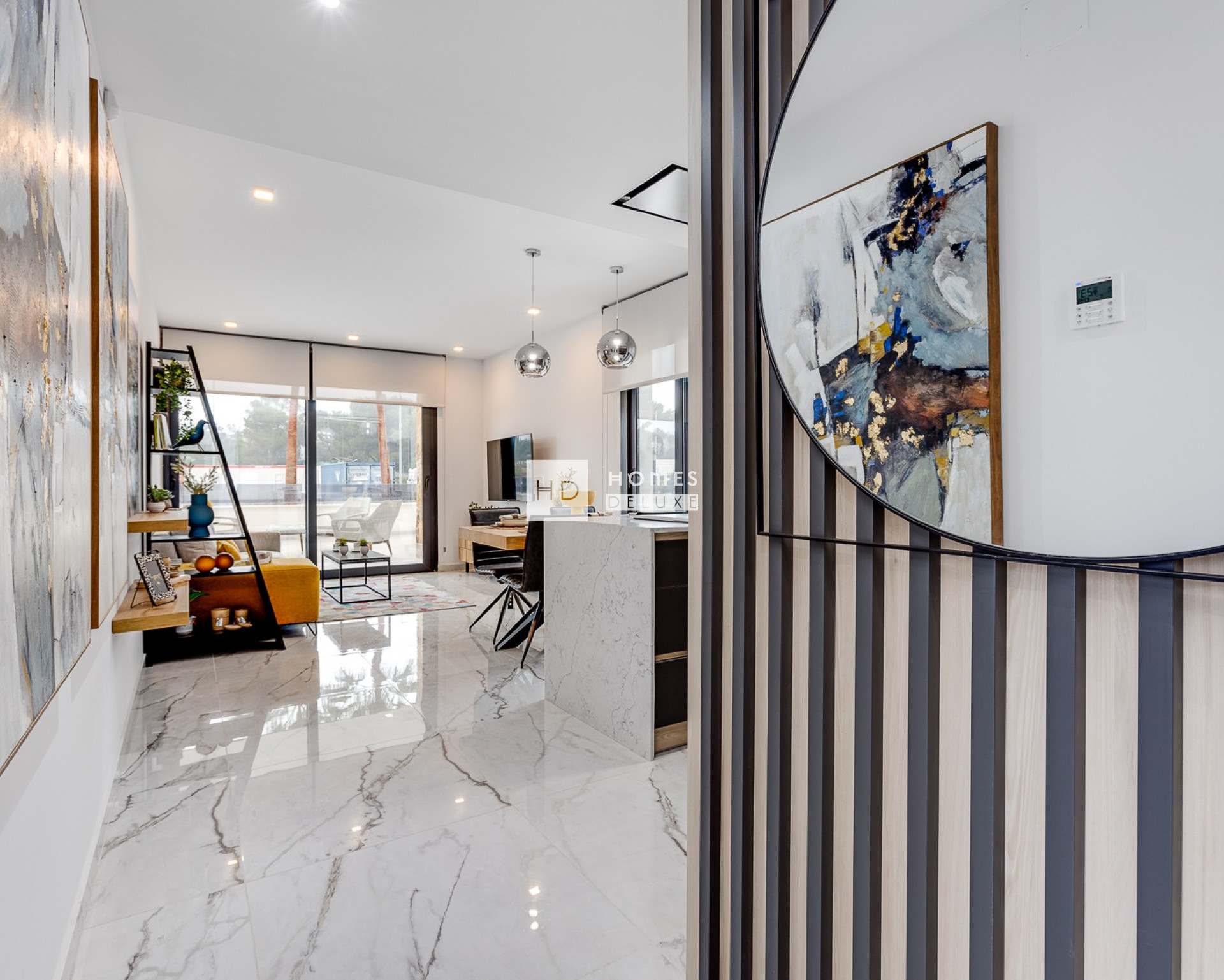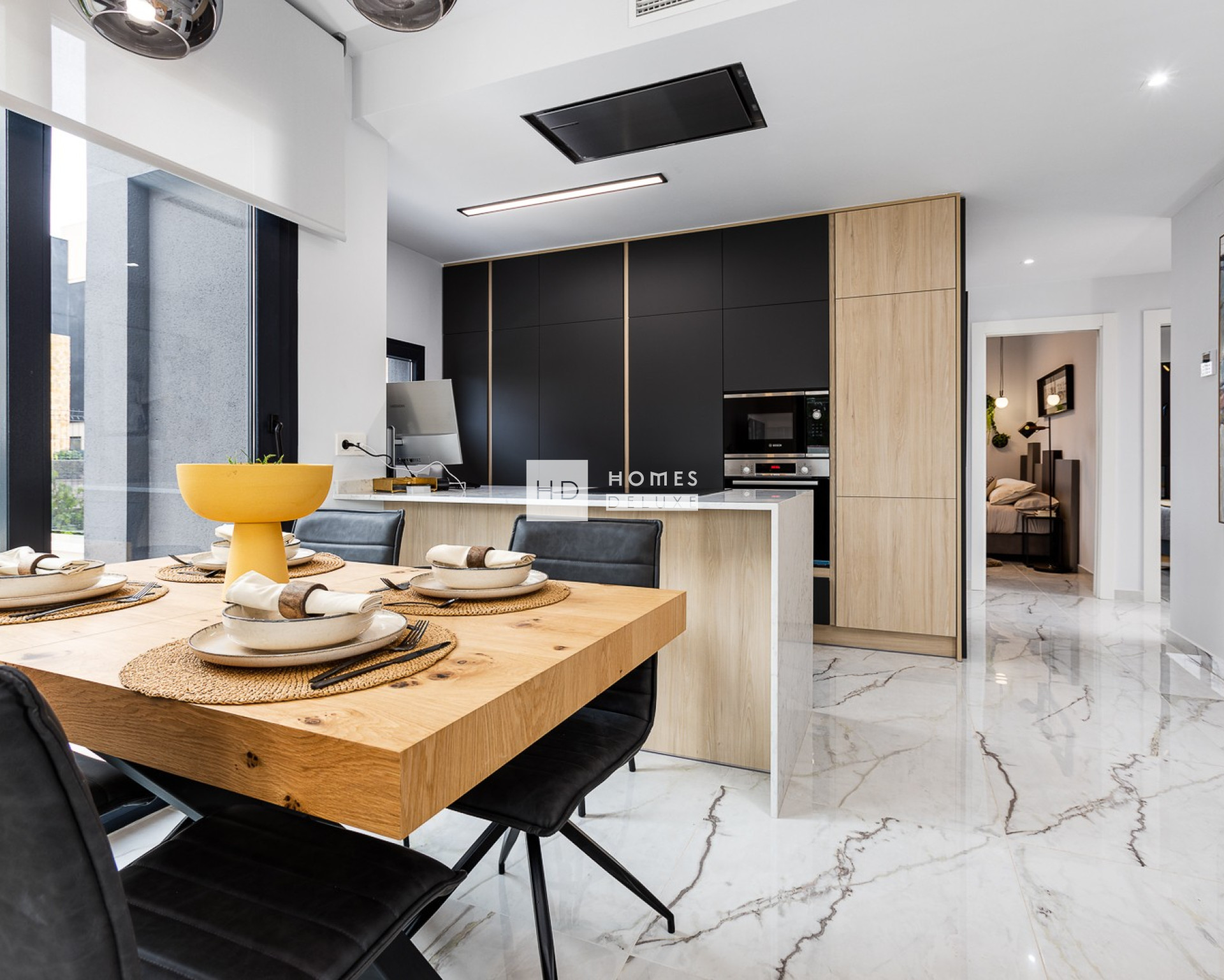 De indeling van het interieur bestaat uit een hal die leidt naar de ruime open woon- en eetkamer met grote ramen die uitkomen op het privéterras. In de woonkamer bevindt zich een volledig ingerichte moderne keuken in Amerikaanse stijl met een kookeiland. De ruime hoofdslaapkamer heeft een en-suite badkamer, er is nog een andere ruime tweepersoonsslaapkamer en een aparte gastenbadkamer. Op het ruime terras kunt u genieten van het buitenleven met plekken om te ontspannen en buiten te eten in het heerlijke Spaanse klimaat. De penthouse-opties breiden de buitenruimte nog verder uit met een buitentrap op het terras die u naar het uitgebreide dakterras leidt.