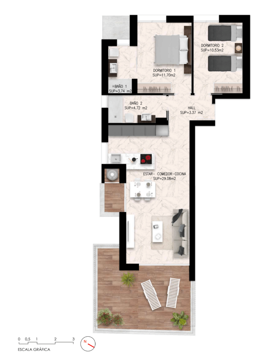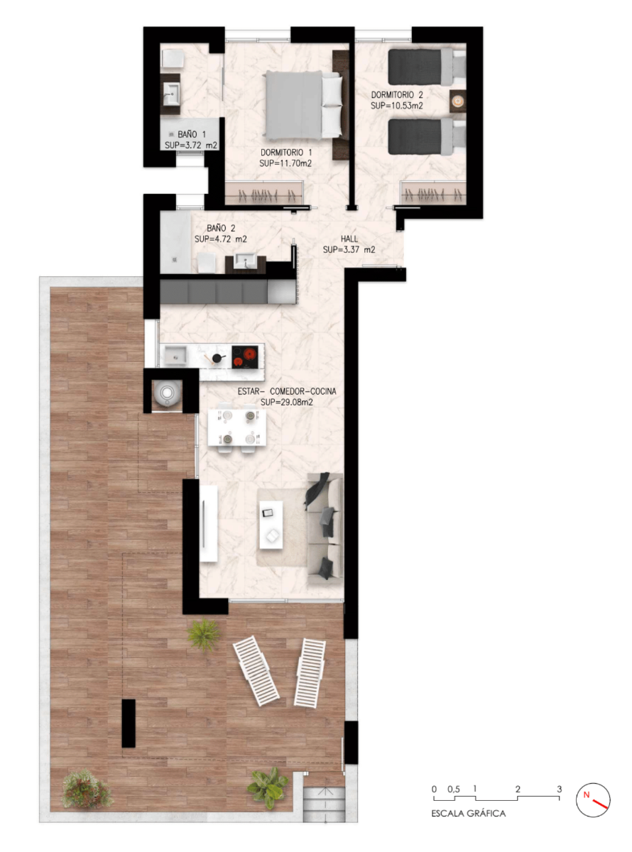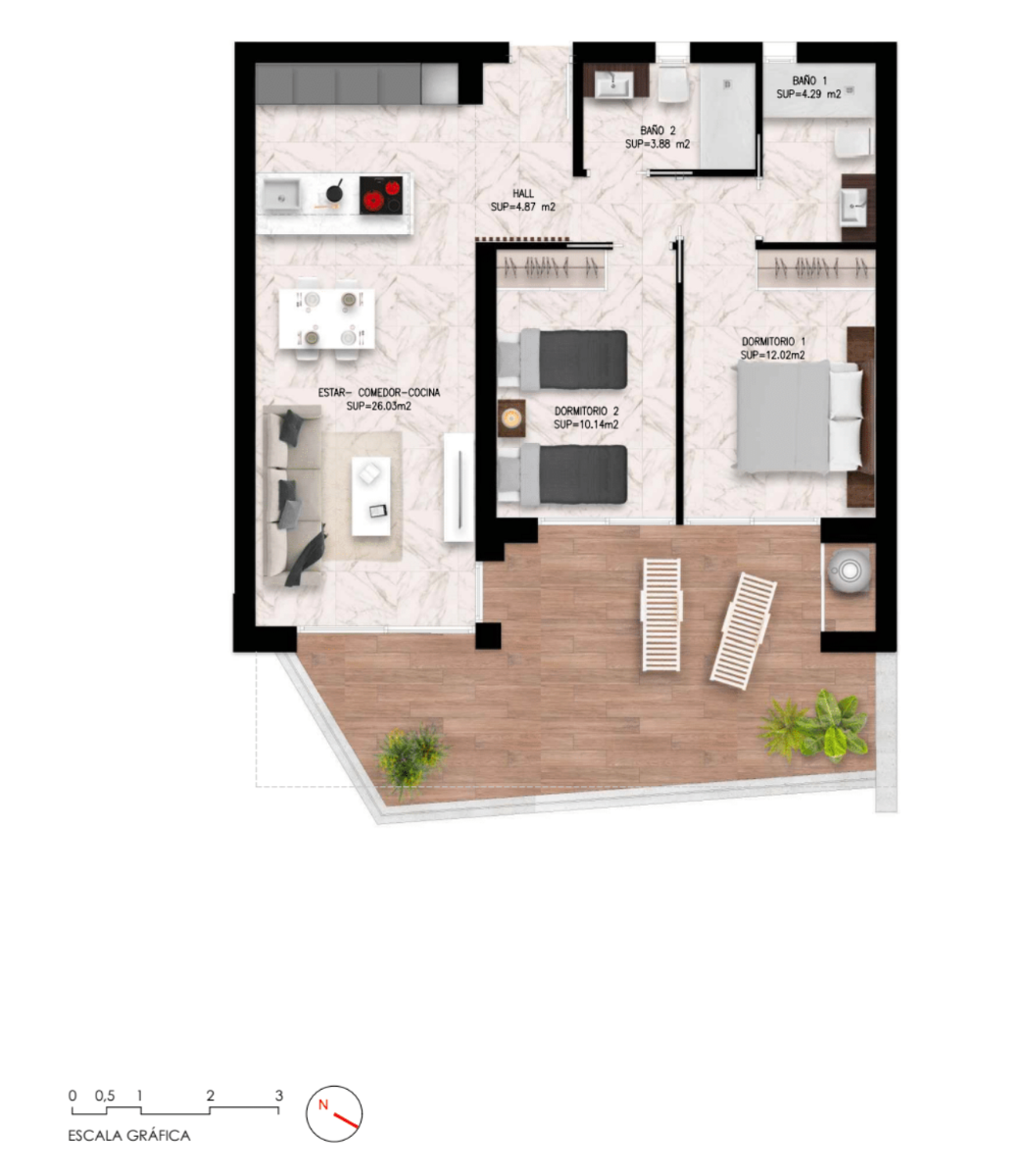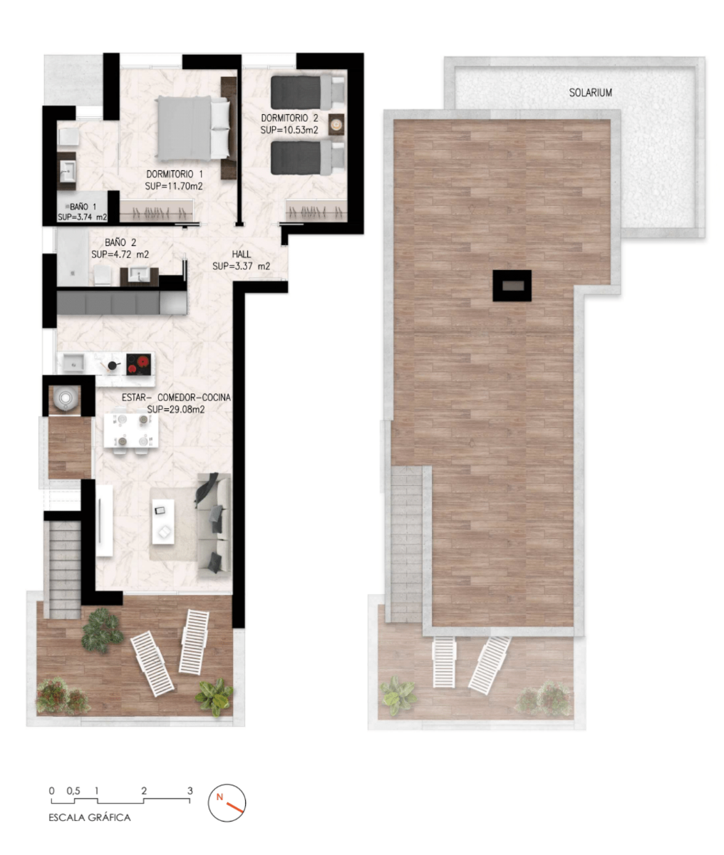 De indeling van het interieur bestaat uit een hal die leidt naar de ruime open woon- en eetkamer met grote ramen die uitkomen op het privéterras. In de woonkamer bevindt zich een volledig ingerichte moderne keuken in Amerikaanse stijl met een kookeiland. De ruime hoofdslaapkamer heeft een en-suite badkamer, er is nog een andere ruime tweepersoonsslaapkamer en een aparte gastenbadkamer. Op het ruime terras kunt u genieten van het buitenleven met plekken om te ontspannen en buiten te eten in het heerlijke Spaanse klimaat. De penthouse-opties breiden de buitenruimte nog verder uit met een buitentrap op het terras die u naar het uitgebreide dakterras leidt.