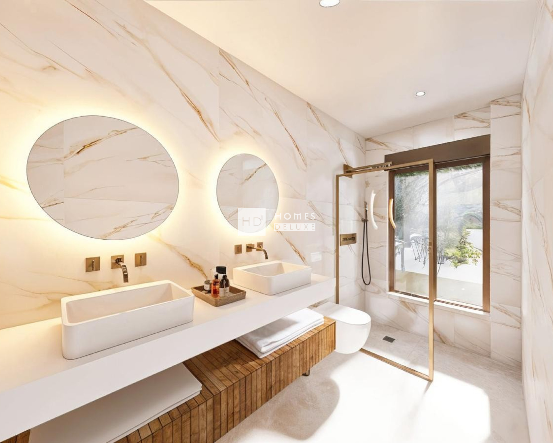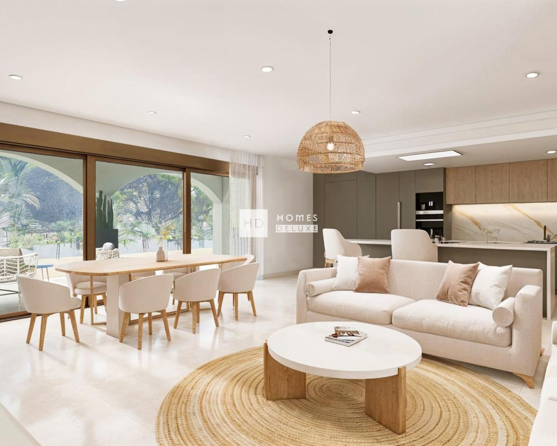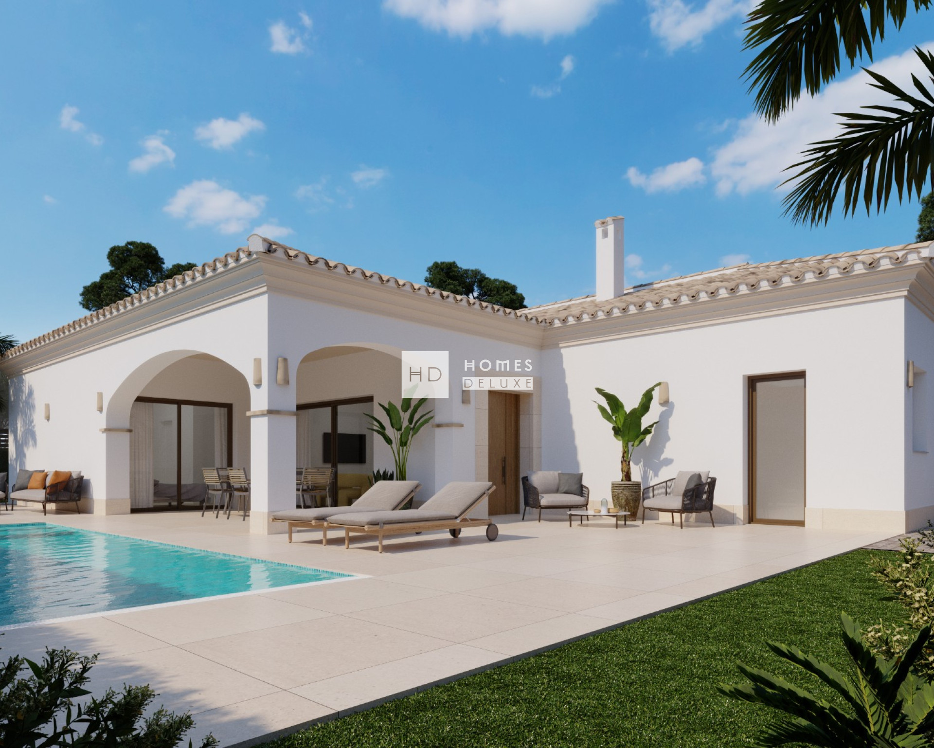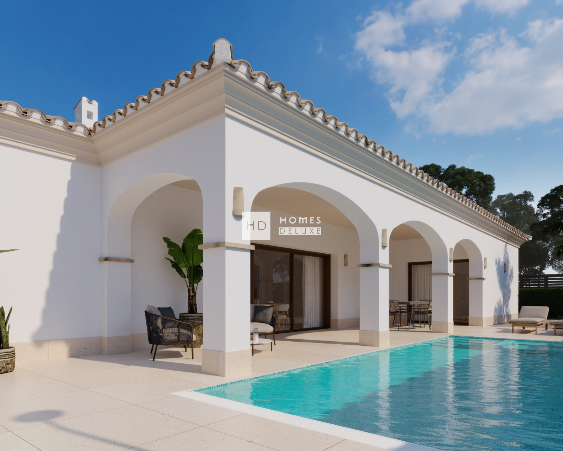 Met een klassieke mediterrane buitenkant en een opvallend modern interieurontwerp bieden deze woningen het beste van twee werelden. De indeling van het interieur bestaat uit een lichte en ruime open woon- en eetkamer die is ontworpen voor maximaal natuurlijk licht, comfort en stijl, met grote ramen die uitkomen op het buitenterras. In de belangrijkste leefruimte bevindt zich een volledig ingerichte Amerikaanse keuken met hoogwaardige voorzieningen en een kookeiland. Een aparte wasruimte en een badkamer aan de buitenkant zorgen voor extra gemak. Aan de andere kant van de villa bevindt zich het slaapgedeelte met 3 grote tweepersoonsslaapkamers, allemaal met een eigen badkamer, die een privétoevluchtsoord vormen voor elk gezinslid.