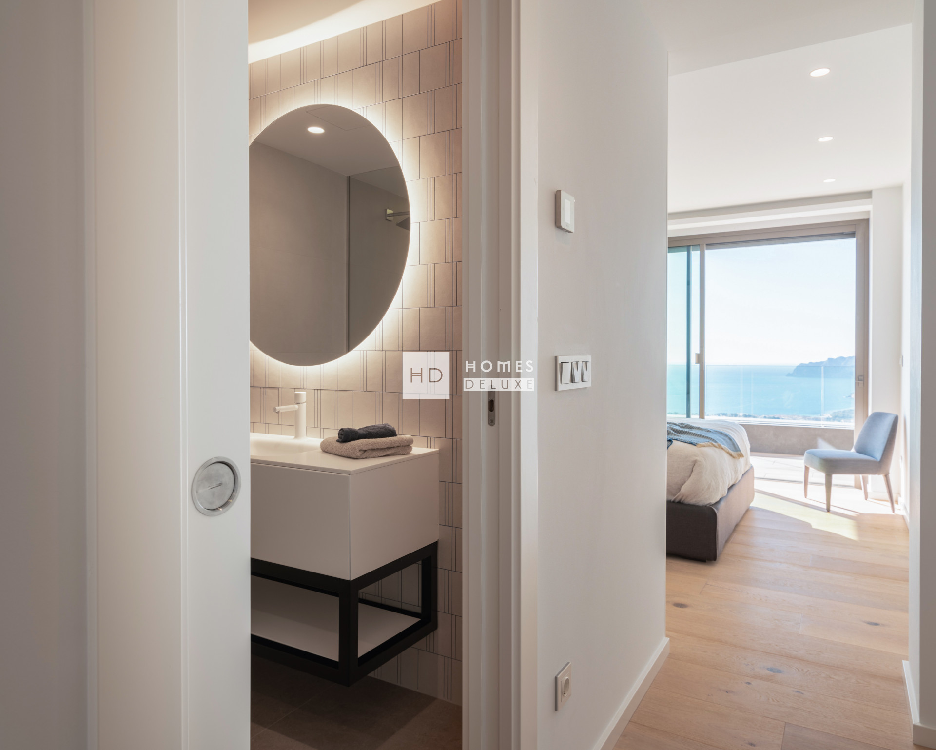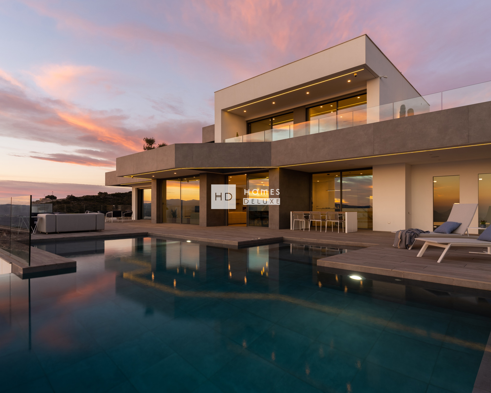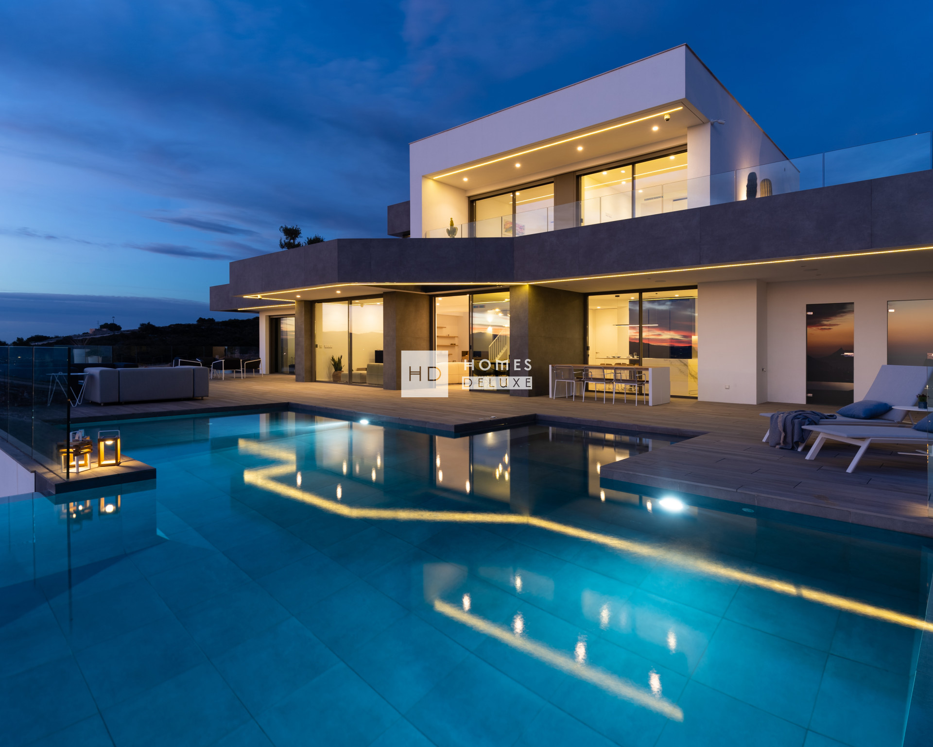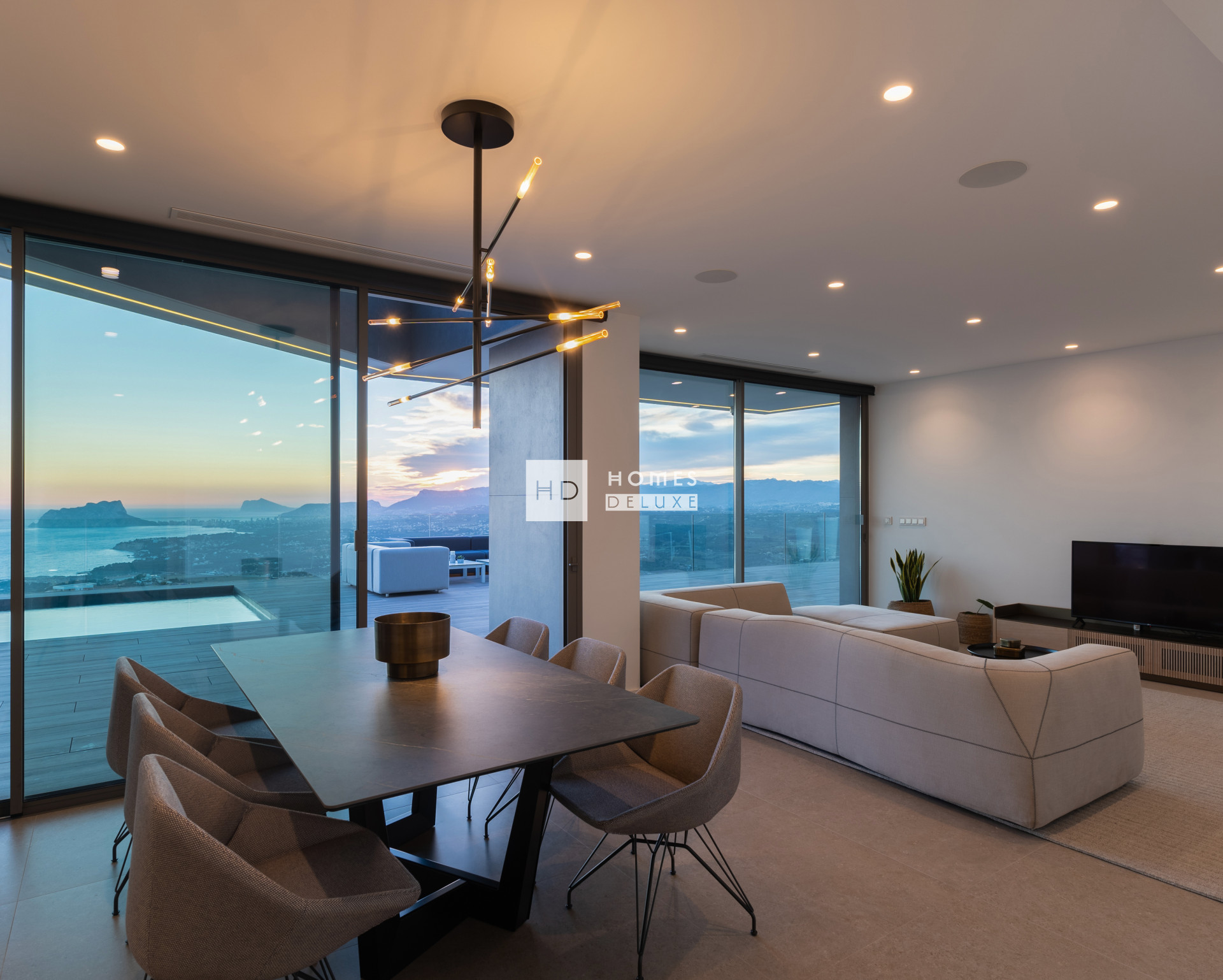 Deze zuidwestelijk georiënteerde woning bevindt zich in Jazmines, de exclusieve zone van het residentiële Cumbre del Sol, vanwaar u kunt genieten van spectaculaire zonsondergangen over de Middellandse Zee. De eigendom is klaar voor bewoning, gedecoreerd en bemeubeld met kwaliteitsvolle meubels van internationale firma's zoals B&B Italia, Lapalma, Punt Viccarbe, Gandia Blasco, Bonaldo, Flos...zowel het meubilair als de verlichting passen bij het niveau van deze luxueuze residentie. De woning staat op een ruim perceel van meer dan duizend vierkante meter en de distributie vloeit harmonisch over in de omgeving. In de ruimtes worden rechte en ronde vormen gecombineerd, die in elkaar overvloeien dankzij natuurlijk licht en een waaier aan neutrale materialen waardoor het geheel aan ruimte wint. Binnen geven het salon, de eetkamer en de keuken vervolgens uit op het terras, waar de horizon deel uitmaakt van het dagelijkse leven. De vier slaapkamers bieden privacy want ze hebben allemaal een en-suite badkamer en ook een privéterras om te genieten van adembenemende uitzichten. De woning is uitgerust met hoog-efficiënte systemen zoals temperatuurregeling met aerothermie, vloerverwarming, ventilatiesystemen met warmteterugwinning, sonos-audio en een domotica systeem waarmee de installaties op afstand kunnen worden bestuurd. De afwerking, van het buitenschrijnwerk tot de bekledingen werden geselecteerd met oog voor kwaliteit, efficiëntie en design tot in de kleinste détails. De verbondenheid met de zee geeft deze woning haar eigenheid. Bij het zwembad, op het terras of waar ook in huis is het landschap altijd aanwezig. De Middellandse Zee, in rust of in beweging, bepaalt het ritme van een leven vol genot.