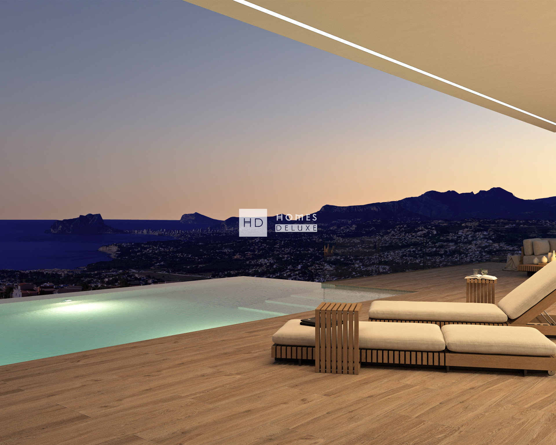 Villa Delfin is een luxueuze nieuw gebouwde residentie op het prestigieuze perceel 137 van het residentiële domein Jazmines, in Cumbre del Sol. Het eigentijdse design, de strakke lijnen en uitkragende delen onderlijnen de spectaculaire naar zee georiënteerde hoogte. Het open uitzicht reikt van de Peñón de Ifach tot aan de horizon. Het belangrijkste van Villa Delfin is ongetwijfeld het grote ruime terras rond de infinity pool met minimalistisch design, waar het onderscheid tussen horizon en zee verdwijnt. Van hieraf krijg je dag en nacht een unieke sfeer met een totaal zicht op de kust van de Middellandse Zee, de skyline van Calpe en de bergen inn het binnenland. De portiek en de verschillende ruimten buiten, onder andere een chill out plek en een eetplaats in open lucht creëren een vlotte doorgang tussen binnen- en buitenkant van de woning. De woning is verdeeld over drie niveaus: Bovenverdieping: op deze verdieping bevindt zich de hoofdingang van de woning. Er zijn ook drie tweepersoons kamers op deze verdieping, allemaal met en-suite badkamer en ingebouwde kasten. De grootste kamer heeft een ruime dressing en een privé terras met zicht op zee. Gelijkvloerse verdieping: hier zijn de leefruimtes, met een grote eetkamer-salon en een open keuken met een centraal kookeiland. Deze ruimte heeft rechtstreeks toegang tot het terras en het zwembad, waardoor de nadruk wordt gelegd op licht en verbinding met het landschap. Op dit niveau is er ook een toilet en een bergplaats naast de keuken. Kelderverdieping: een polivalente ruimte met een bijkomend salon, volledige badkamer en een grote open ruimte, wat ideaal is voor fitness, home cinema, een kantoor of ander gebruik, afhankelijk van je persoonlijke plannen. Aan de achterkant van het perceel heeft Villa Delfin een ingang voor voertuigen en voetgangers, zodat privacy en comfort worden gegarandeerd. Buiten is er een grote parkeerplaats en er is een overdekte garage met automatische poort voor verschillende voertuigen. Vanaf de kelderverdieping kun je met de trap of met een privé lift de gelijkvloerse verdieping en andere niveaus van de woning bereiken. De woning is afgewerkt met materialen van de beste kwaliteit: Vloeren en bekleding met grootformaat porseleinen tegels Keuken uitgerust met ingebouwde elektrische apparatuur van premium merken. Buitenschrijnwerk in aluminium met thermische onderbreking en veiligheidsglas. Ingebouwde LED verlichting en installatie voor domotica systemen. Vloerverwarming en airconditioning met leidingen en klimaatregeling via aerothermie. Aangelegde tuin met mediterrane planten en automatisch sproeisysteem.