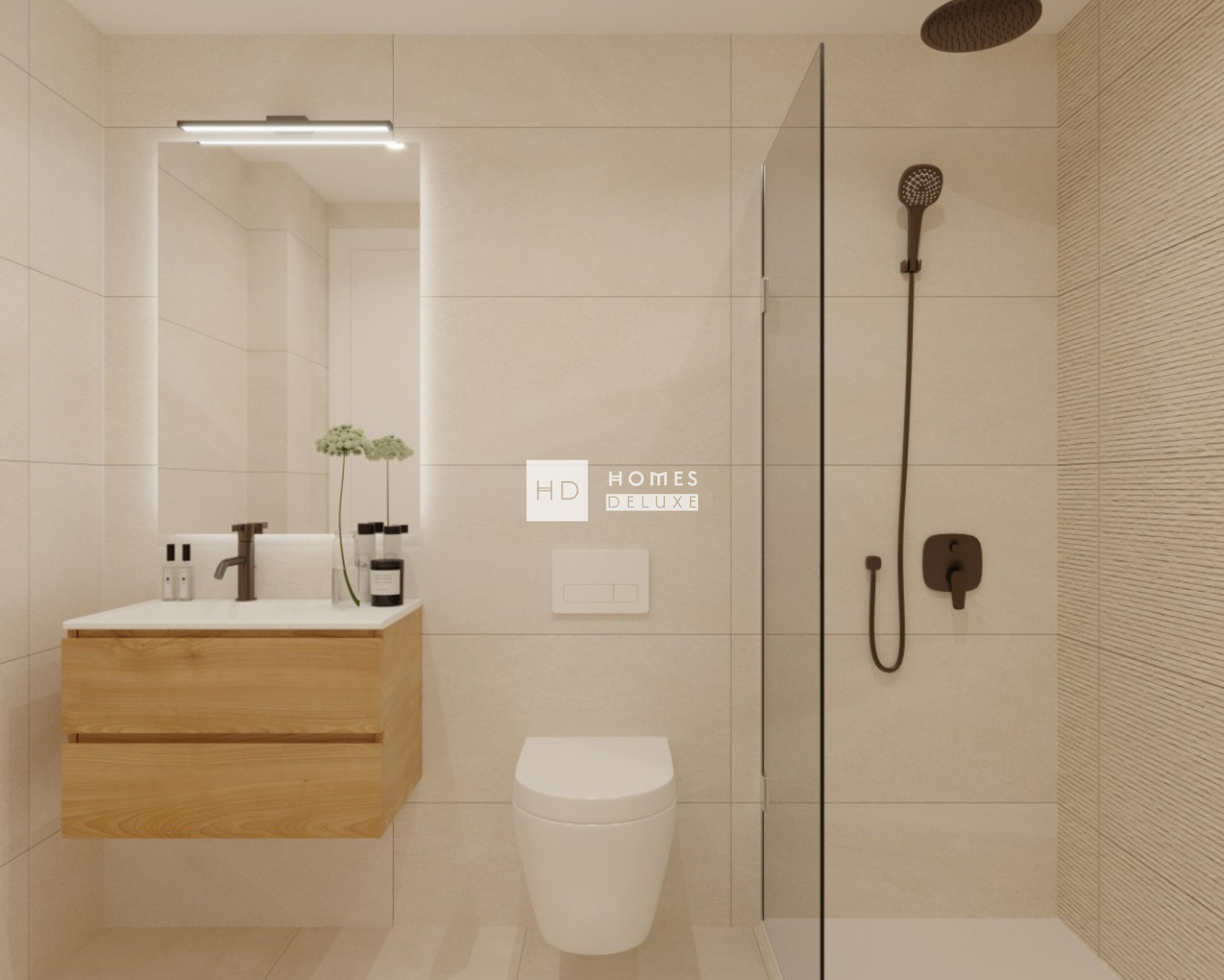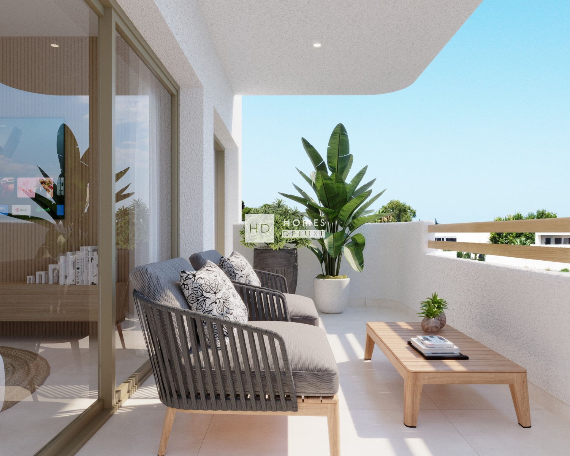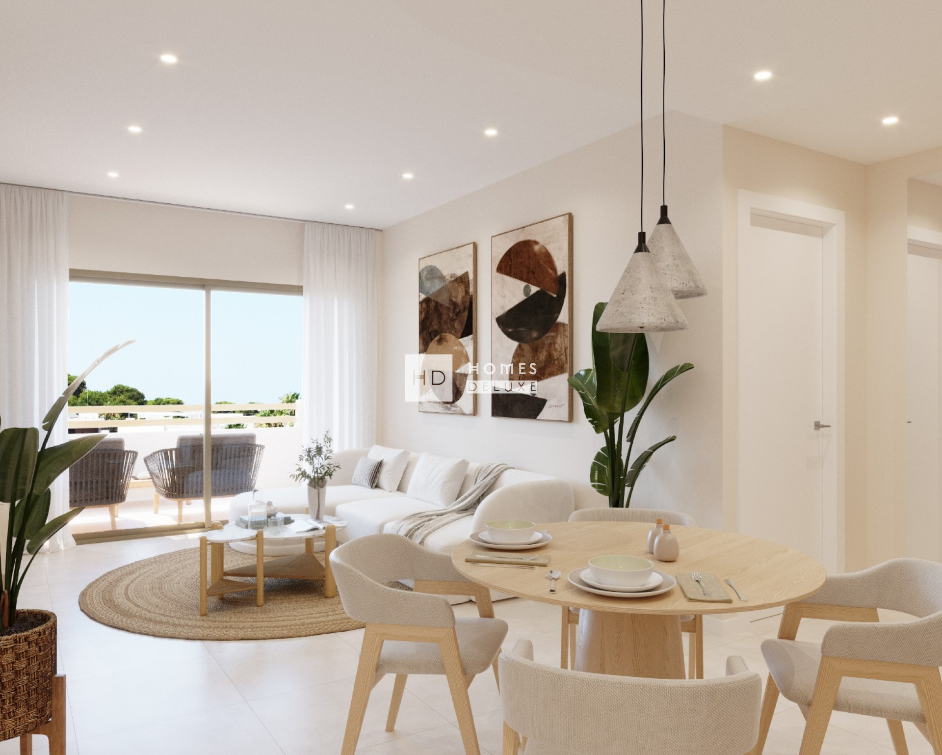 De indeling van het interieur bestaat uit een lichte en ruime open woon- en eetkamer die is ontworpen voor maximaal natuurlijk licht, comfort en stijl, met grote ramen die uitkomen op het buitenterras. In de belangrijkste leefruimte bevindt zich een volledig ingerichte keuken in Amerikaanse stijl met een keuze uit afwerkingen in mat wit, zacht zwart en vicenza eiken. De hoofdslaapkamer heeft een en-suite badkamer en openslaande deuren naar het hoofdterras. Er zijn nog twee ruime tweepersoonsslaapkamers (met openslaande deuren naar het achterterras op de appartementen op de begane grond) en er is een aparte stijlvolle gastenbadkamer. De appartementen op de begane grond hebben een royaal terras aan de voorzijde met een weelderige tuin en een terras aan de achterzijde van het pand. De appartementen op de bovenste verdieping hebben een buitentrap op het terras die leidt naar het uitgebreide dakterras van meer dan 90 m2, dat een prachtig uitzicht biedt.