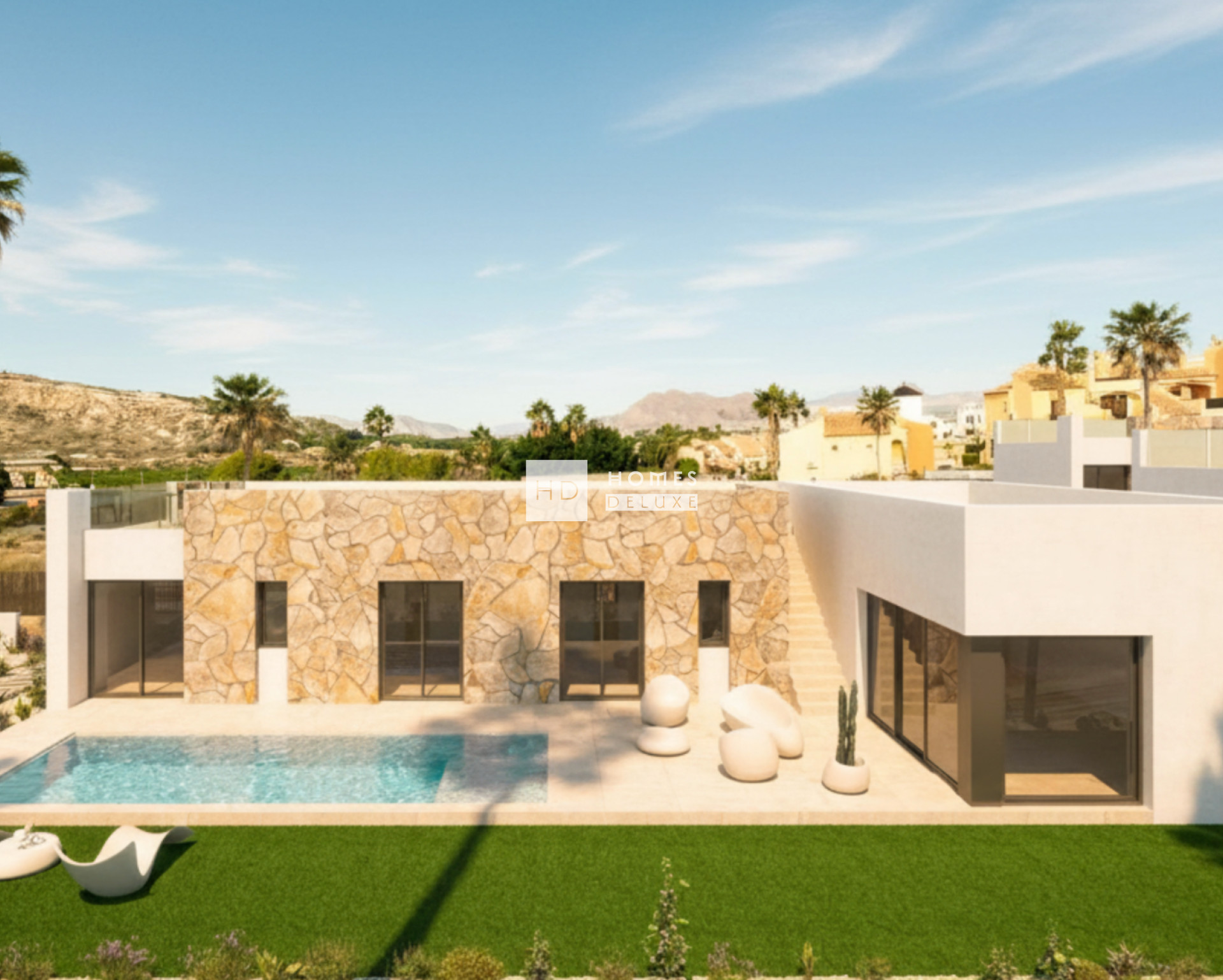 Ontdek dit exclusieve complex van villa's die zijn gebouwd volgens de hoogste normen, met de nieuwste moderne apparatuur en inclusief een privézwembad, parkeerplaats en aangelegde tuin. Vrijstaande villa's, allemaal gelijkvloers, met 3 slaapkamers en 2 badkamers, ontworpen om te genieten van een natuurlijke en bevoorrechte omgeving. Het ontwerp combineert moderne lijnen met traditionele elementen, zoals steen op de gevel, wat de warmte van traditionele bouw toevoegt. De woningen halen het meeste uit het buitenleven in Spanje met een grote privétuin en terras met als middelpunt het privézwembad van 8 x 3 m. De buitenruimte wordt verder uitgebreid door het ruime dakterras van 61 m2.