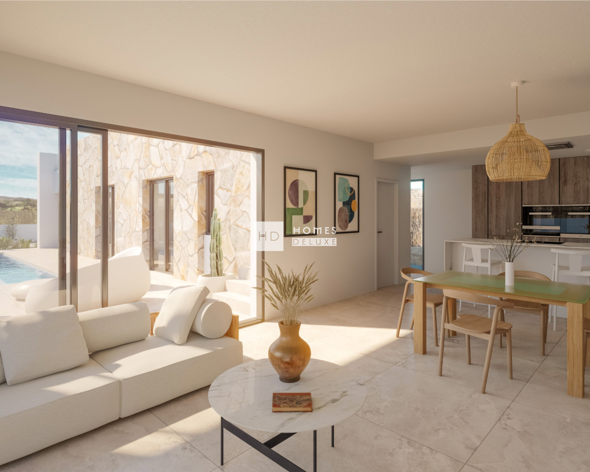 De open indeling van de woningen maximaliseert het gebruik van natuurlijk zonlicht gedurende de dag en verhoogt de privacy en dwarsventilatie. De indeling van het interieur bestaat uit een lichte en ruime woon- en eetkamer die perfect harmonieert met de volledig ingerichte moderne keuken in Amerikaanse stijl. De grote ramen in de woonkamer kijken uit op het buitenterras en het privézwembad. Aan de andere kant van de villa bevindt zich de ruime hoofdslaapkamer met een en-suite badkamer. Daarnaast zijn er nog twee tweepersoonsslaapkamers, allemaal met openslaande deuren naar het hoofdterras, en een aparte gastenbadkamer. Een buitentrap vanaf het hoofdterras leidt u naar het solarium op het dak, waar u de hele dag van de zon kunt genieten en het uitzicht op de golfbaan, de bergen en de omgeving kunt bewonderen.