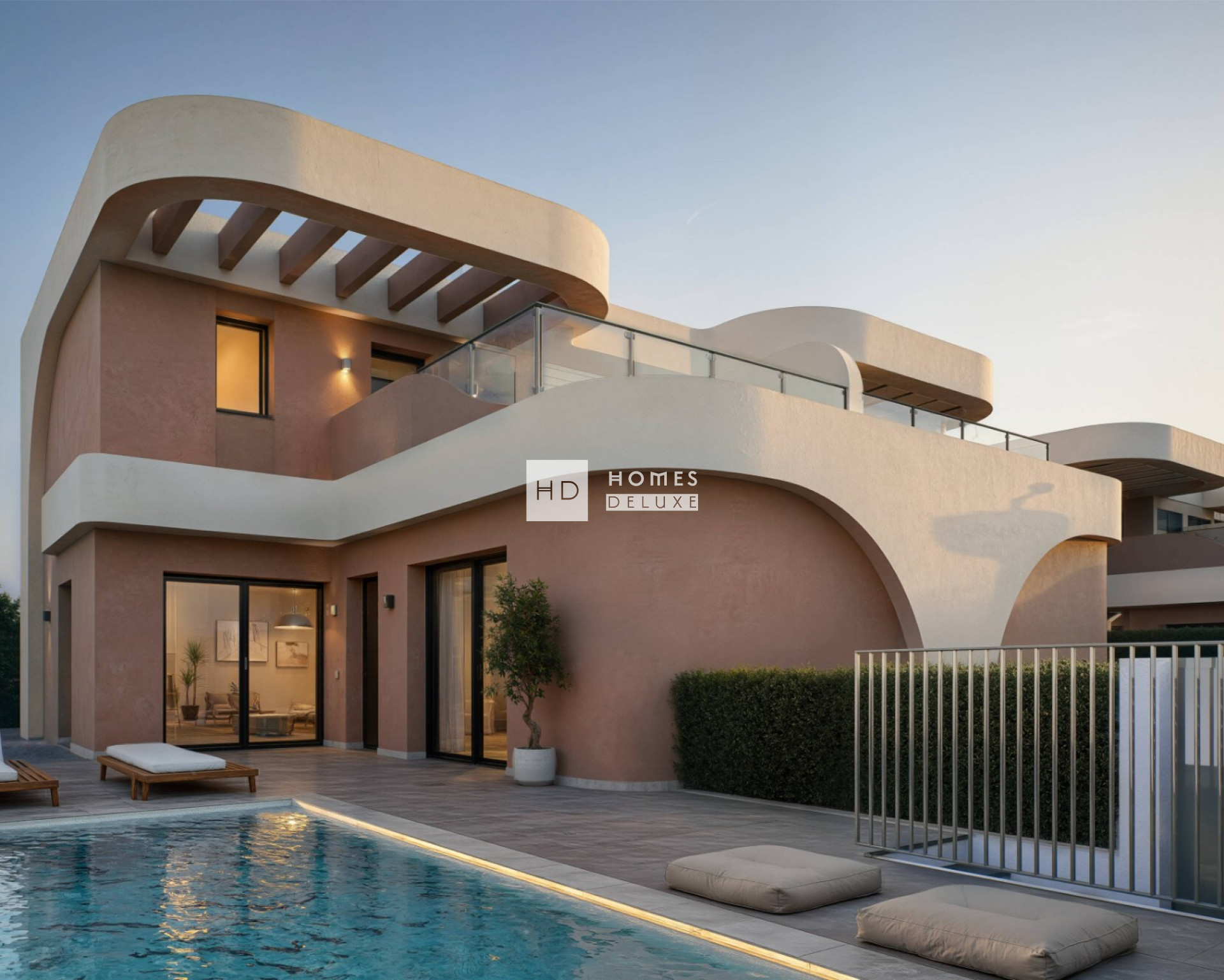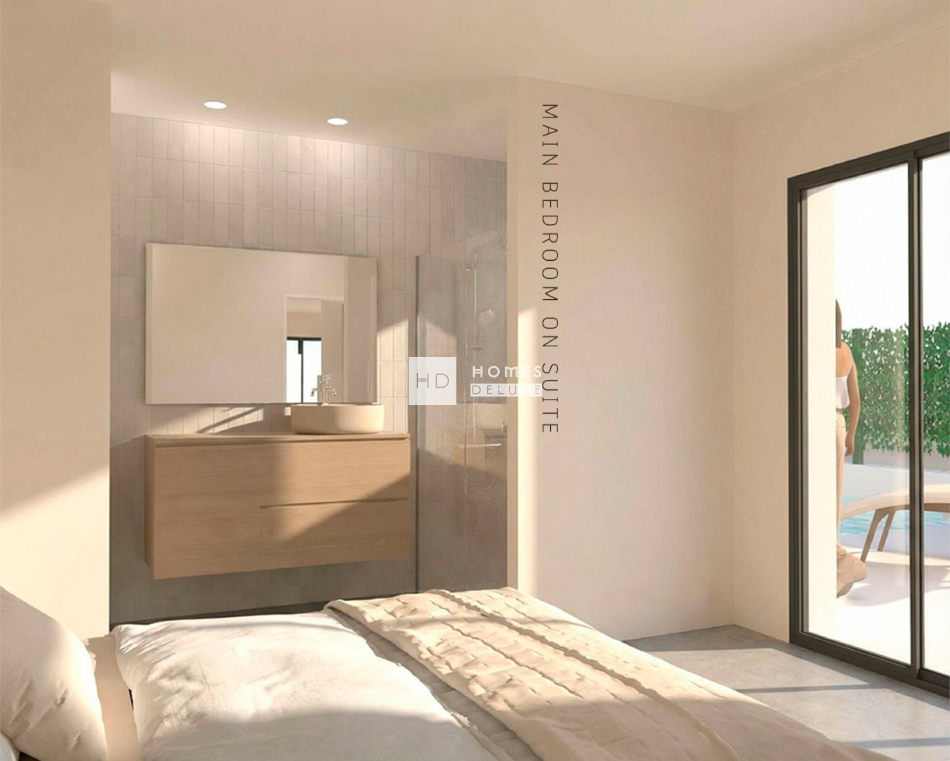 De villa's hebben twee verdiepingen en het interieur is prachtig afgewerkt in neutrale en eigentijdse tinten. De indeling bestaat uit een ruime open woon- en eetkamer met grote ramen die veel natuurlijk licht binnenlaten en uitkomen op het terras en de tuin. Bij de woonkamer hoort een stijlvolle, moderne keuken in Amerikaanse stijl met een toegangsdeur naar de achterkant van het pand, en er is een gastentoilet. Op de begane grond bevindt zich ook de indrukwekkende hoofdslaapkamer met een grote slaapkamer, een en-suite badkamer en een inloopkast/kleedruimte. De hoofdslaapkamer heeft openslaande deuren naar het grote terras. De binnentrap leidt u naar de eerste verdieping met nog twee ruime tweepersoonsslaapkamers en een familiebadkamer. De hal op de eerste verdieping heeft een deur naar het 19 m² grote zonneterras met een pergola.