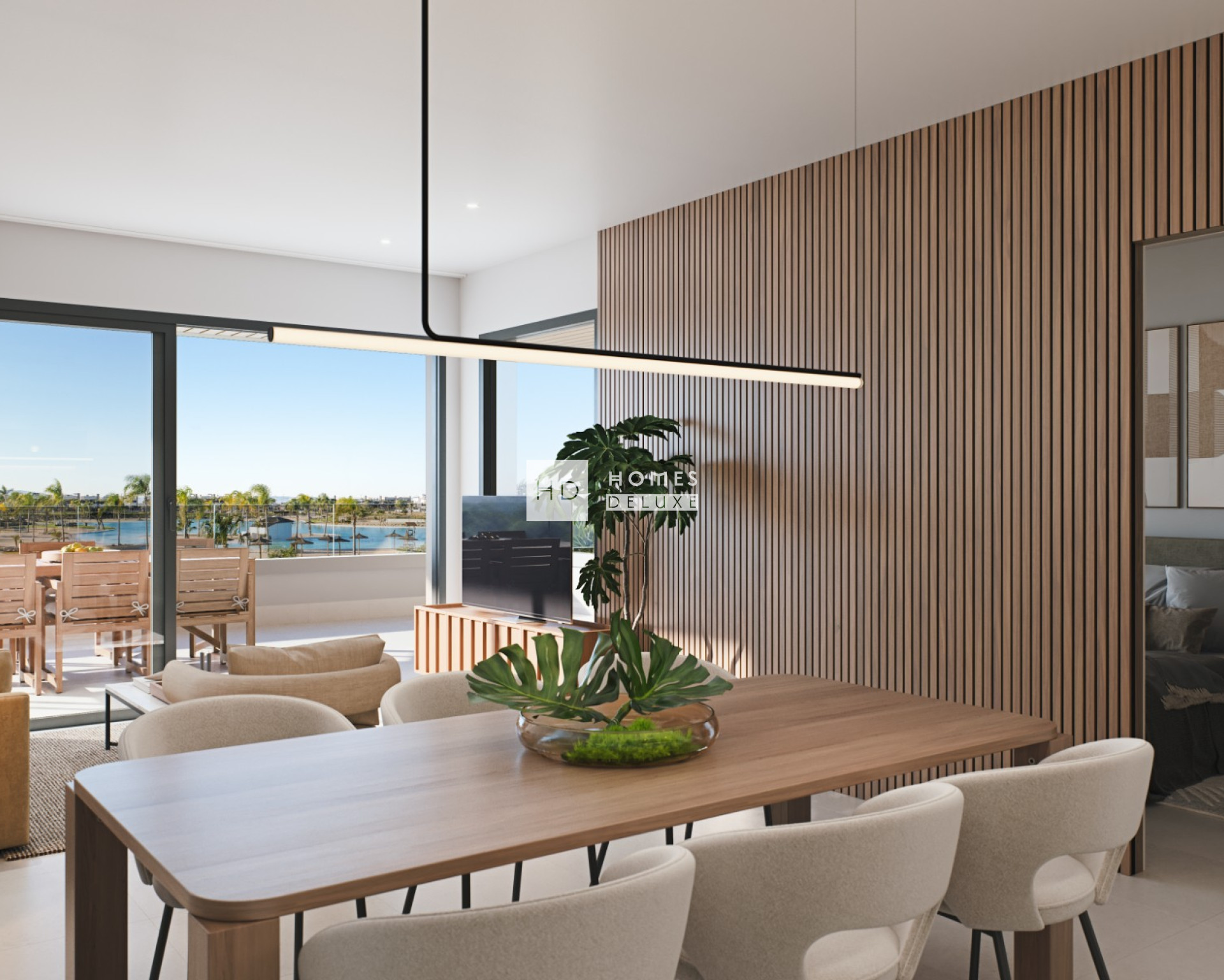 De indeling van het interieur bestaat uit een hal die leidt naar de ruime open woonkamer met een lichte zit- en eethoek met grote ramen die uitkomen op het terras. In de woonkamer bevindt zich een volledig ingerichte Amerikaanse keuken met veel opbergruimte en een kookeiland. De indrukwekkende hoofdslaapkamer heeft een en-suite badkamer en een kleedruimte. Er is nog een ruime tweepersoonsslaapkamer en een aparte gastenbadkamer. De penthouses hebben een binnen- of buitentrap die leidt naar het uitgebreide dakterras van 64 m² (2 slaapkamers) of 75 m² (3 slaapkamers) om de hele dag van de zon te genieten. De dakterrassen bieden een prachtig vrij uitzicht en maken optimaal gebruik van het buitenleven met een privézwembad en een grote chill-outruimte met een zomerkeuken.