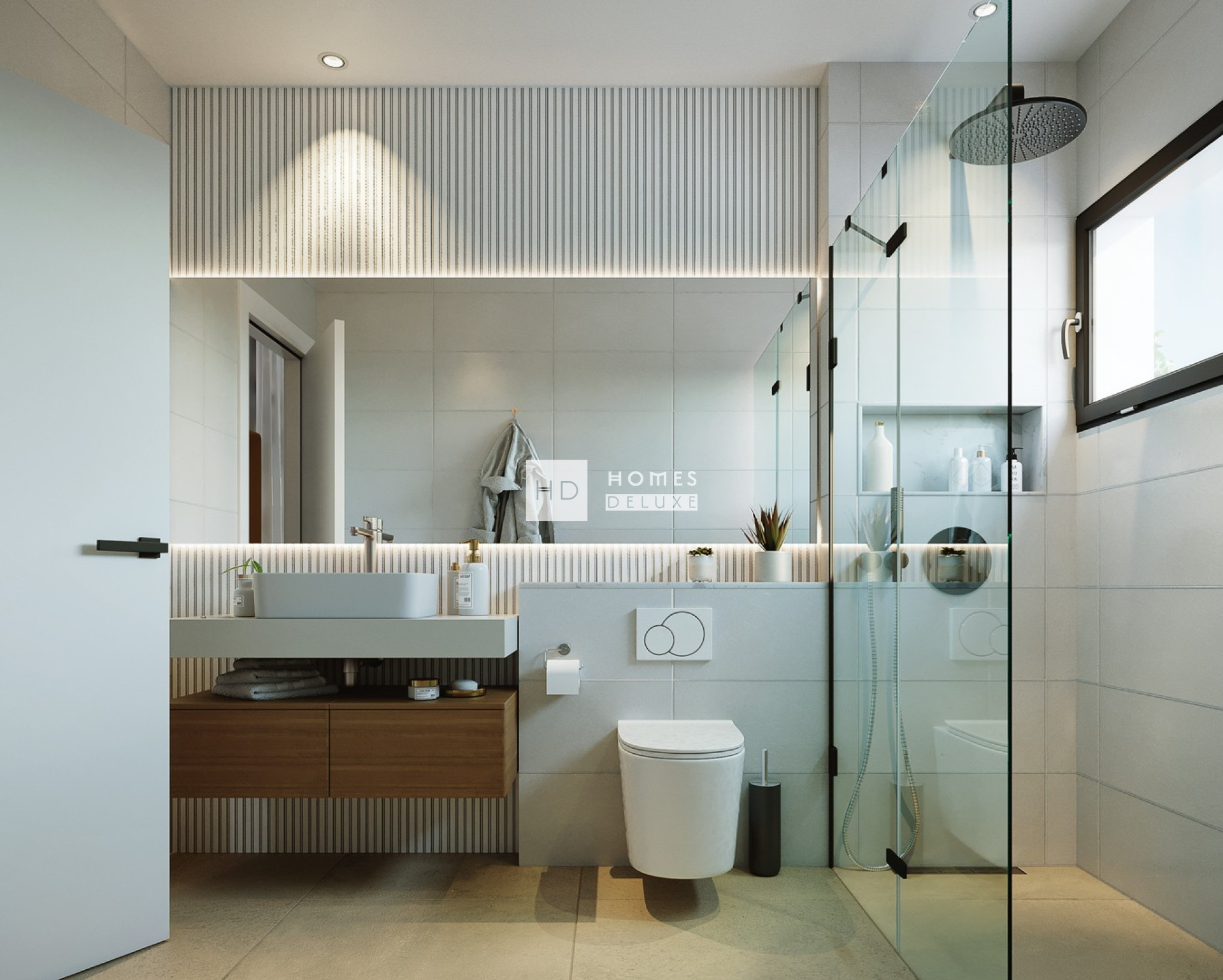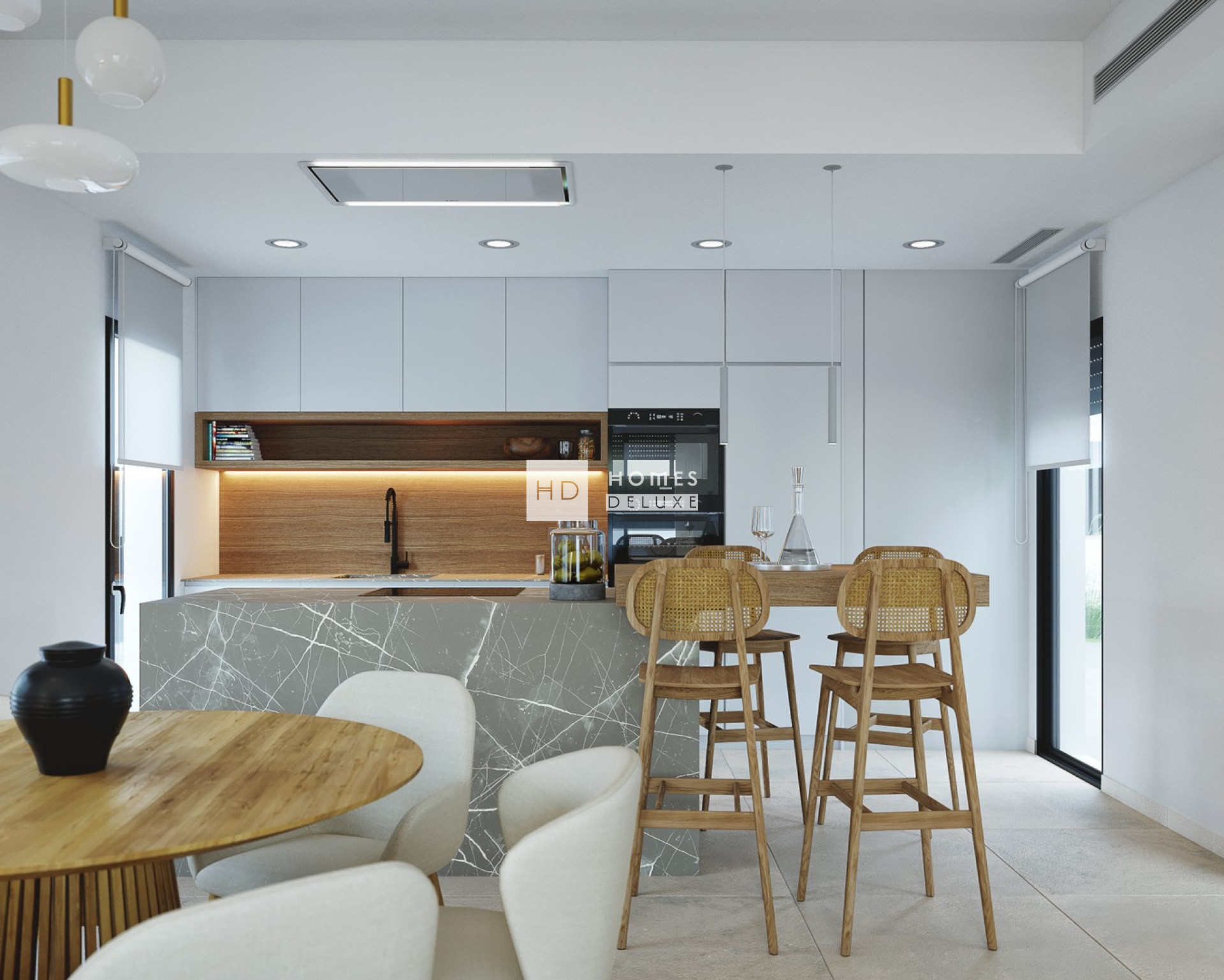 De woningen worden geleverd inclusief pre-installatie voor airconditioning met buizen, vloerverwarming in de badkamers, elektrische keukenapparatuur (oven, kookplaat, afzuigkap, magnetron, koelkast met vriesvak, vaatwasser en wasmachine), ingebouwde kasten in alle slaapkamers, LED-verlichting in het interieur, elektrische rolluiken, een eigen zwembad en een eigen parkeerplaats op het perceel.
