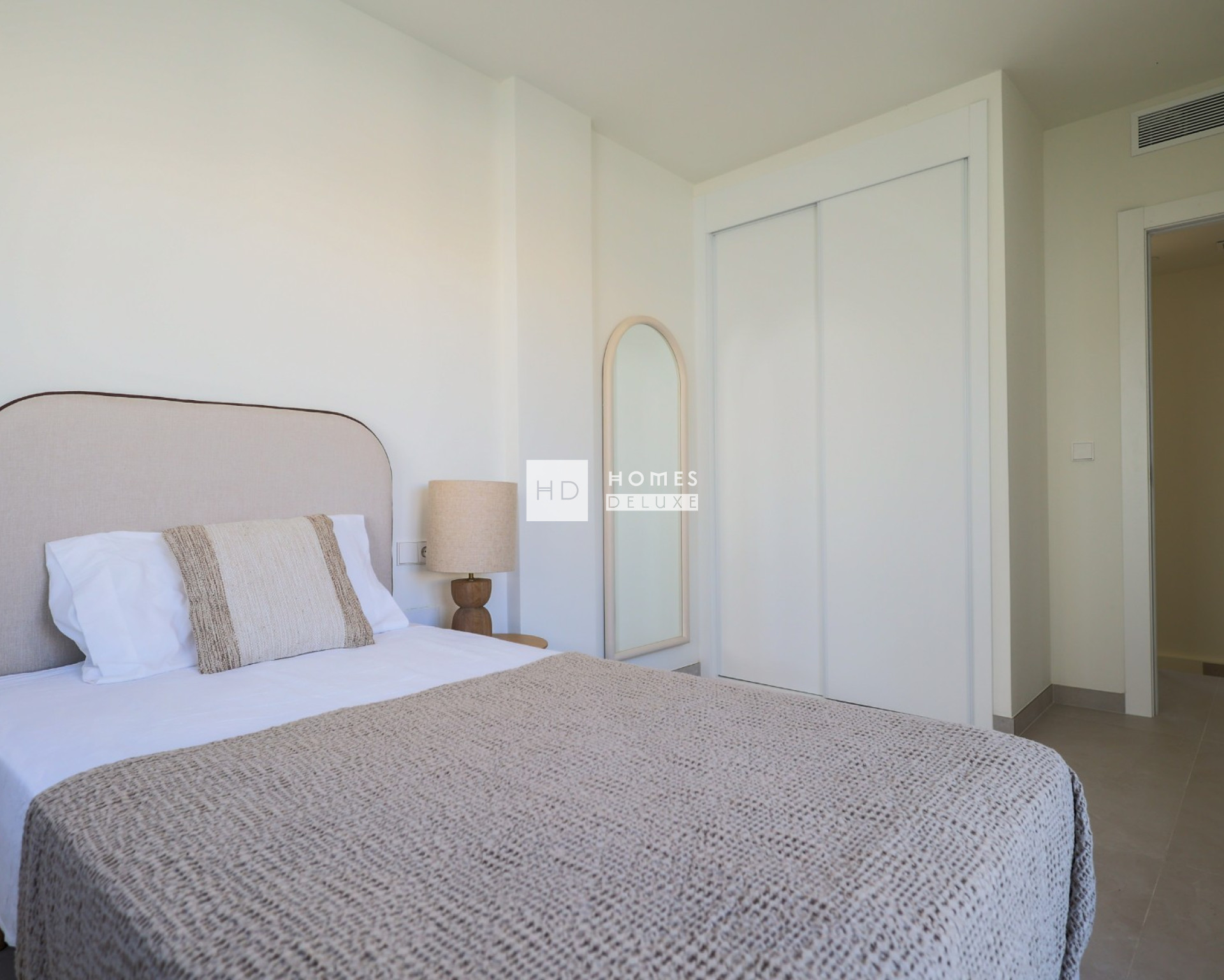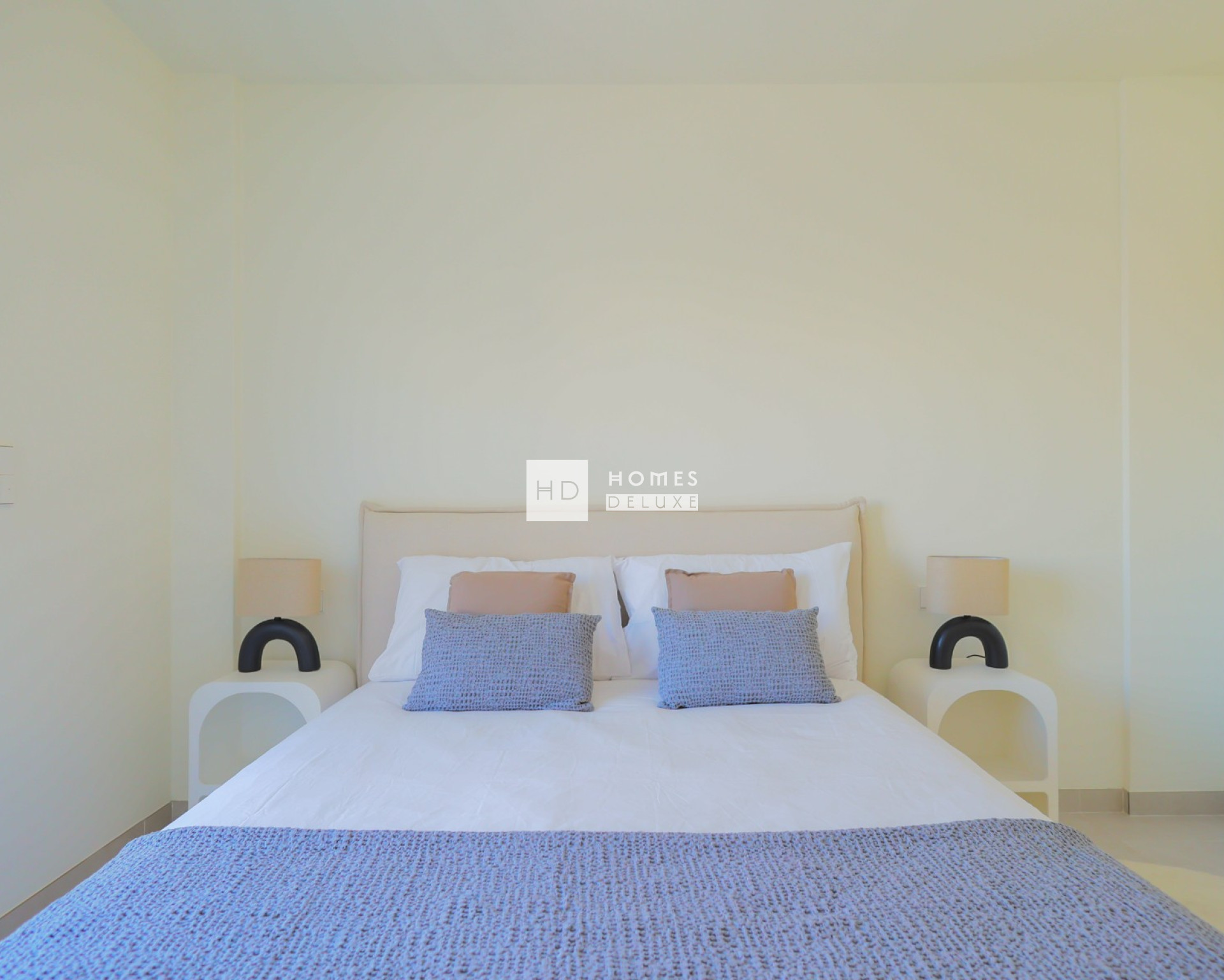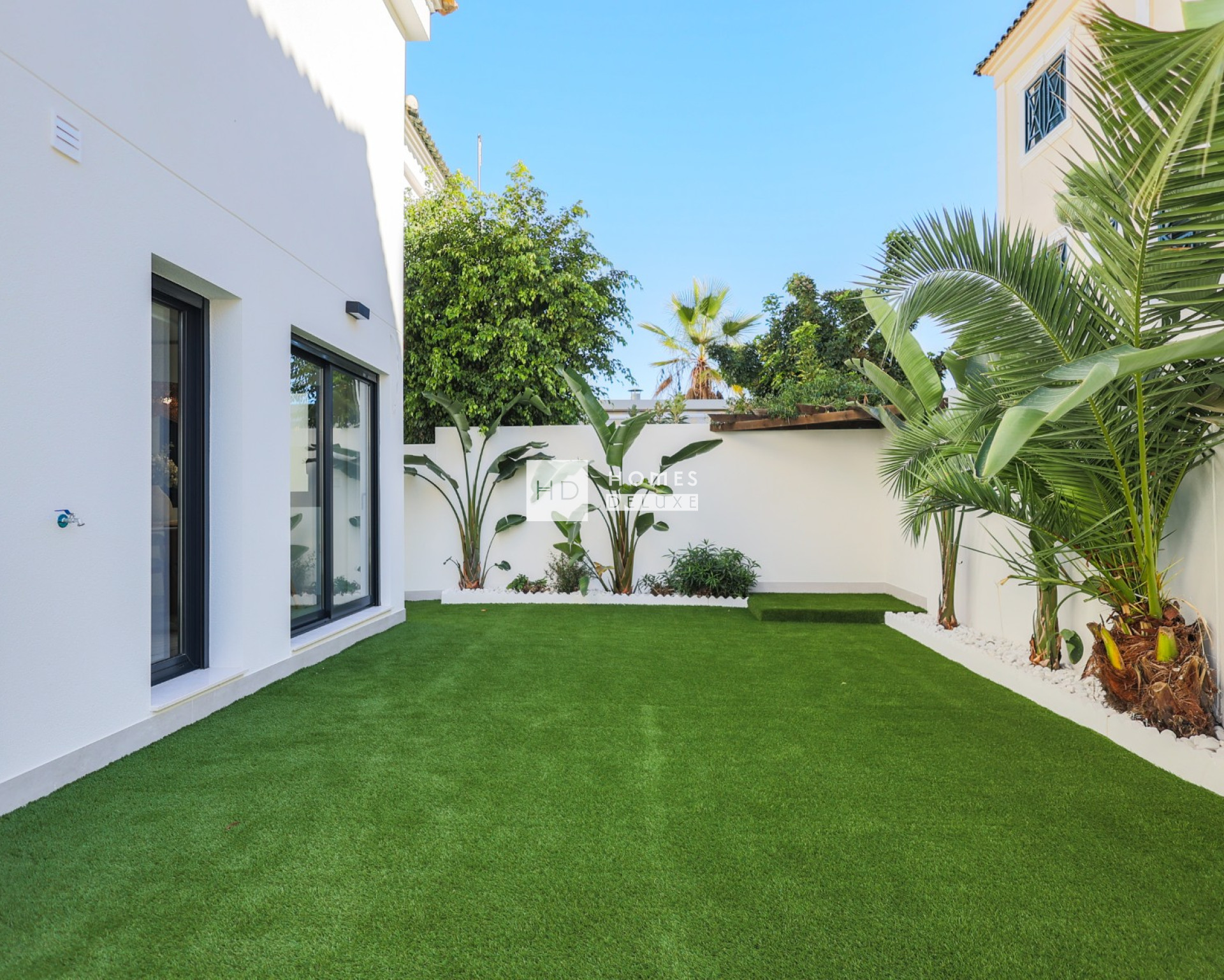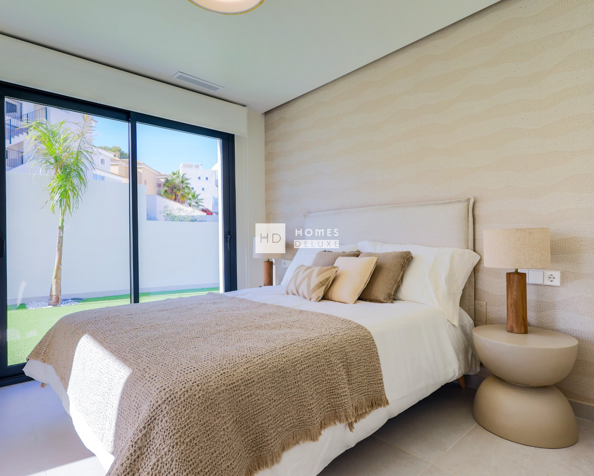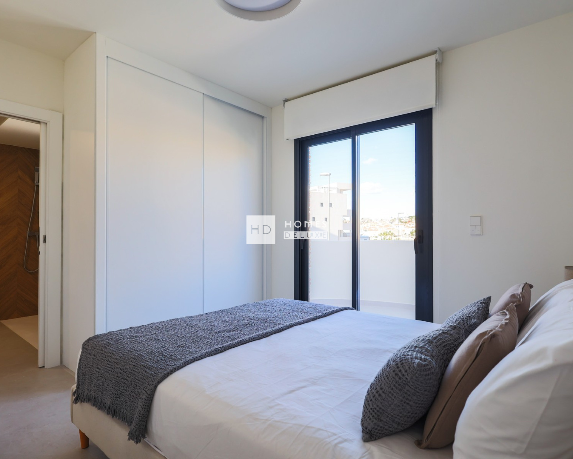 De indeling van het interieur bestaat uit een hal die leidt naar de ruime open woon- en eetkamer met grote ramen die voor veel natuurlijk licht zorgen. In de belangrijkste leefruimte bevindt zich een volledig ingerichte, stijlvolle keuken in Amerikaanse stijl, afgewerkt in wit en houttinten. Op de begane grond bevindt zich een ruime tweepersoonsslaapkamer met grote dubbele ramen die uitkijken op het zwembad, en een aparte gastenbadkamer. De binnentrap leidt u naar de eerste verdieping, waar u nog twee tweepersoonsslaapkamers en een familiebadkamer vindt. Beide slaapkamers op de eerste verdieping hebben openslaande deuren naar hun eigen privéterras.