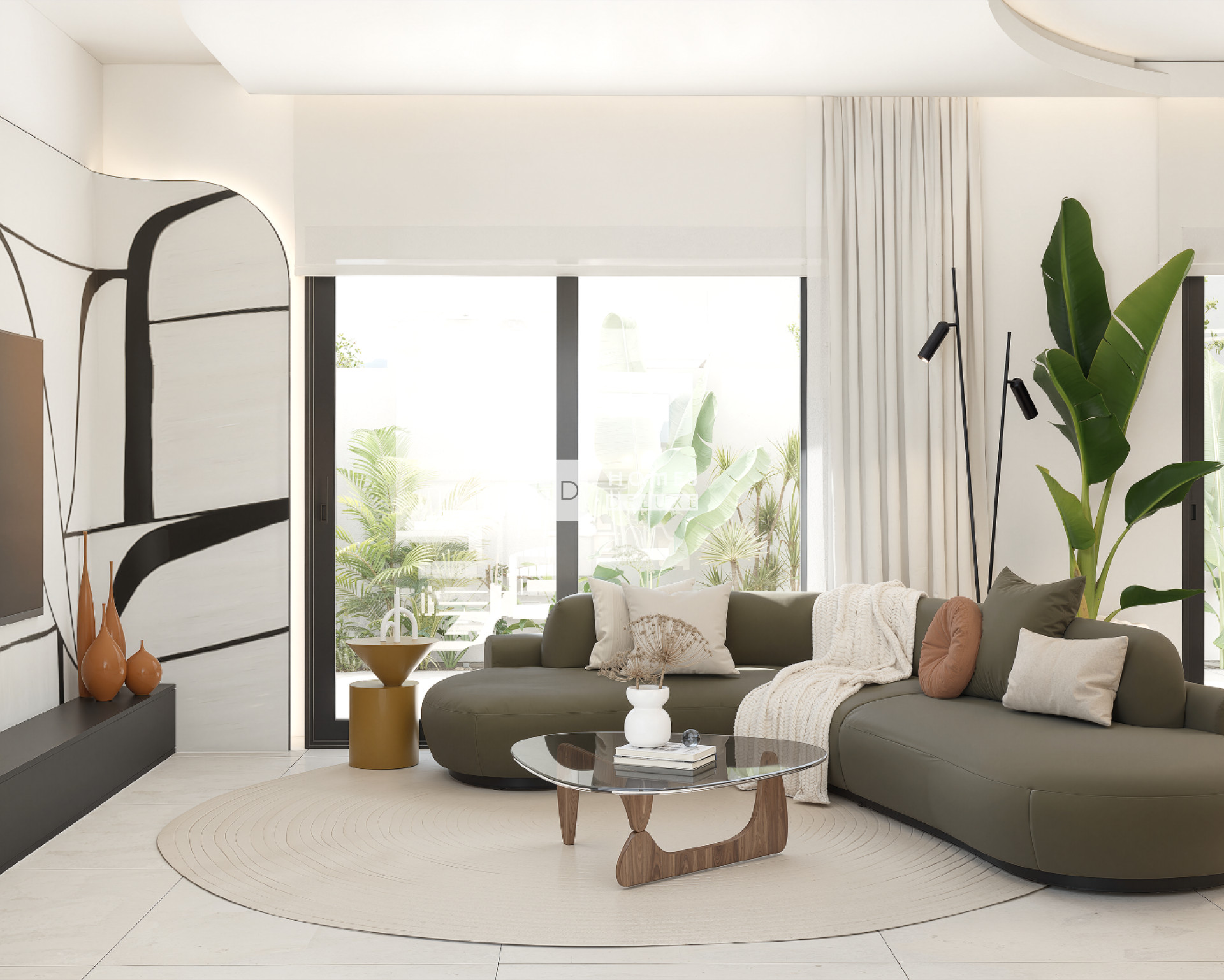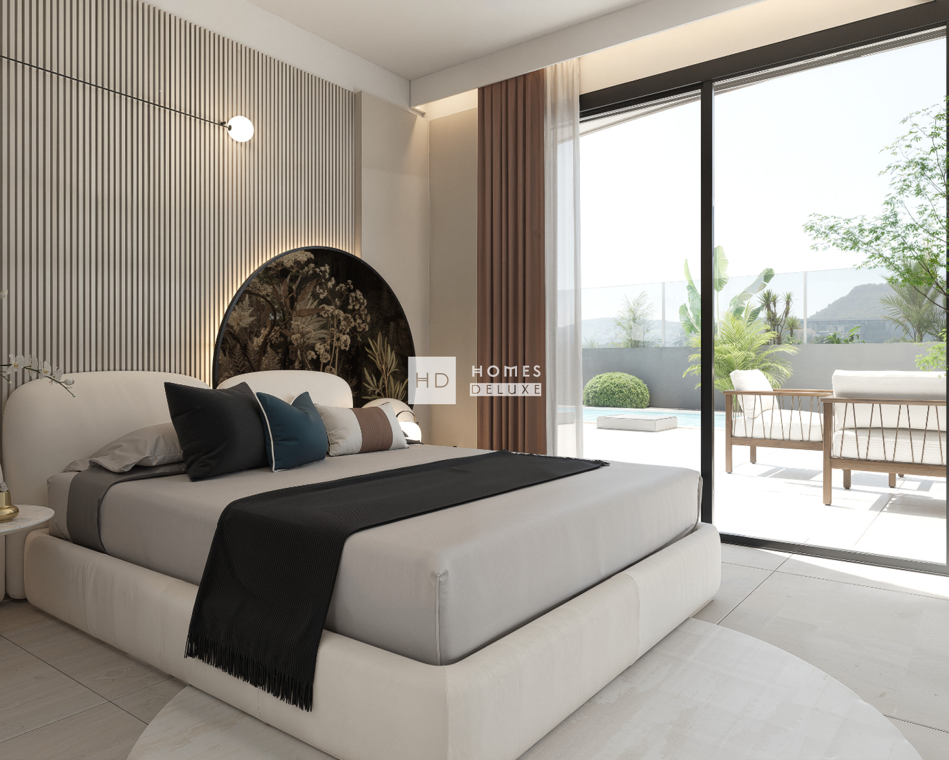 Deze villa heeft een L-vormig ontwerp waardoor vrijwel het hele huis uitzicht heeft op en toegang biedt tot de ruime en luxe tuin met een privézwembad van 6 x 3 meter. Er is een optionele extra mogelijkheid om een kelderverdieping aan dit villaontwerp toe te voegen. De villa is geheel gelijkvloers en de indeling van het interieur bestaat uit een lichte en ruime open woon- en eetkamer met grote ramen in de hele woonruimte, die veel natuurlijk licht binnenlaten en uitkomen op het terras. In de belangrijkste leefruimte bevindt zich een volledig ingerichte moderne keuken in Amerikaanse stijl met lage en hoge kasten en een kookeiland, en er is ook een handige aparte wasruimte. De indrukwekkende master suite beschikt over een grote slaapkamer met en-suite badkamer en inloopkast/kleedruimte. Er zijn nog twee ruime tweepersoonsslaapkamers, alle slaapkamers hebben openslaande deuren naar het hoofdterras en er is een aparte gastenbadkamer. Een buitentrap aan de zijkant van het pand leidt u naar het uitgebreide dakterras, dat perfect is om de hele dag van de zon te genieten. De woningen zijn voorzien van pre-installatie voor airconditioning, inbouwkasten met ladekasten in alle slaapkamers, LED-verlichting binnen en buiten, een optioneel domoticasysteem, een tuin met betegelde delen, kunstgras met ruimte voor landschapsarchitectuur en een eigen parkeerplaats op het perceel.