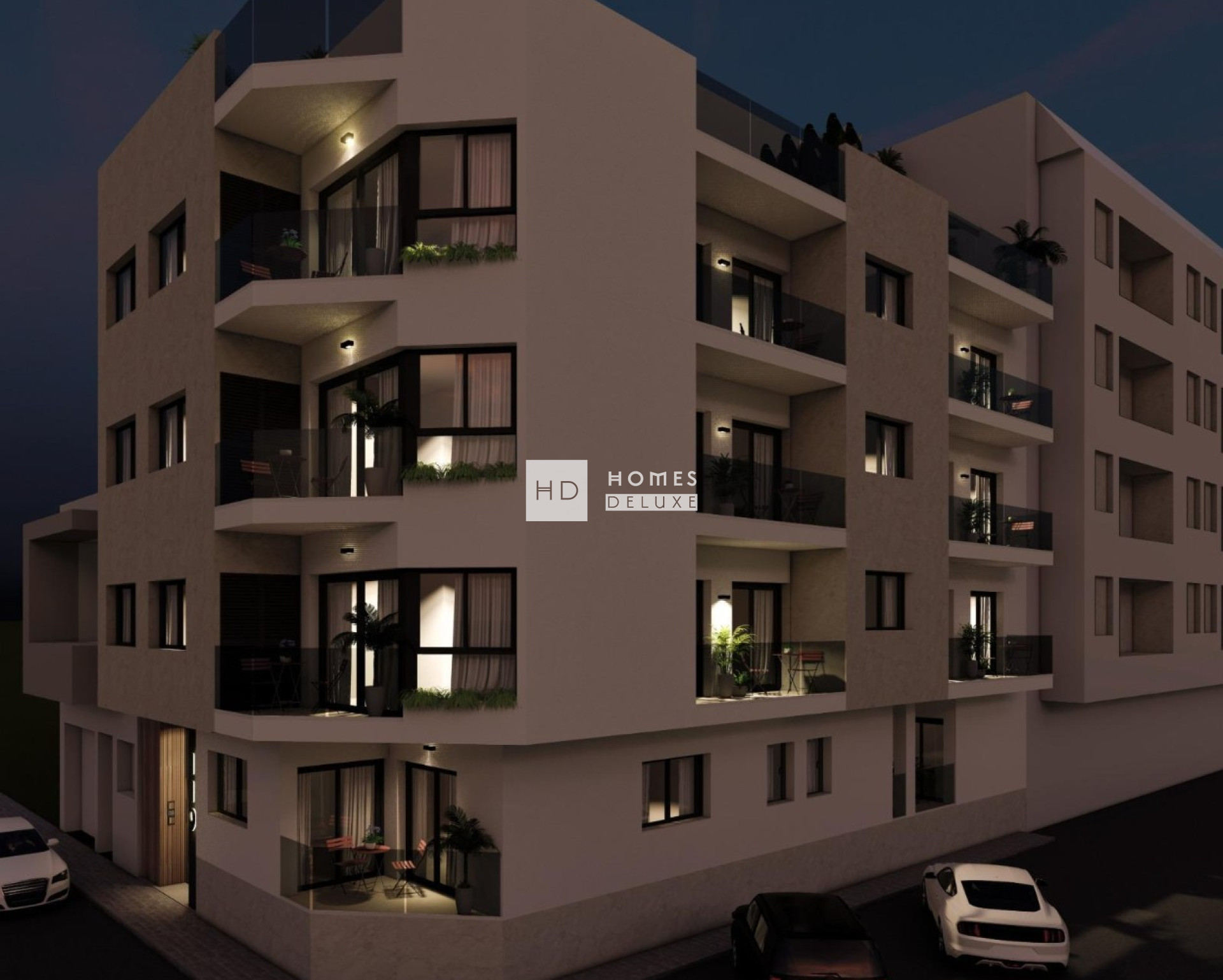 Er is keuze uit appartementen met 2 slaapkamers en 2 badkamers op de begane grond, appartementen met 2 slaapkamers en 2 badkamers op de middelste verdieping met ruime terrassen, of penthouses met 1 slaapkamer en 1 badkamer met een groot terras. De indeling van het interieur bestaat uit een open woon- en eetkamer met openslaande deuren naar het terras. In de woonkamer bevindt zich ook een moderne Amerikaanse keuken met hoge en lage kasten. De hoofdslaapkamer heeft een eigen badkamer en er is nog een tweepersoonsslaapkamer en een aparte gastenbadkamer. De woningen zijn voorzien van voorinstallatie voor airconditioning, afzuigkap in de keuken, inbouwkasten in alle slaapkamers en een video-intercomsysteem.