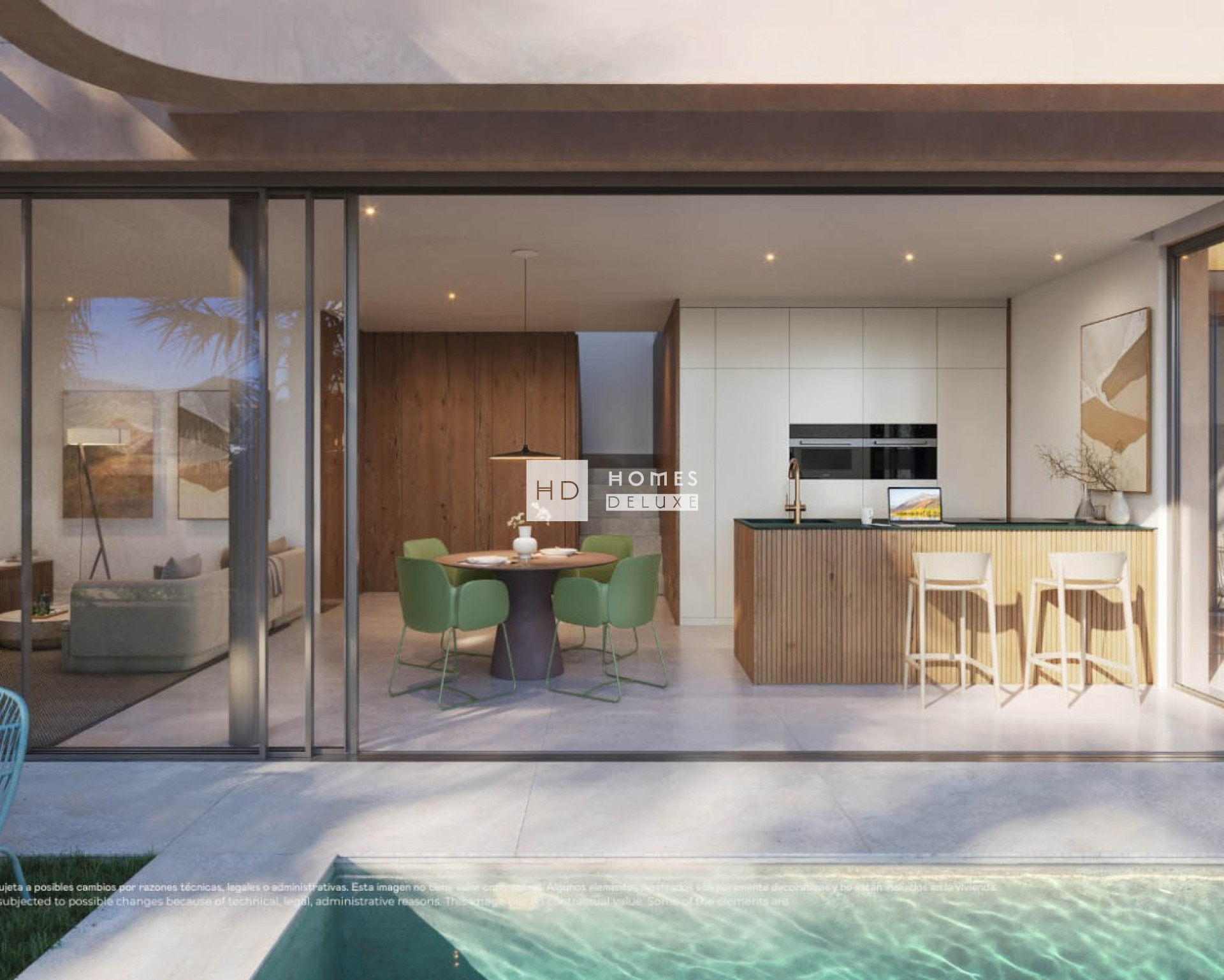 De villa's hebben twee verdiepingen en de indeling van het interieur bestaat uit een hal die leidt naar de ruime open woon- en eetkamer met grote ramen die uitkomen op het buitenterras, waardoor de binnen- en buitenruimte één geheel vormen. In de belangrijkste leefruimte bevindt zich een volledig ingerichte moderne keuken in Amerikaanse stijl met wand- en onderkasten en een kookeiland, en er is een handig gastentoilet bij de voordeur. Op de begane grond bevindt zich ook de indrukwekkende hoofdslaapkamer met een grote slaapkamer, een en-suite badkamer en openslaande deuren naar het grote terras. De binnentrap leidt u naar de eerste verdieping met nog twee ruime tweepersoonsslaapkamers en een familiebadkamer. Beide slaapkamers op de eerste verdieping hebben openslaande deuren naar het grote zonneterras met een prachtig vrij uitzicht. De villa heeft een eigen tuin met een groot terras, perfect om te relaxen bij het uitnodigende privézwembad. Het perceel heeft ook een eigen parkeerplaats.