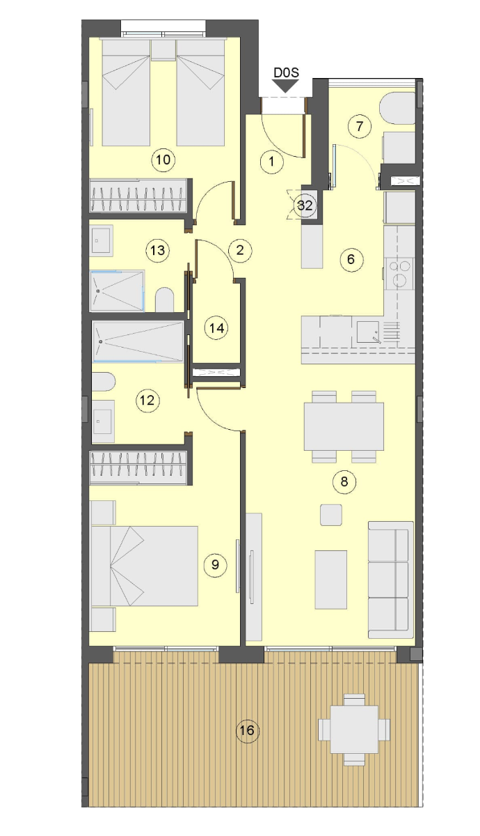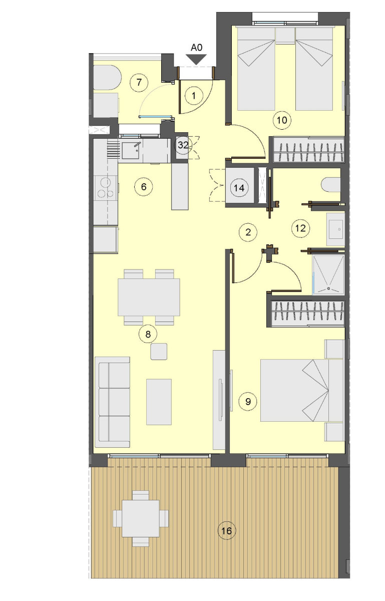 De bouwer werkt volgens principes van uitmuntendheid en kwaliteit in elk detail. Daarom bieden ze u de mogelijkheid om uw woning te personaliseren met verschillende afwerkingen, materialen en kwaliteitsopties, altijd aangepast aan uw levensstijl en voorkeuren. Bovendien kunt u uw nieuwe woning door hen laten inrichten door te kiezen uit verschillende meubelcollecties, ontworpen om functionele, evenwichtige en gezellige ruimtes te creëren, zodat u vanaf dag één van uw woning kunt genieten. De indeling van het interieur bestaat uit een hal die leidt naar de lichte en ruime open woon- en eetkamer met openslaande deuren naar het terras. In de belangrijkste leefruimte bevindt zich een moderne Amerikaanse keuken met lage en hoge kasten en er is een aparte bijkeuken. De ruime hoofdslaapkamer heeft een en-suite badkamer (met 2 badkameropties) en openslaande deuren naar het terras. Er is nog een ruime tweepersoonsslaapkamer en een aparte familiebadkamer. De appartementen op de bovenste verdieping hebben een binnentrap die u naar het uitgebreide dakterras leidt, waar u de hele dag van de zon kunt genieten. De woningen zijn voorzien van pre-installatie voor airconditioning, inbouwkasten in alle slaapkamers, een eigen ondergrondse parkeerplaats en sommige woningen hebben een berging.