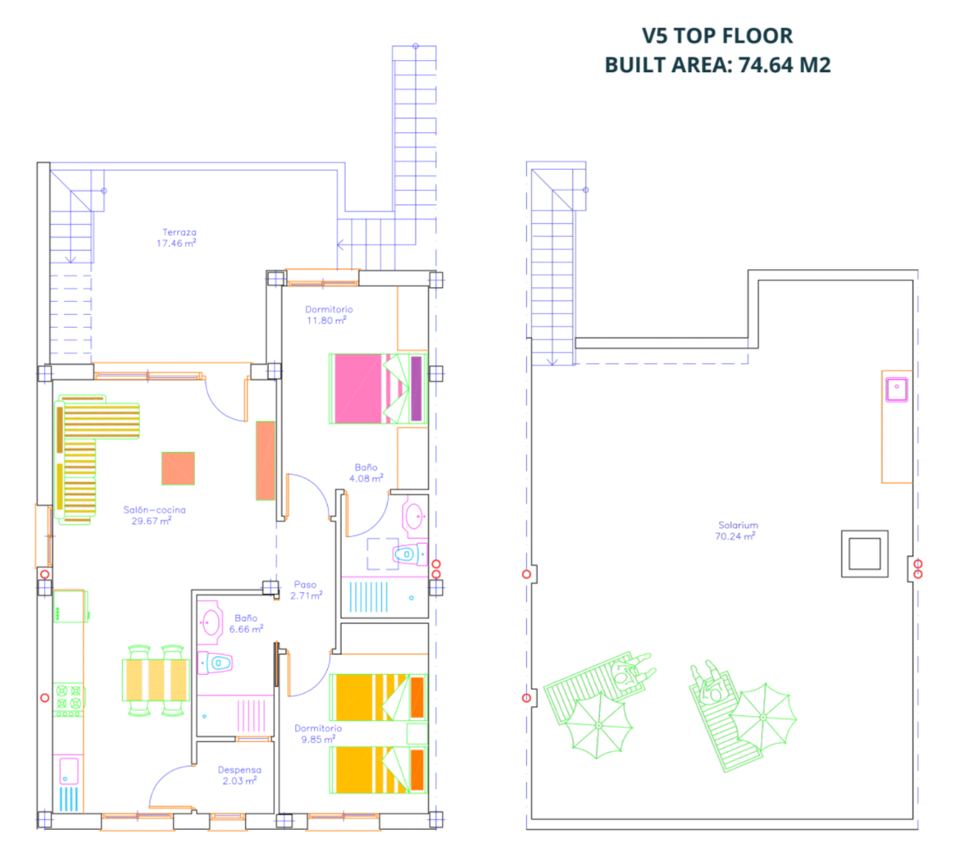 De indeling van het interieur met 2 slaapkamers bestaat uit een ruime open woonkamer en eetkamer met openslaande deuren naar het terras. In de belangrijkste leefruimte bevindt zich een volledig uitgeruste moderne keuken in Amerikaanse stijl met een witte afwerking en een Calacatta-werkblad in verschillende kleuren naar keuze, en er is een handige bijkeuken. De grote hoofdslaapkamer bevindt zich aan de voorzijde van het pand en heeft openslaande deuren naar het terras en een en-suite badkamer. Er is nog een ruime tweepersoonsslaapkamer en een aparte gastenbadkamer. De appartementen op de bovenste verdieping hebben een buitentrap op het terras die u naar het uitgebreide dakterras van 70 m² leidt, met een zomerkeuken om buiten te dineren. De appartementen op de begane grond hebben ook een zomerkeuken, die zich op het achterterras bevindt.