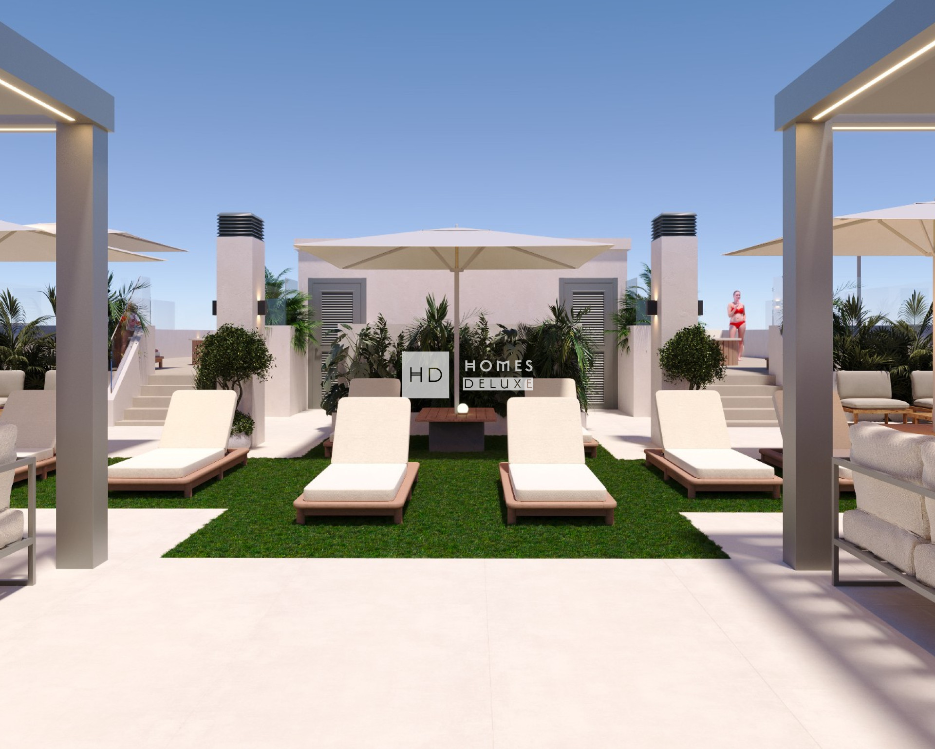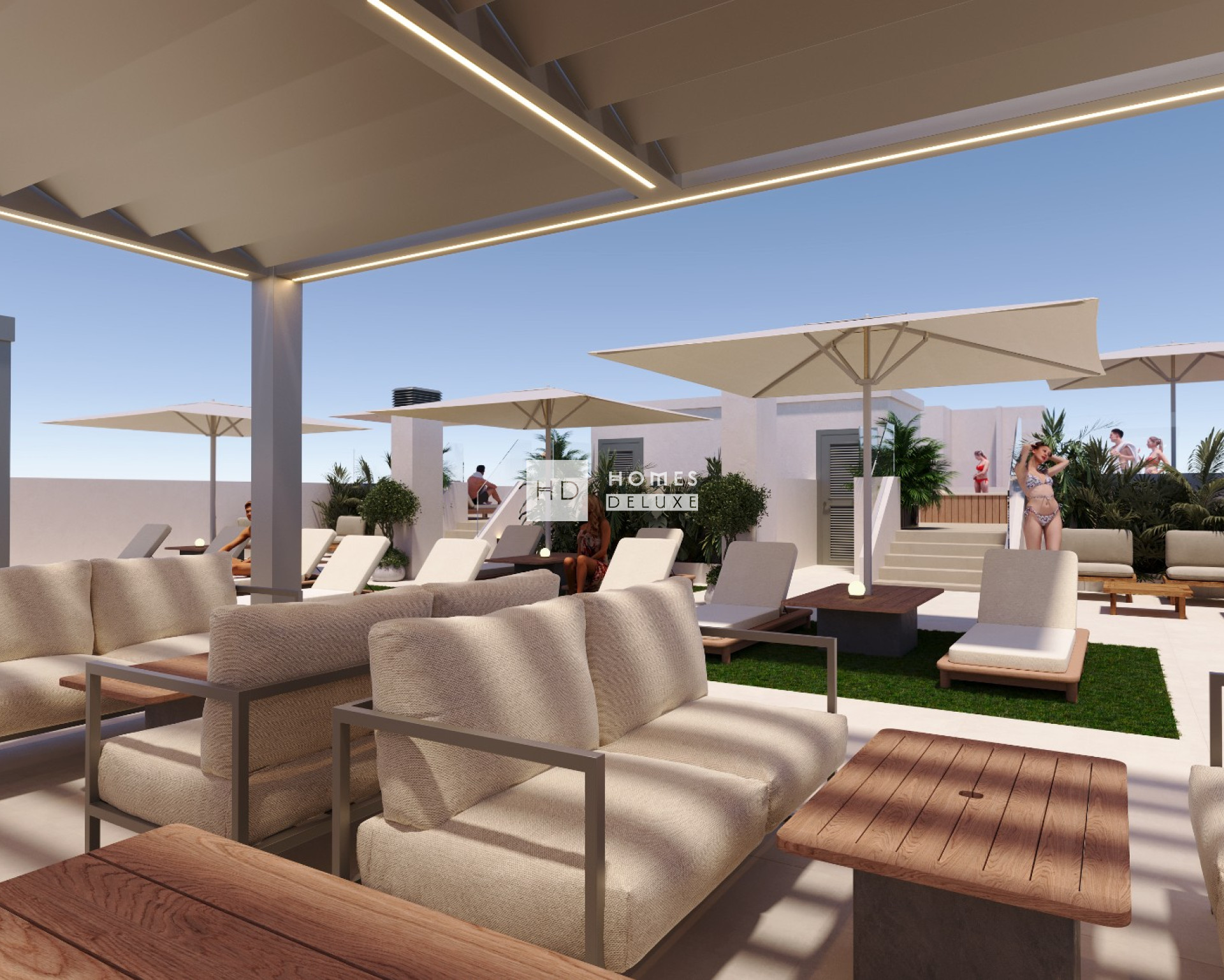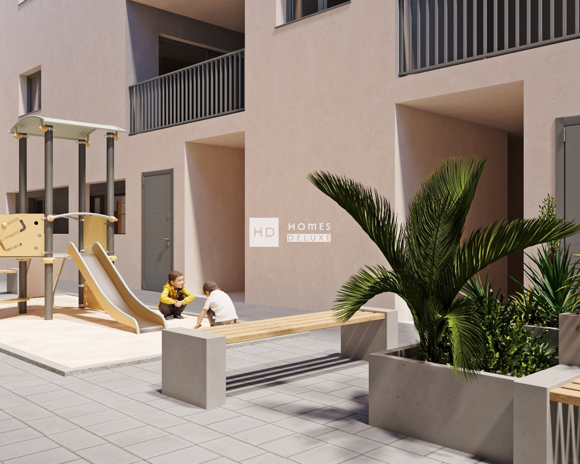 De gemeenschappelijke ruimte op de begane grond vormt het sociale hart van het project – een aangename ontmoetingsplaats voor bewoners, omgeven door groene tuinen, zitjes, fietsenstallingen en een kinderspeelplaats. Op het dak kunnen bewoners genieten van een exclusieve recreatieruimte van 350 m² met een zwembad van 70 m² met een kinderbad, pergola's, parasols en ligstoelen – alles wat u nodig heeft om te ontspannen onder de Spaanse zon terwijl u geniet van het panoramische uitzicht. Deze ruimte is gemakkelijk bereikbaar via een van de drie liften en is uitgerust met de nodige sanitaire voorzieningen.