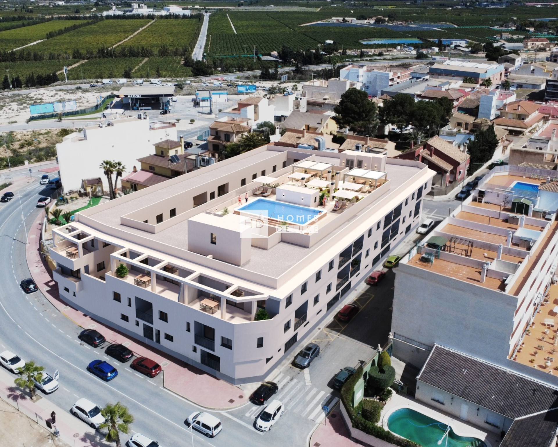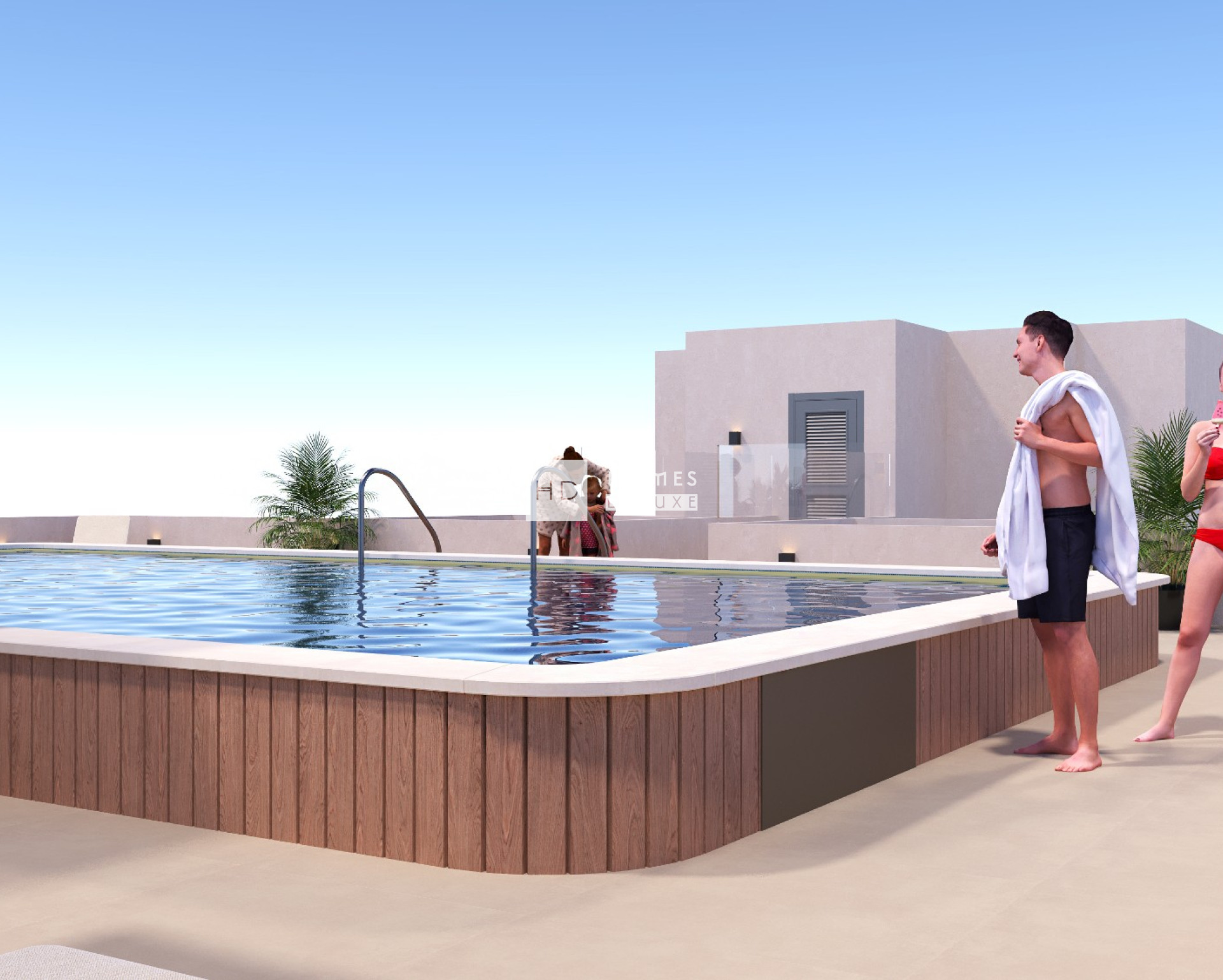De gemeenschappelijke ruimte op de begane grond vormt het sociale hart van het project – een aangename ontmoetingsplaats voor bewoners, omgeven door groene tuinen, zitjes, fietsenstallingen en een kinderspeelplaats. Op het dak kunnen bewoners genieten van een exclusieve recreatieruimte van 350 m² met een zwembad van 70 m² met een kinderbad, pergola's, parasols en ligstoelen – alles wat u nodig heeft om te ontspannen onder de Spaanse zon terwijl u geniet van het panoramische uitzicht. Deze ruimte is gemakkelijk bereikbaar via een van de drie liften en is uitgerust met de nodige sanitaire voorzieningen.
