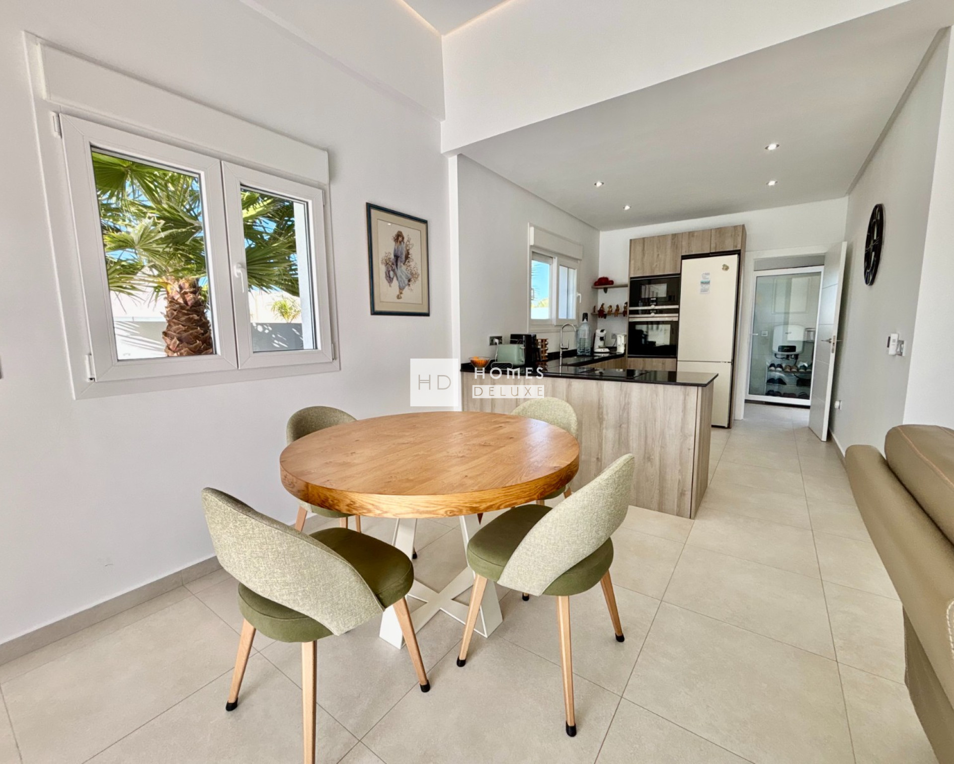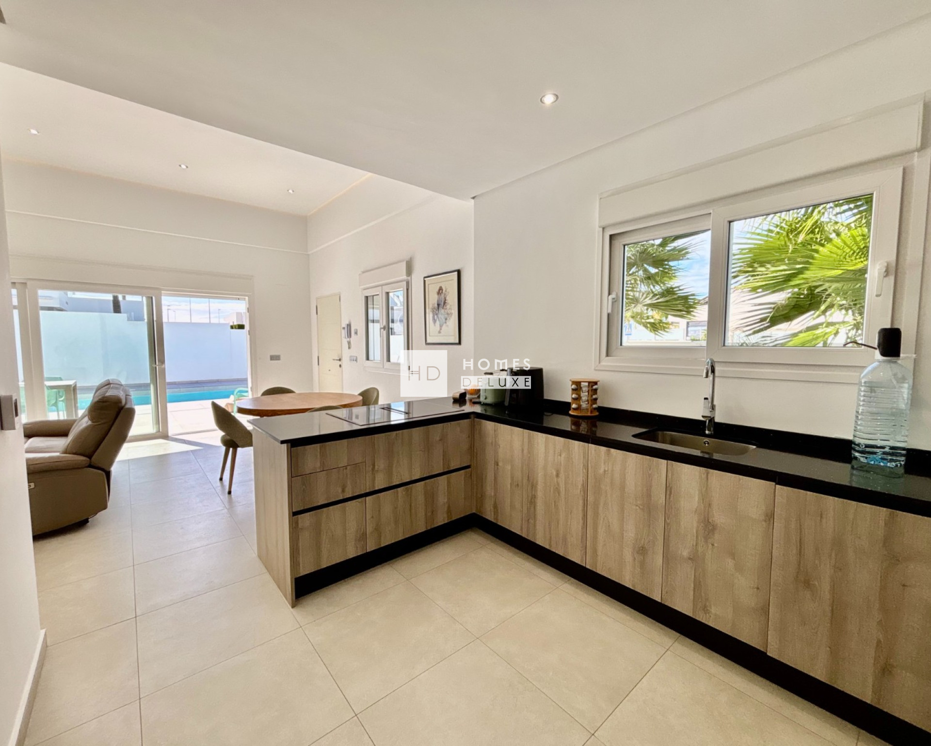 De woning is zorgvuldig ontworpen op één niveau, waardoor ze gemakkelijk toegankelijk is en een naadloze overgang tussen binnen- en buitenruimtes biedt. Deze indeling is vooral aantrekkelijk voor mensen die op zoek zijn naar comfort, gemak en een moderne mediterrane levensstijl. De villa beschikt over drie goed geproportioneerde slaapkamers, elk met veel natuurlijk licht en ingebouwde opbergruimte. De hoofdslaapkamer valt op door de directe toegang tot de tuin en het zwembad, waardoor een rustig toevluchtsoord ontstaat waar u kunt ontwaken met het zachte Spaanse zonlicht. De twee stijlvolle badkamers zijn afgewerkt met hoogwaardige materialen en moderne armaturen, waardoor ze een strakke, spa-achtige uitstraling hebben die het algehele gevoel van luxe van de woning versterkt. Het hart van het pand wordt gevormd door de open woonkamer, die is ontworpen om de ruimte en het licht te maximaliseren. De moderne keuken, uitgerust met hoogwaardige afwerkingen en royale werkbladen, loopt naadloos over in de eet- en zithoek. Grote schuifdeuren geven direct toegang tot het terras, waardoor het interieur prachtig overgaat in de buitenomgeving. Of u nu gasten ontvangt, geniet van een rustige avond of gewoon ontspant met het gezin, deze ruimte past zich perfect aan elke gelegenheid aan.