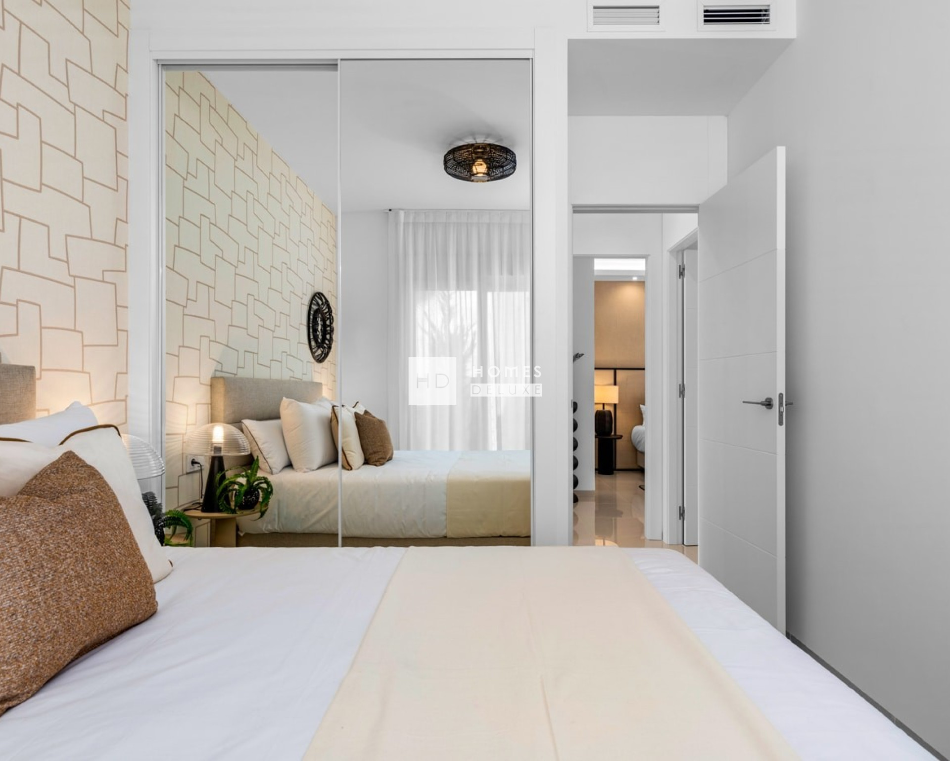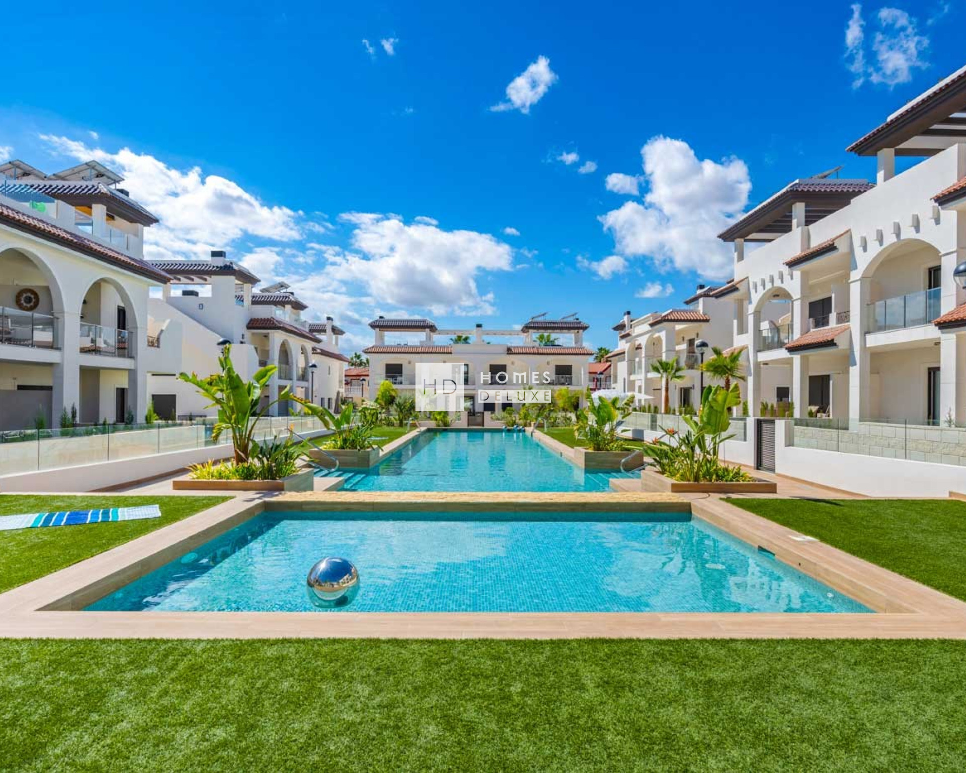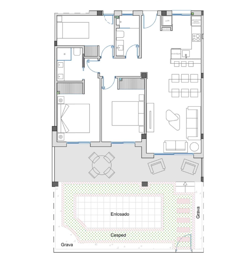 Het complex biedt u de keuze uit appartementen op de begane grond met een ruime privétuin en terras of appartementen op de bovenste verdieping met een groot dakterras. De indeling van het interieur bestaat uit een hal die leidt naar de lichte en ruime open woon- en eetkamer met ramen die uitkomen op het terras. In de woonkamer bevindt zich een Amerikaanse keuken met lage en hoge kasten en een ontbijtbar. De grote hoofdslaapkamer heeft een eigen badkamer. Er zijn nog twee ruime tweepersoonsslaapkamers en een aparte gastenbadkamer. De appartementen op de bovenste verdieping hebben een buitentrap op het terras die leidt naar het uitgebreide dakterras van 95 m² of meer, waar u de hele dag van de zon kunt genieten. De woningen zijn voorzien van pre-installatie voor airconditioning, inbouwkasten in alle slaapkamers, elektrische rolluiken, intercomsysteem en een eigen parkeerplaats.