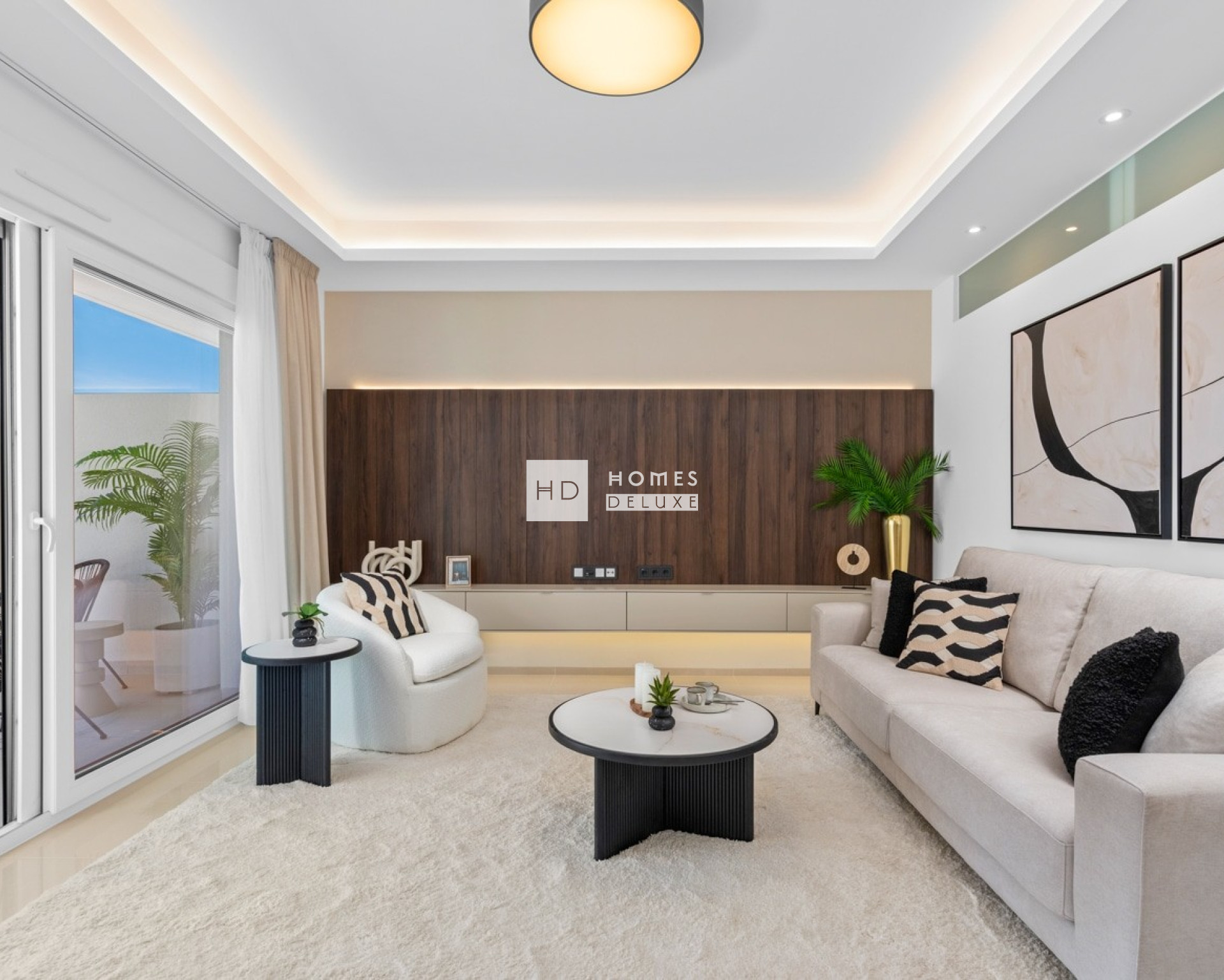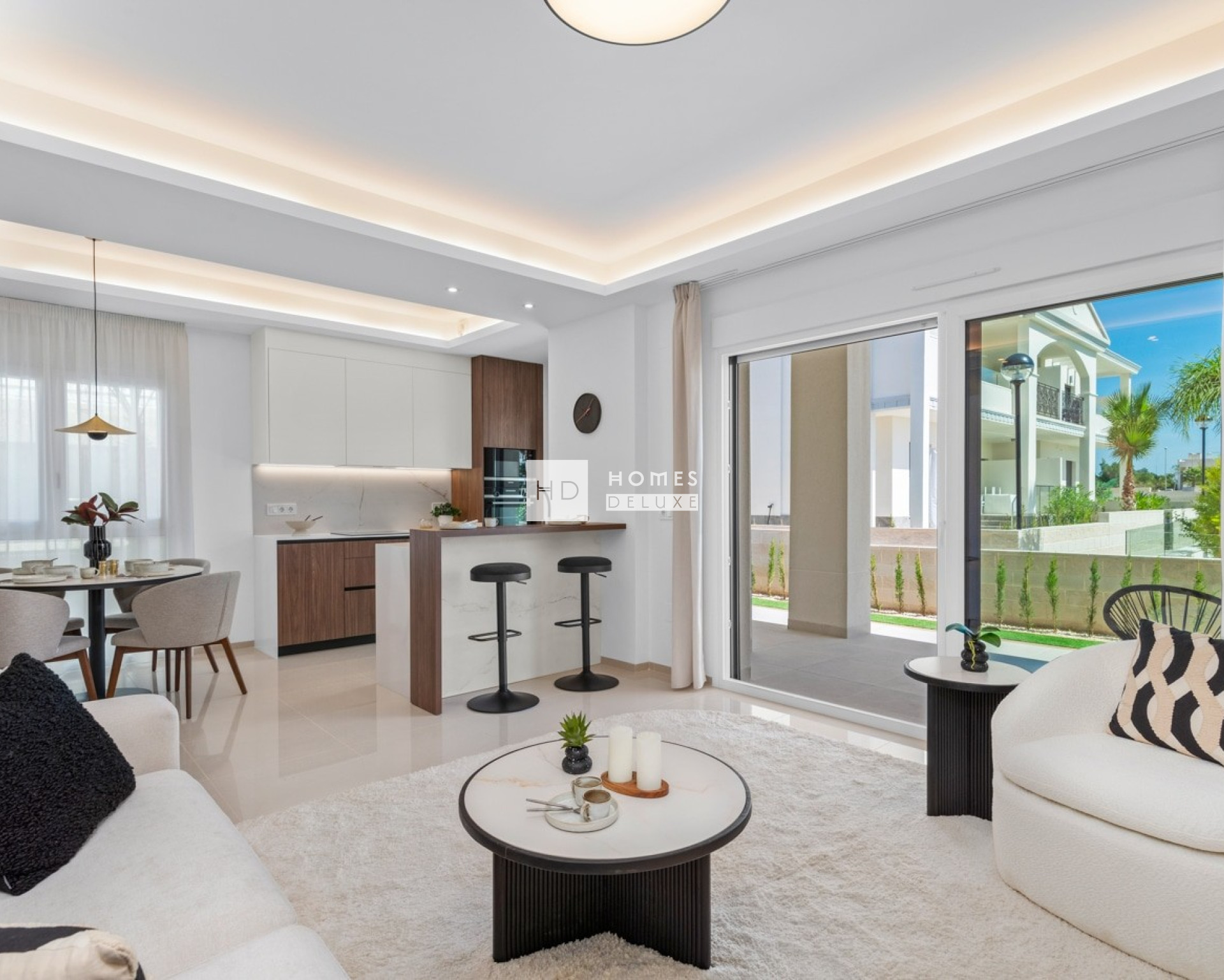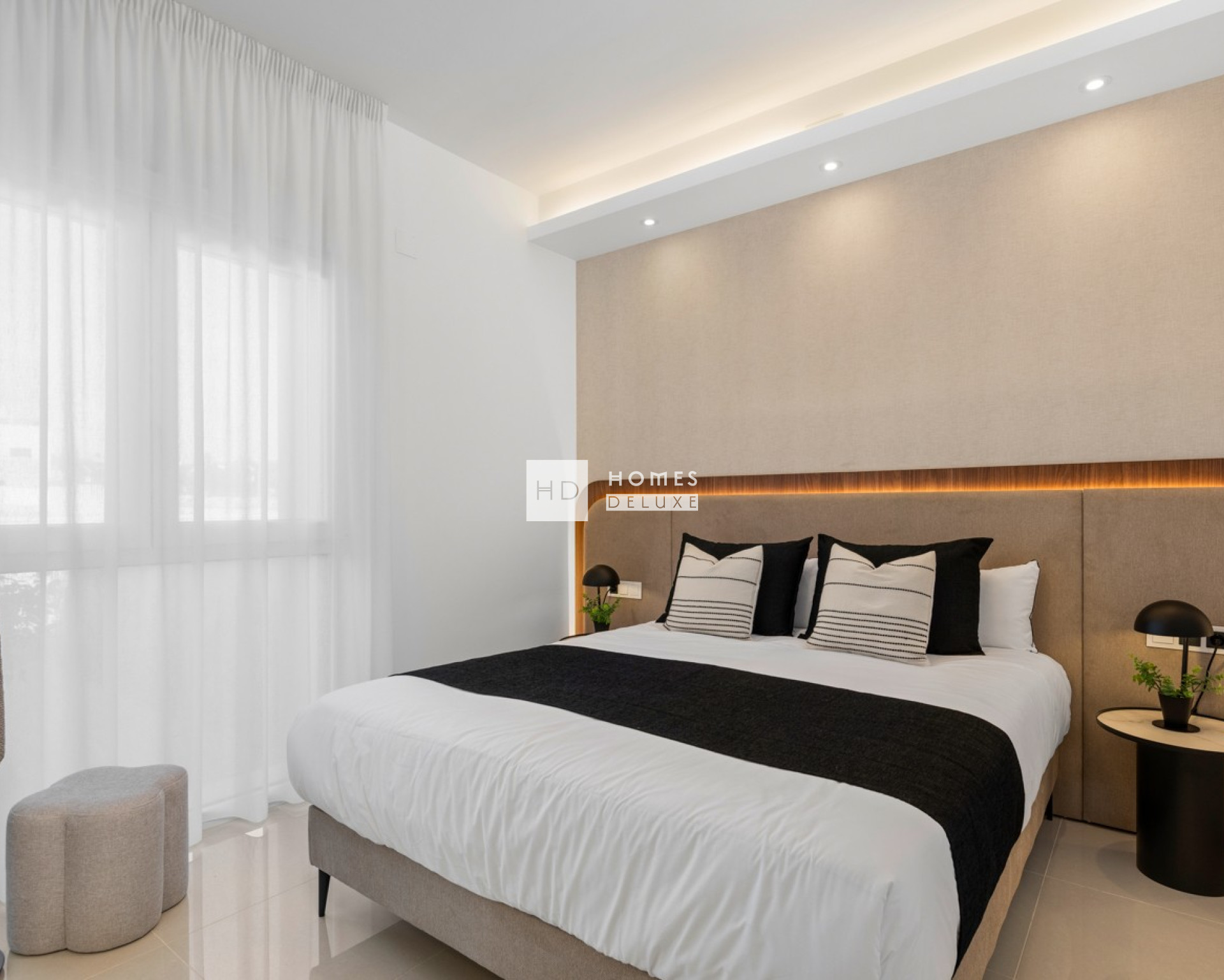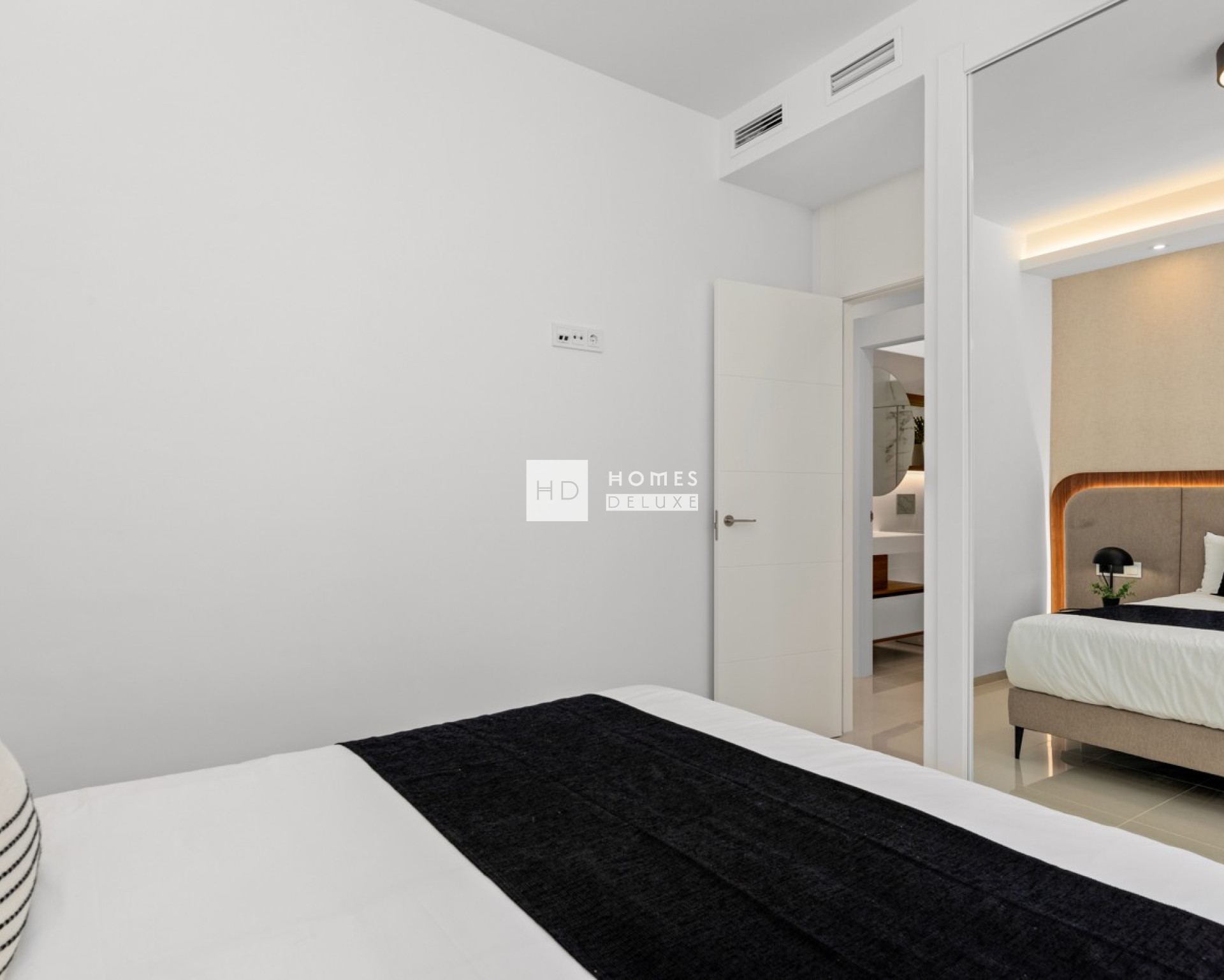 De indeling van het interieur bestaat uit een hal die leidt naar de lichte en ruime open woon- en eetkamer met ramen die uitkomen op het terras. In de woonkamer bevindt zich een Amerikaanse keuken met lage en hoge kasten en een ontbijtbar. De grote hoofdslaapkamer heeft een eigen badkamer. Er is ook nog een andere ruime tweepersoonsslaapkamer en een aparte gastenbadkamer. De appartementen op de bovenste verdieping hebben een buitentrap op het terras die leidt naar het uitgebreide dakterras van 75 m² waar u de hele dag van de zon kunt genieten. De woningen zijn voorzien van een voorinstallatie voor airconditioning, inbouwkasten in alle slaapkamers, elektrische rolluiken, een intercomsysteem en een eigen parkeerplaats.