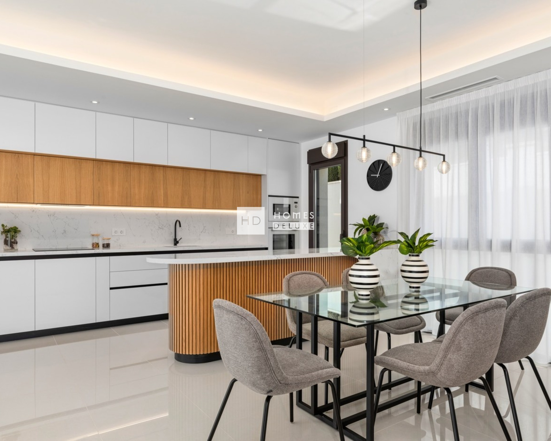 De villa zelf is geheel gelijkvloers en de indeling bestaat uit een hal die leidt naar de ruime open woon- en eetkamer met hoog plafond en grote ramen die zorgen voor veel natuurlijk licht en een ruimtelijk gevoel. In de woonkamer bevindt zich een moderne Amerikaanse keuken met hoge en lage kasten en een kookeiland. De grote hoofdslaapkamer heeft een en-suite badkamer en veel kastruimte. Er zijn nog twee ruime tweepersoonsslaapkamers met inbouwkasten en een aparte gastenbadkamer. Een buitentrap aan de zijkant van het pand leidt u naar het dakterras met een pergola, waar u zowel van de zon als van de schaduw kunt genieten.