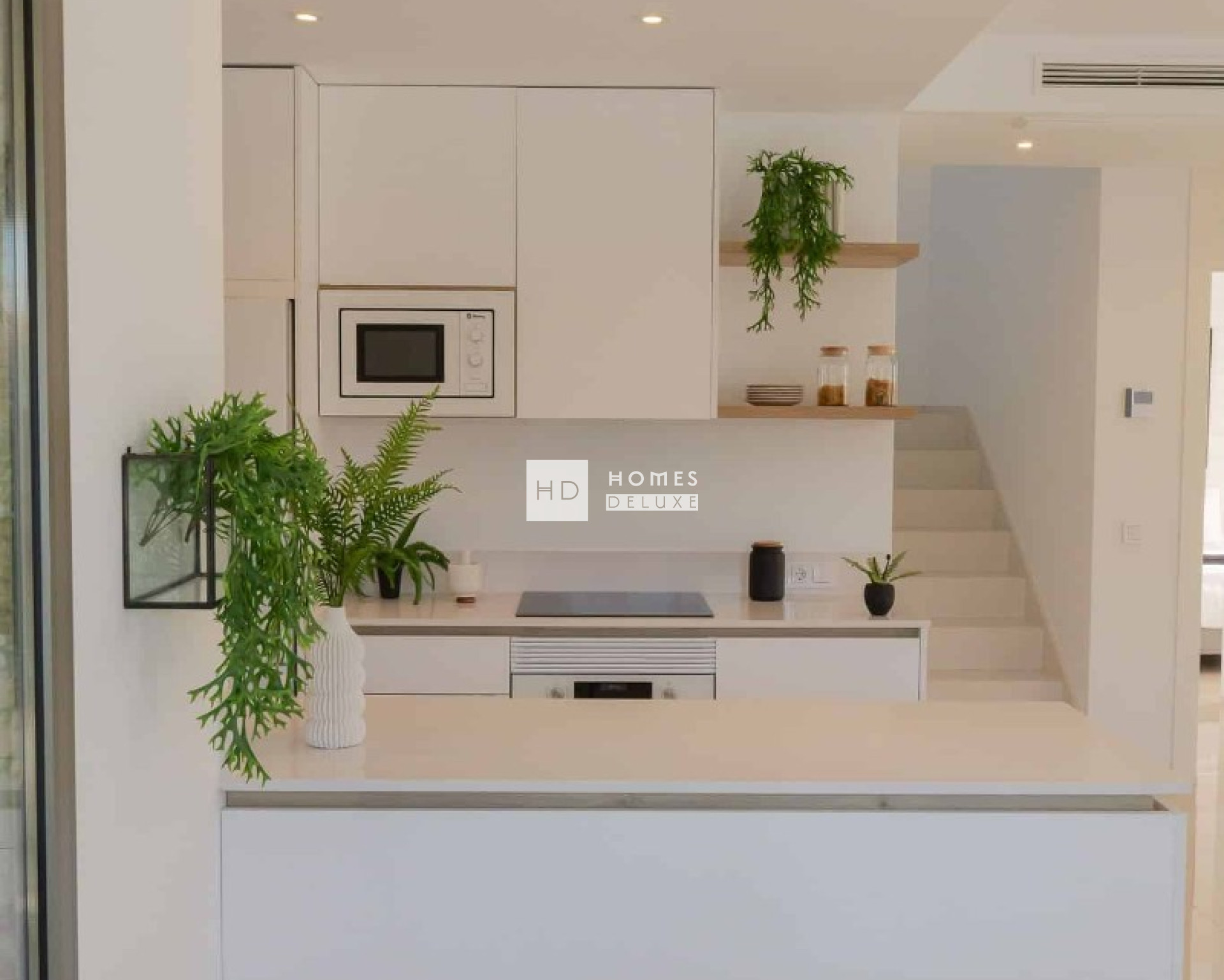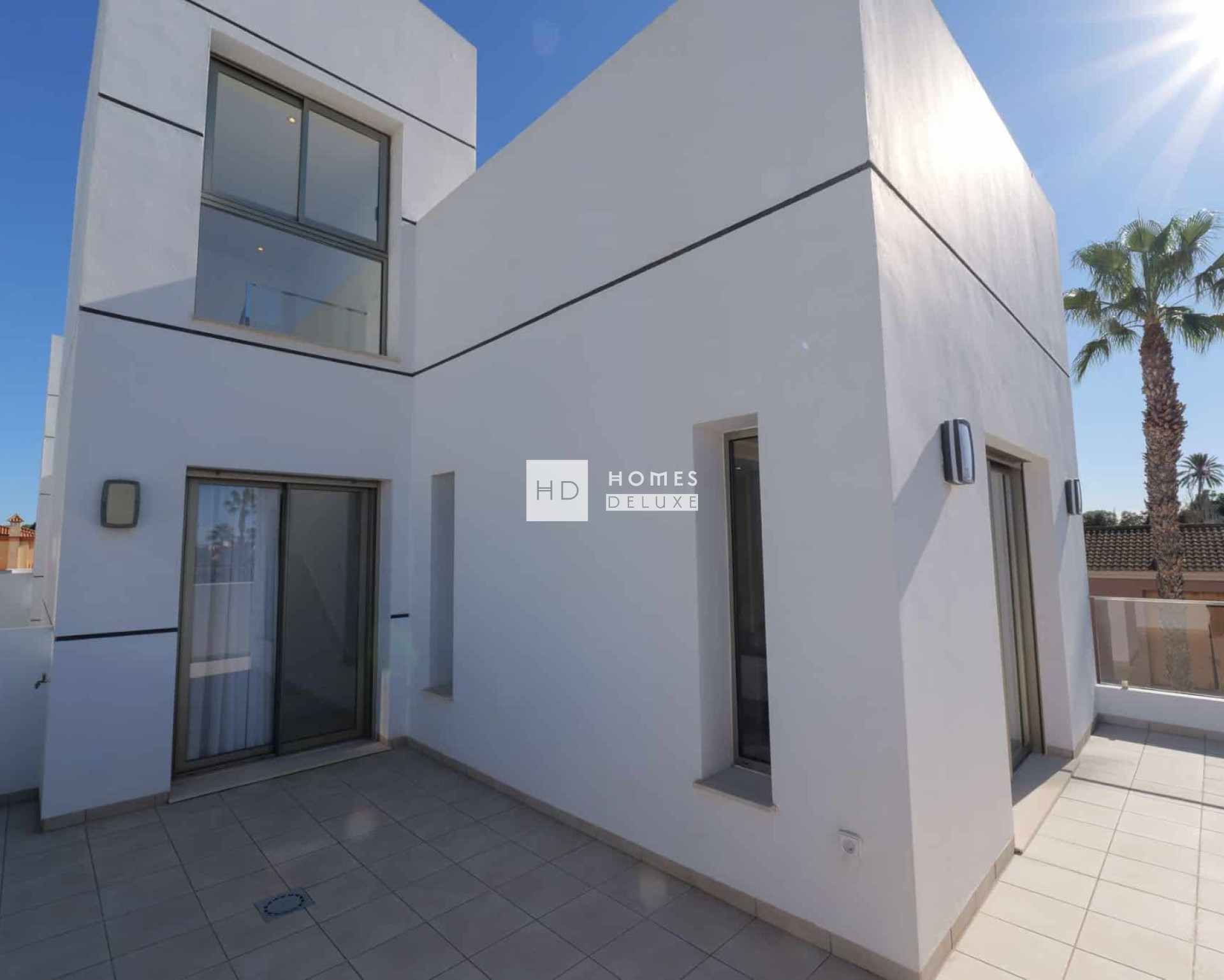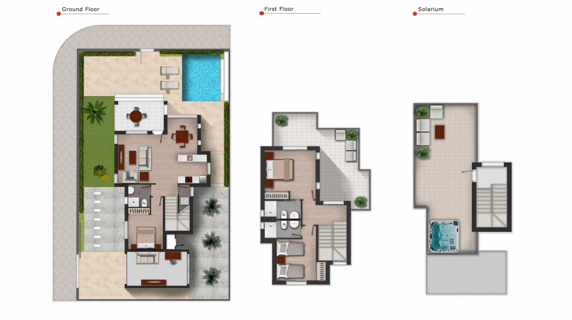 De villa’s zijn verdeeld over twee verdiepingen en de indeling bestaat uit een lichte en ruime open woon- en eetkamer met overal grote ramen die zorgen voor veel natuurlijk licht en uitkomen op het terras en de tuin. In de centrale leefruimte bevindt zich een moderne keuken in Amerikaanse stijl met een kookeiland, en een handige wasruimte onder de trap. Op de begane grond bevinden zich ook een tweepersoonsslaapkamer met inbouwkasten en een aparte gastenbadkamer. De binnentrap leidt u naar de eerste verdieping met de grote hoofdslaapkamer met en-suite badkamer en openslaande deuren naar het mooie zonneterras. Er is nog een ruime tweepersoonsslaapkamer met en-suite badkamer op de eerste verdieping. Het solarium op het dak is bereikbaar via de binnentrap van het pand. De woningen zijn voorzien van voorinstallatie voor airconditioning en vloerverwarming in de badkamers.