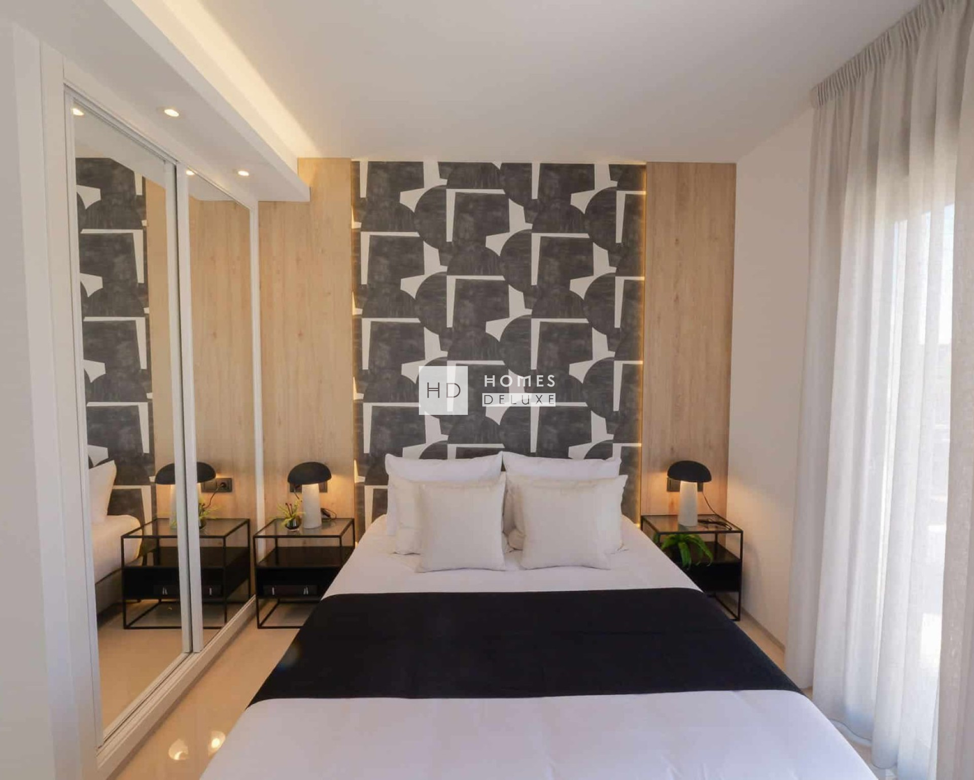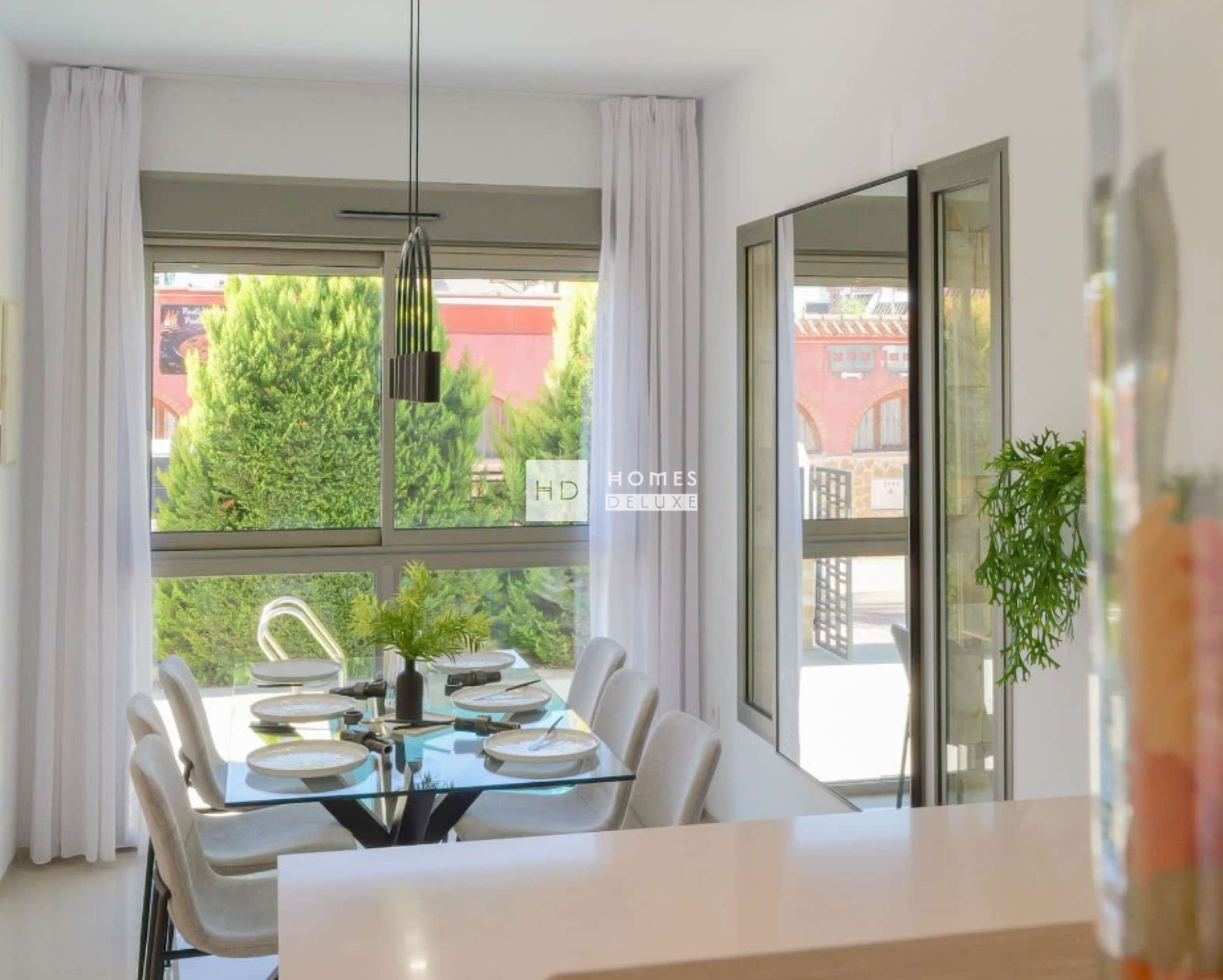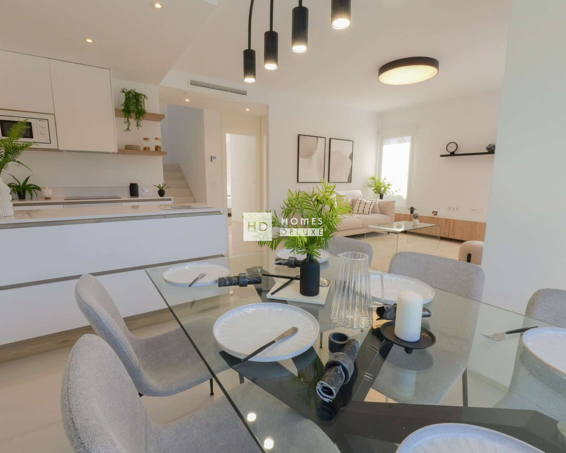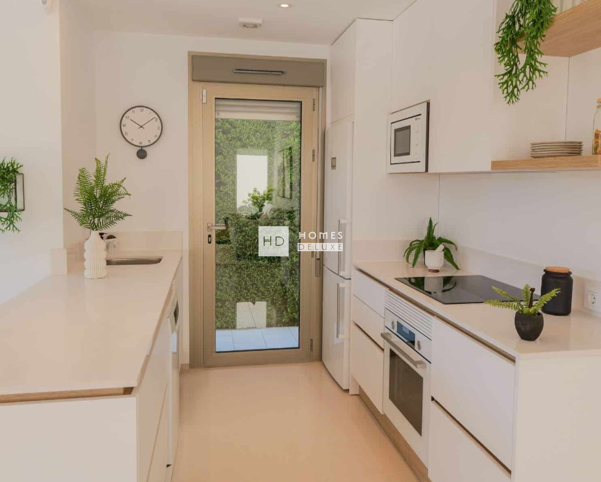 De villa’s zijn verdeeld over twee verdiepingen en de indeling bestaat uit een lichte en ruime open woon- en eetkamer met overal grote ramen die zorgen voor veel natuurlijk licht en uitkomen op het terras en de tuin. In de centrale leefruimte bevindt zich een moderne keuken in Amerikaanse stijl met een kookeiland, en een handige wasruimte onder de trap. Op de begane grond bevinden zich ook een tweepersoonsslaapkamer met inbouwkasten en een aparte gastenbadkamer. De binnentrap leidt u naar de eerste verdieping met de grote hoofdslaapkamer met en-suite badkamer en openslaande deuren naar het mooie zonneterras. Er is nog een ruime tweepersoonsslaapkamer met en-suite badkamer op de eerste verdieping. Het solarium op het dak is bereikbaar via de binnentrap van het pand. De woningen zijn voorzien van voorinstallatie voor airconditioning en vloerverwarming in de badkamers.
