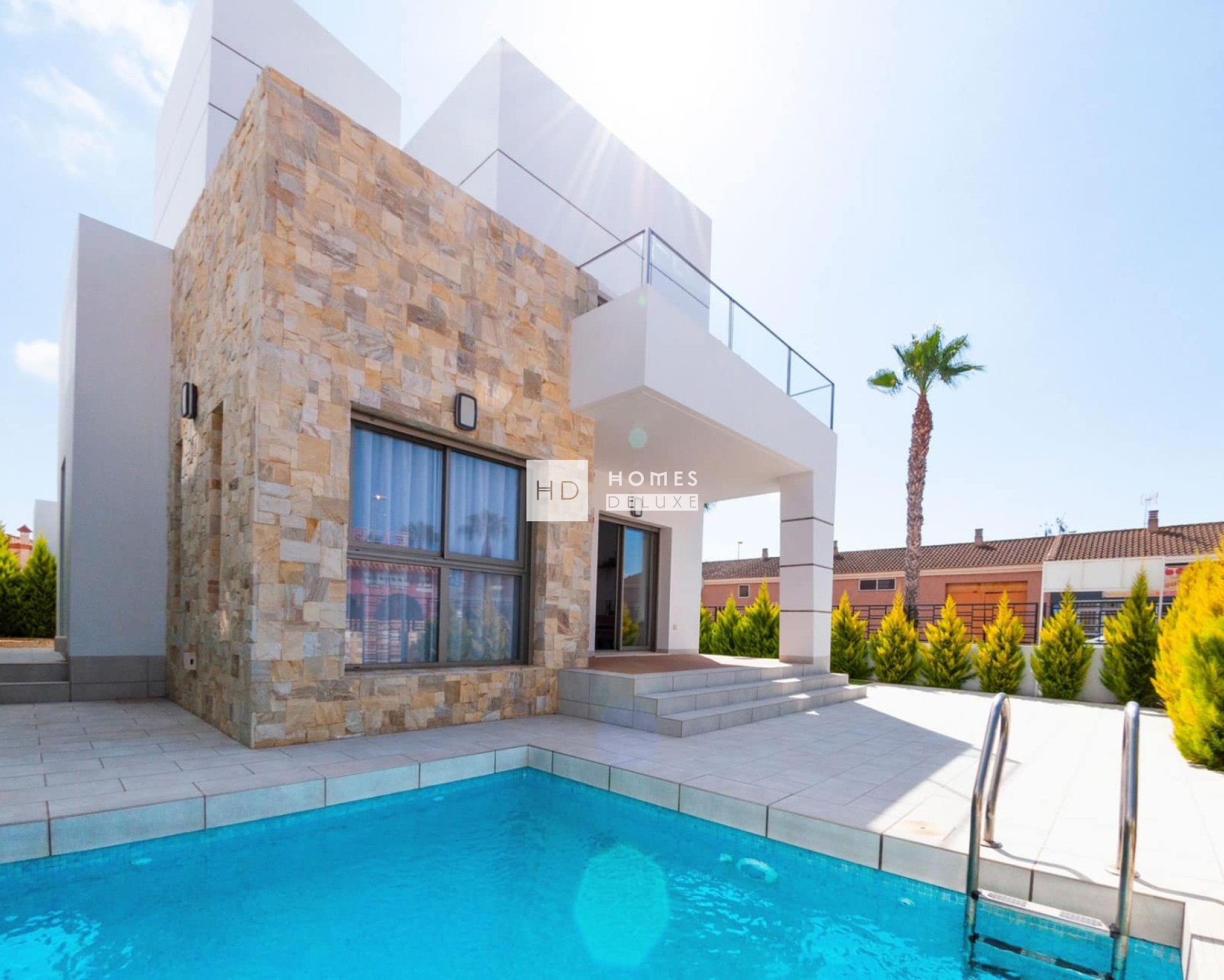 Deze prachtige villa's zijn gebouwd volgens hoge kwaliteitsnormen, met luxe afwerkingen en een eigentijds ontwerp met karakteristieke stenen muren. De buitenkant haalt het beste uit het buitenleven in Spanje met een mooie privétuin met een uitnodigend privézwembad en plekken om te ontspannen en tot rust te komen. De buitenruimte wordt verder uitgebreid met een zonneterras op de eerste verdieping en een ruim dakterras van 30 m², waar u de hele dag van de zon kunt genieten. De villa's beschikken over een eigen garage en een aparte parkeerplaats op het perceel.