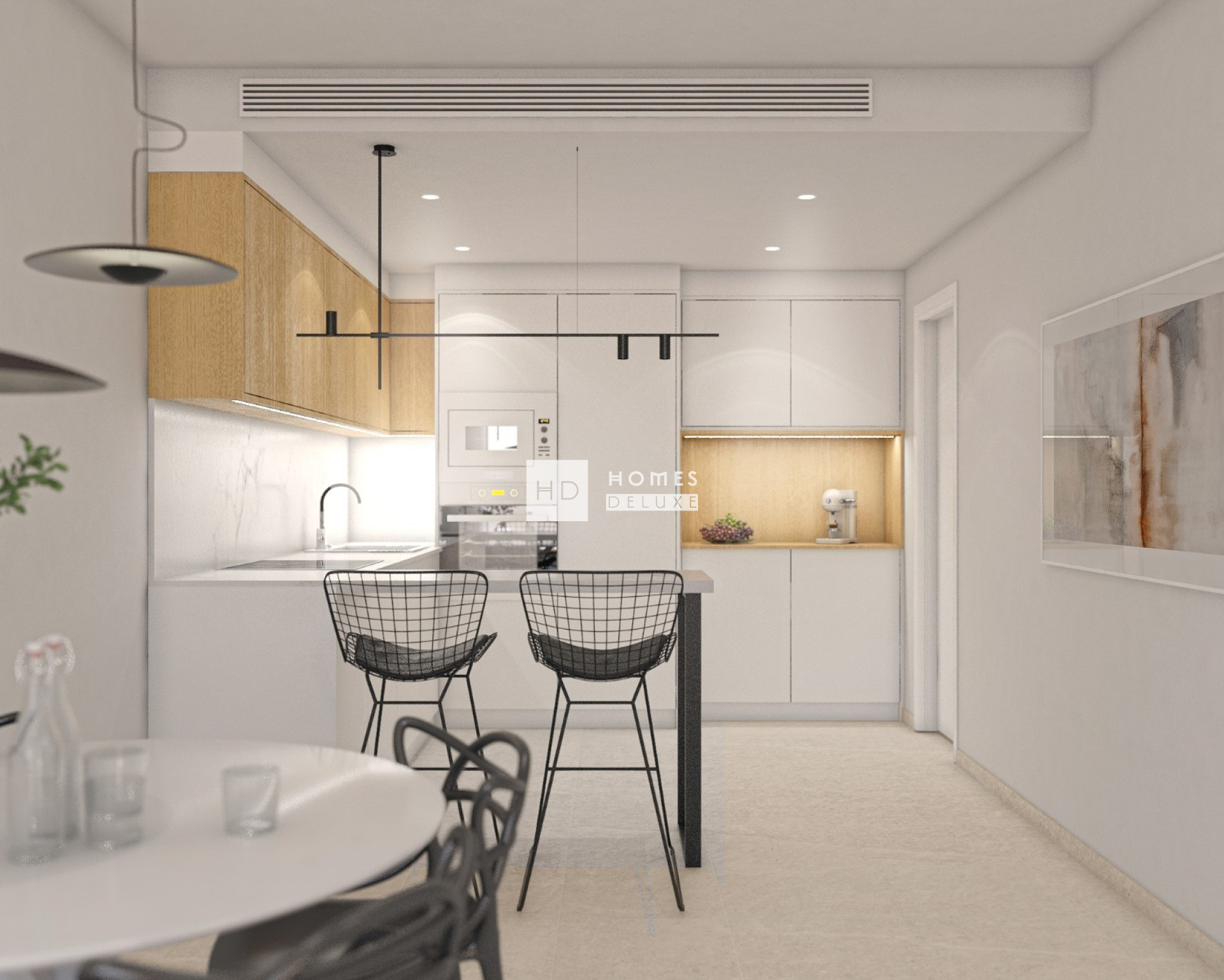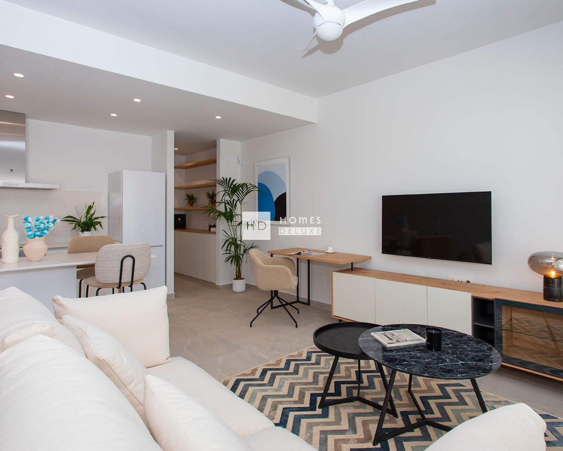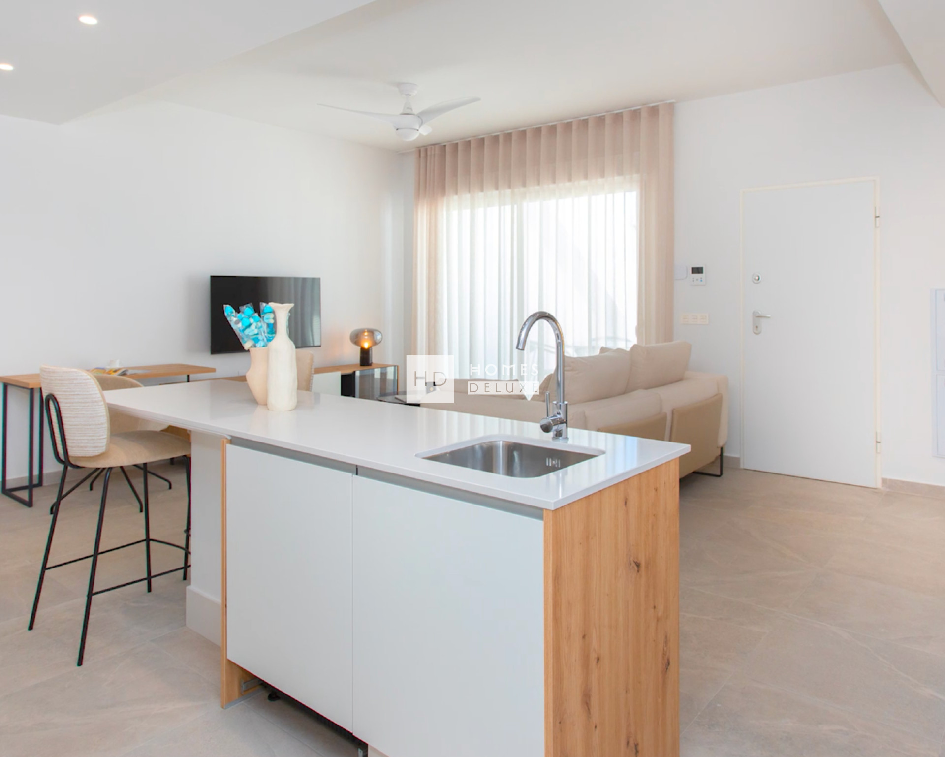 De indeling bestaat uit een ruime open woon- en eetkamer met grote ramen die uitkomen op het privéterras. In de woonkamer bevindt zich een volledig ingerichte keuken in Amerikaanse stijl met een ontbijtbar (afhankelijk van het type appartement beschikken sommige over een aparte bijkeuken). De grote slaapkamer heeft een openslaande deur naar het terras en is voorzien van een eigen badkamer. De appartementen op de bovenste verdieping hebben een buitentrap op het terras die naar het ruime dakterras leidt, waar u de hele dag van de zon kunt genieten.