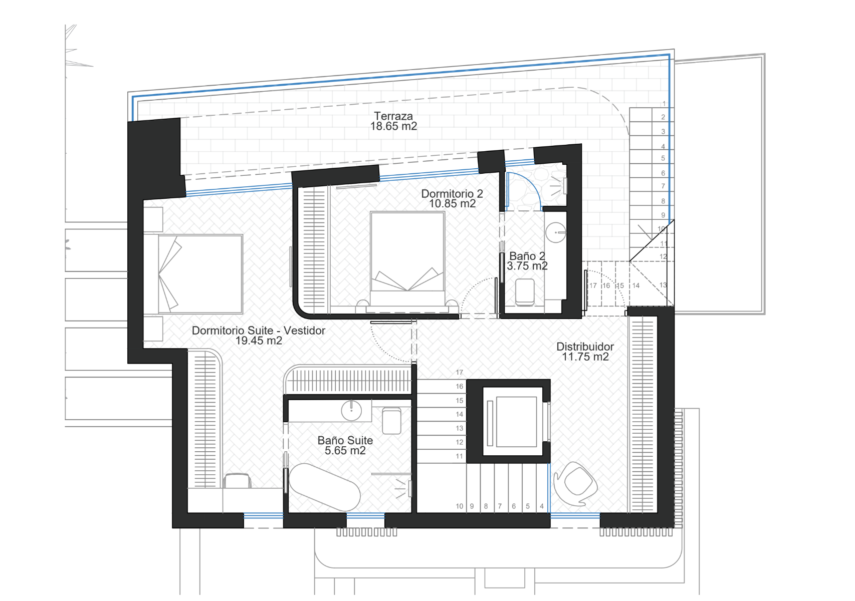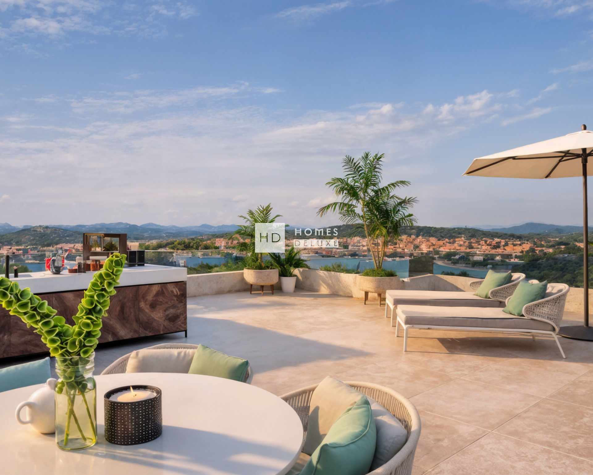Op de bovenste verdieping van de villa biedt een prachtig solarium van 75 m² een panoramisch uitzicht op de Middellandse Zee, de perfecte achtergrond voor cocktails bij zonsondergang en avonden onder de sterrenhemel. Elk detail in het huis straalt kwaliteit uit, van de designkeukens en -badkamers tot de hoogwaardige ledverlichting die in elke kamer is geïntegreerd.