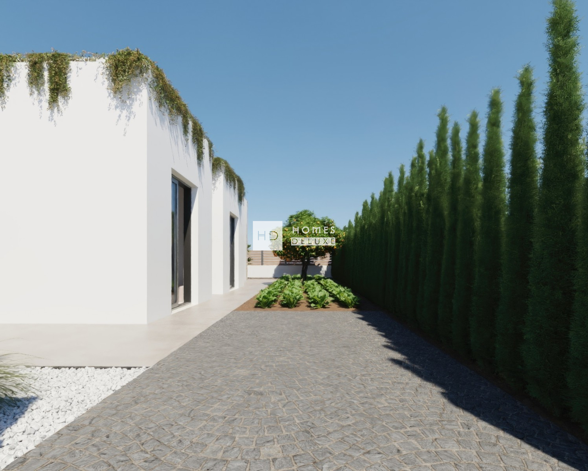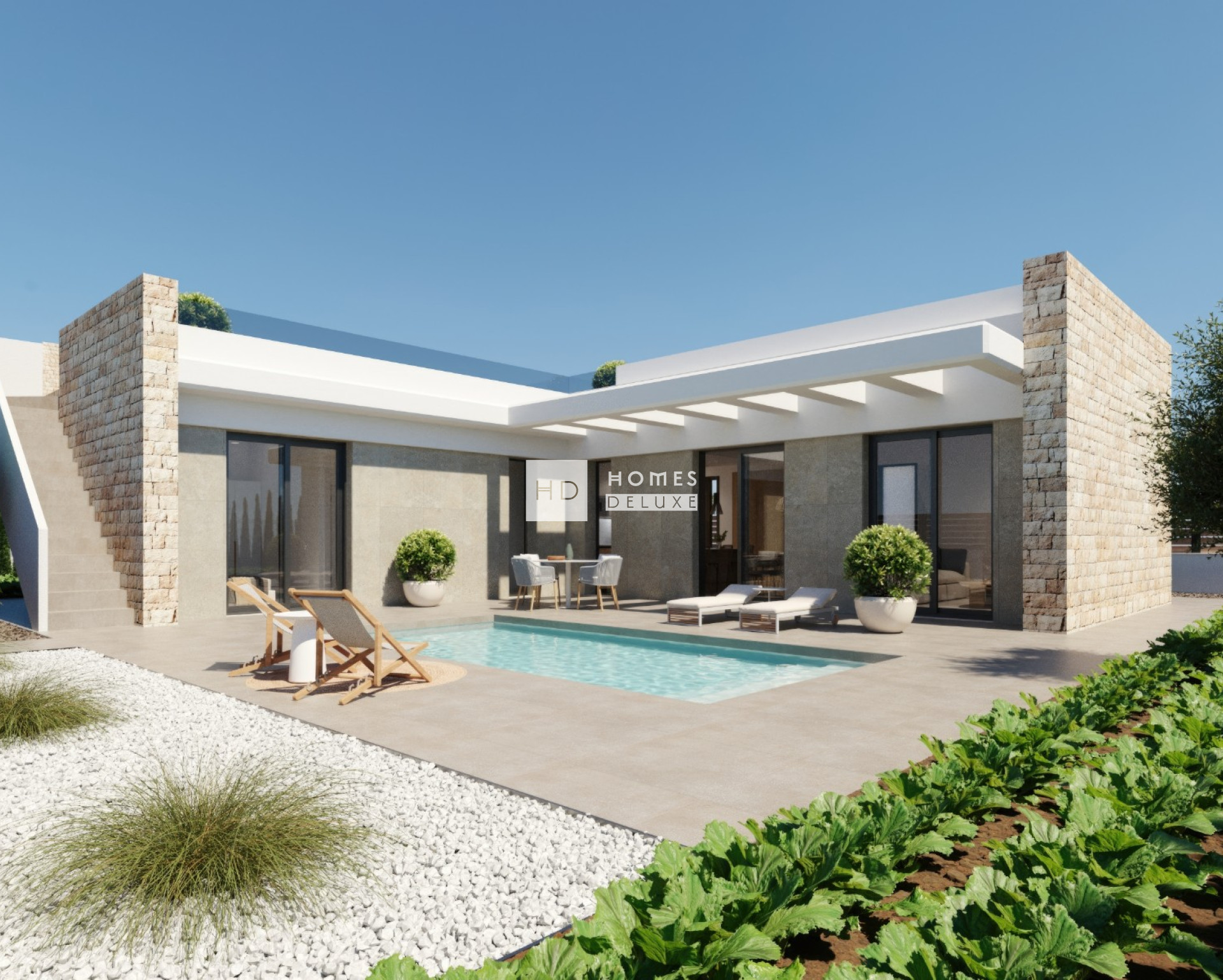 De villa's zijn ontworpen met een prachtige “L”-vormige indeling en het interieur bestaat uit een hal die leidt naar de ruime open woon- en eetkamer met verschillende grote ramen die zorgen voor maximaal natuurlijk licht en toegang geven tot het terras en de tuin. In de belangrijkste leefruimte bevindt zich een moderne keuken in Amerikaanse stijl, afgewerkt in strak wit met een kookeiland. Aan de andere kant van de villa bevindt zich het slaapgedeelte, met een ruime hoofdslaapkamer met en-suite badkamer en openslaande deuren naar het hoofdterras. Er zijn nog twee ruime tweepersoonsslaapkamers en een aparte gastenbadkamer. Een buitentrap aan de zijkant van het pand leidt u naar het uitgestrekte dakterras van 63 m².