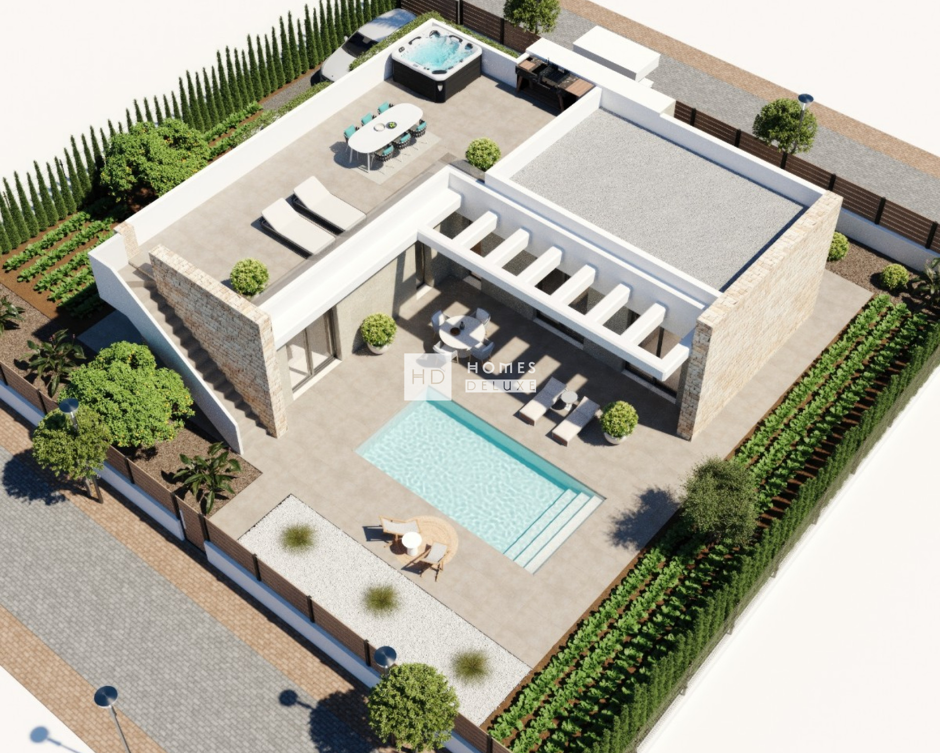 Alle woningen worden opgeleverd met materialen van topkwaliteit en oog voor detail. De woningen zijn voorzien van een aansluiting voor centrale airconditioning, inbouwkasten in alle slaapkamers, led-verlichting binnen en buiten, een video-intercomsysteem, een privézwembad van 2,4 x 6 m en een eigen parkeerplaats op het perceel.