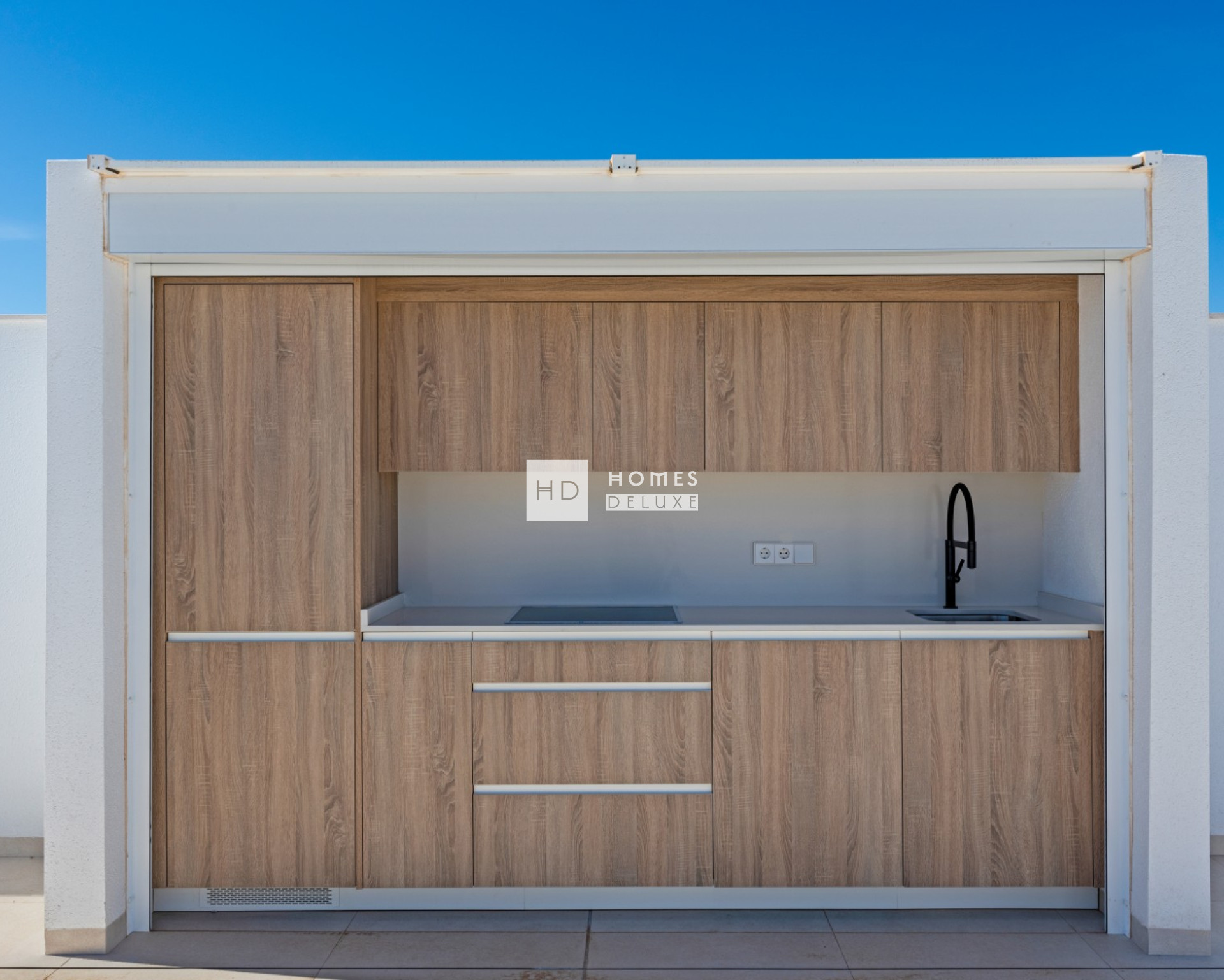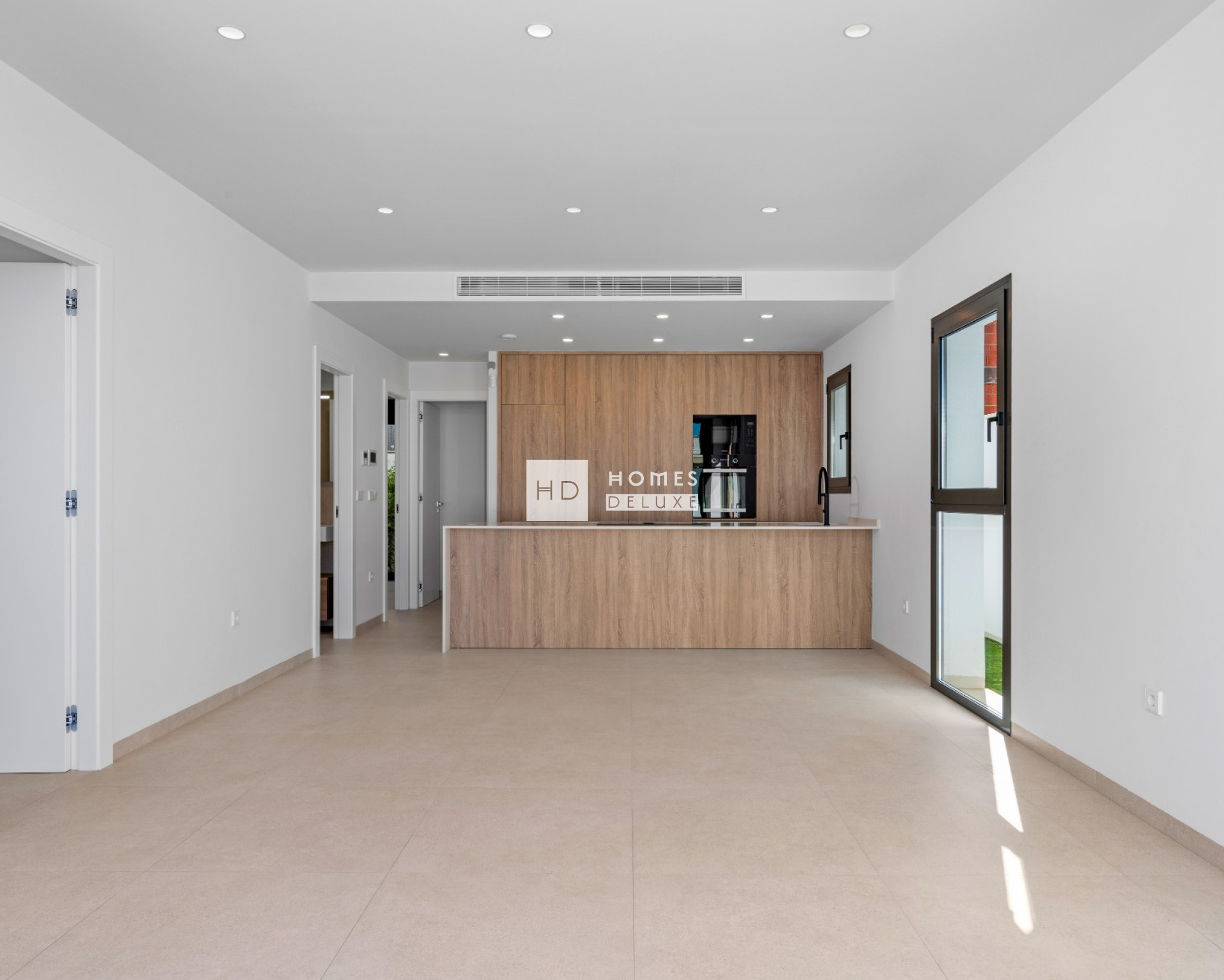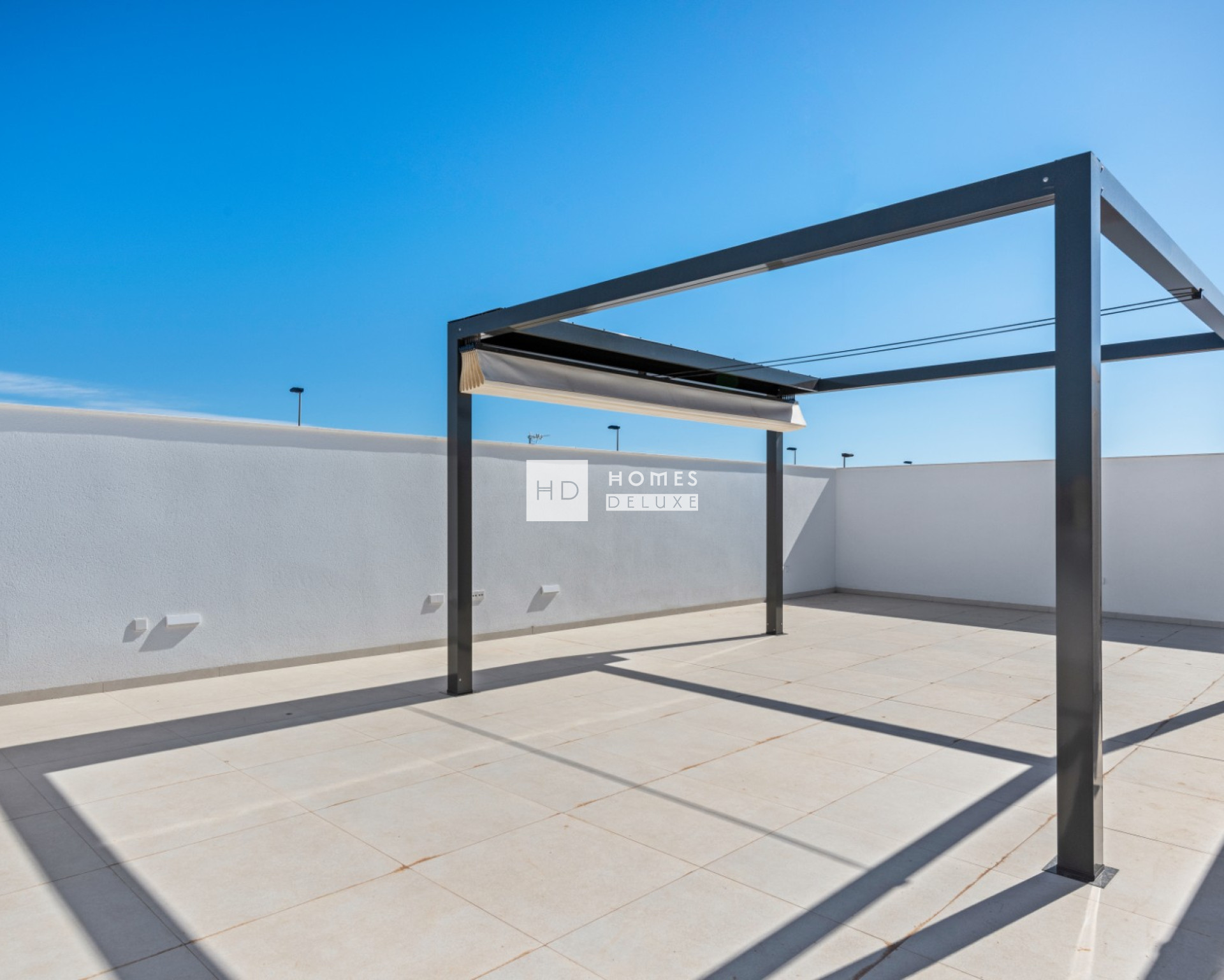 De indeling van de villa bestaat uit een lichte open lounge en eetkamer met grote openslaande deuren die toegang geven tot het terras, volledig ingerichte moderne Amerikaanse keuken, grote slaapkamer met en-suite badkamer, nog twee tweepersoons slaapkamers en een aparte gastenbadkamer. Elke slaapkamer heeft openslaande deuren naar het terras aan de voorzijde of de tuin aan de achterzijde van het pand. De buitentrap leidt u naar het uitgebreide dakterras om de hele dag van de zon te genieten.