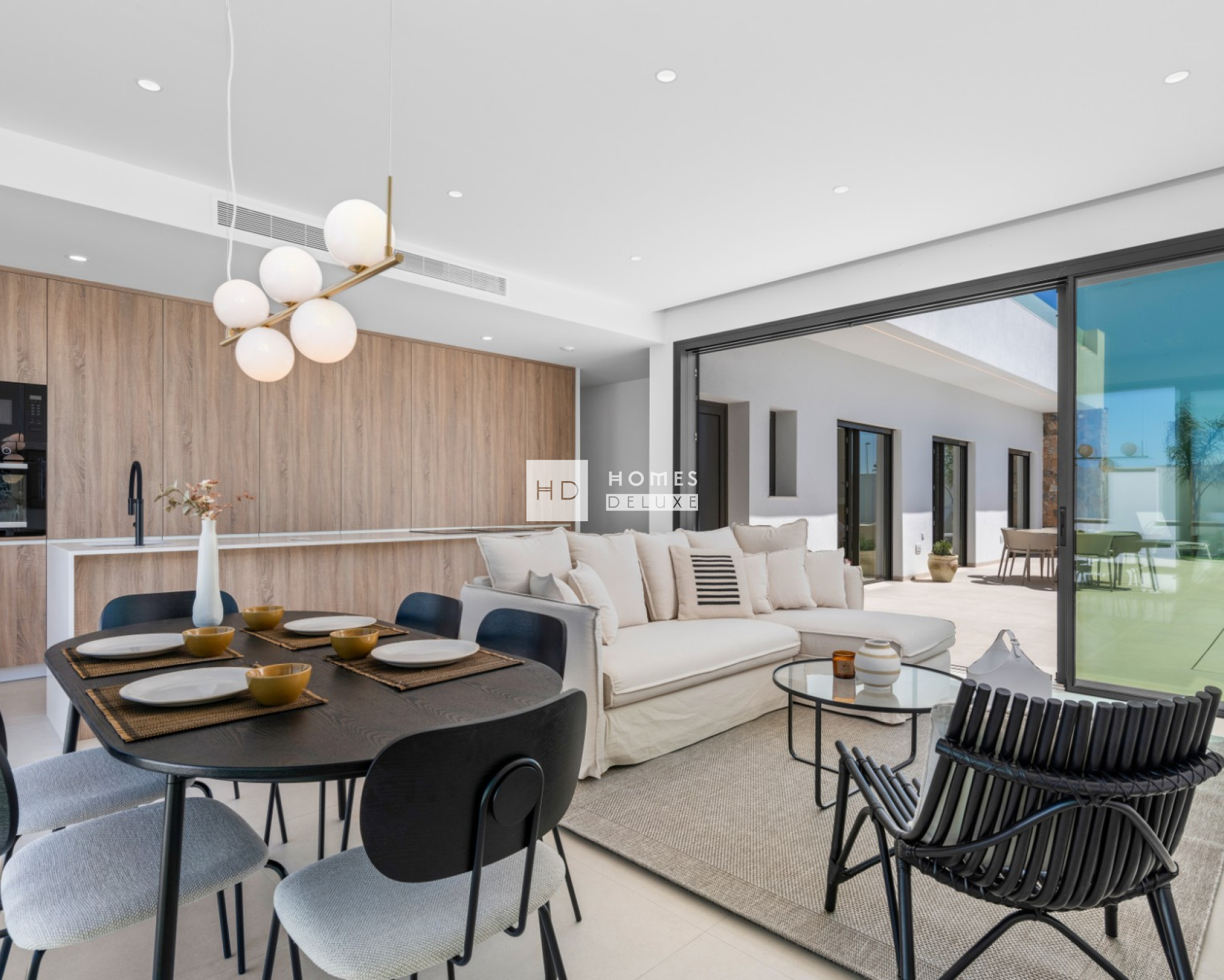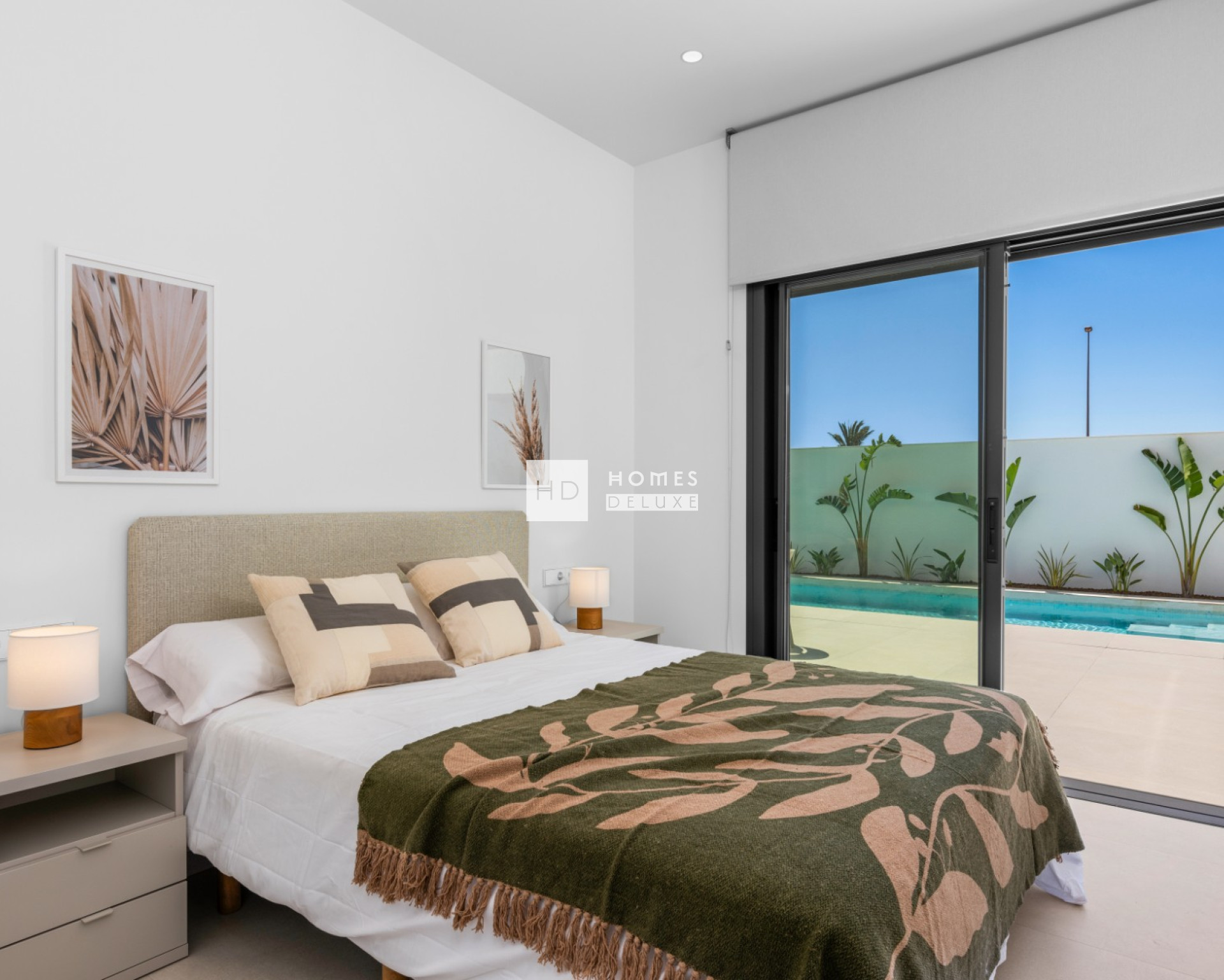 De indeling van de villa is ontworpen in een "L" vorm en bestaat uit een hal die leidt naar de lichte open lounge en eetkamer met extra grote openslaande deuren aan weerszijden van het pand die toegang geven tot het terras en de tuin, volledig ingerichte moderne Amerikaanse keuken met aparte bijkeuken / berging en gastentoilet. De villa is zo ontworpen dat de hoofdslaapkamer met en-suite badkamer en inloopkast / kleedruimte aan de ene kant van de villa ligt en nog twee tweepersoonsslaapkamers en een aparte gastenbadkamer aan de andere kant van de villa, zodat u uw eigen privacy heeft als er gasten komen logeren. Alle slaapkamers hebben openslaande deuren naar het terras en het zwembad.