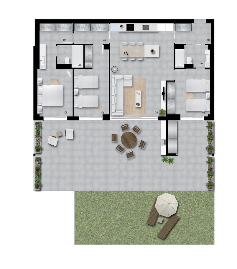 The project is committed to renewable energies, landscape integration and sustainable mobility. Therefore, you can charge your vehicle and your electric bicycle at the charging points set up for it. In addition, in the garden areas there are native species to minimise irrigation and environmentally friendly materials.
