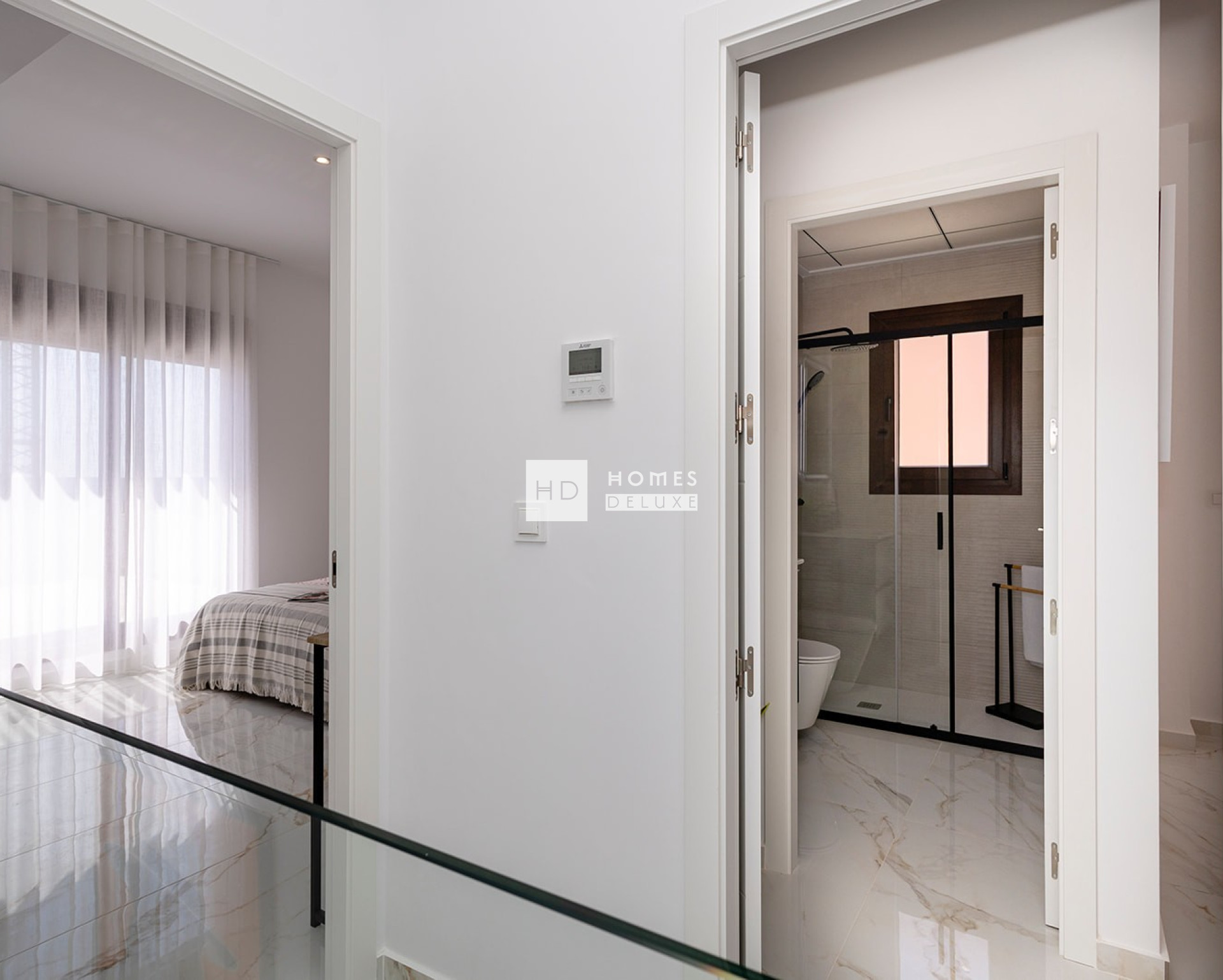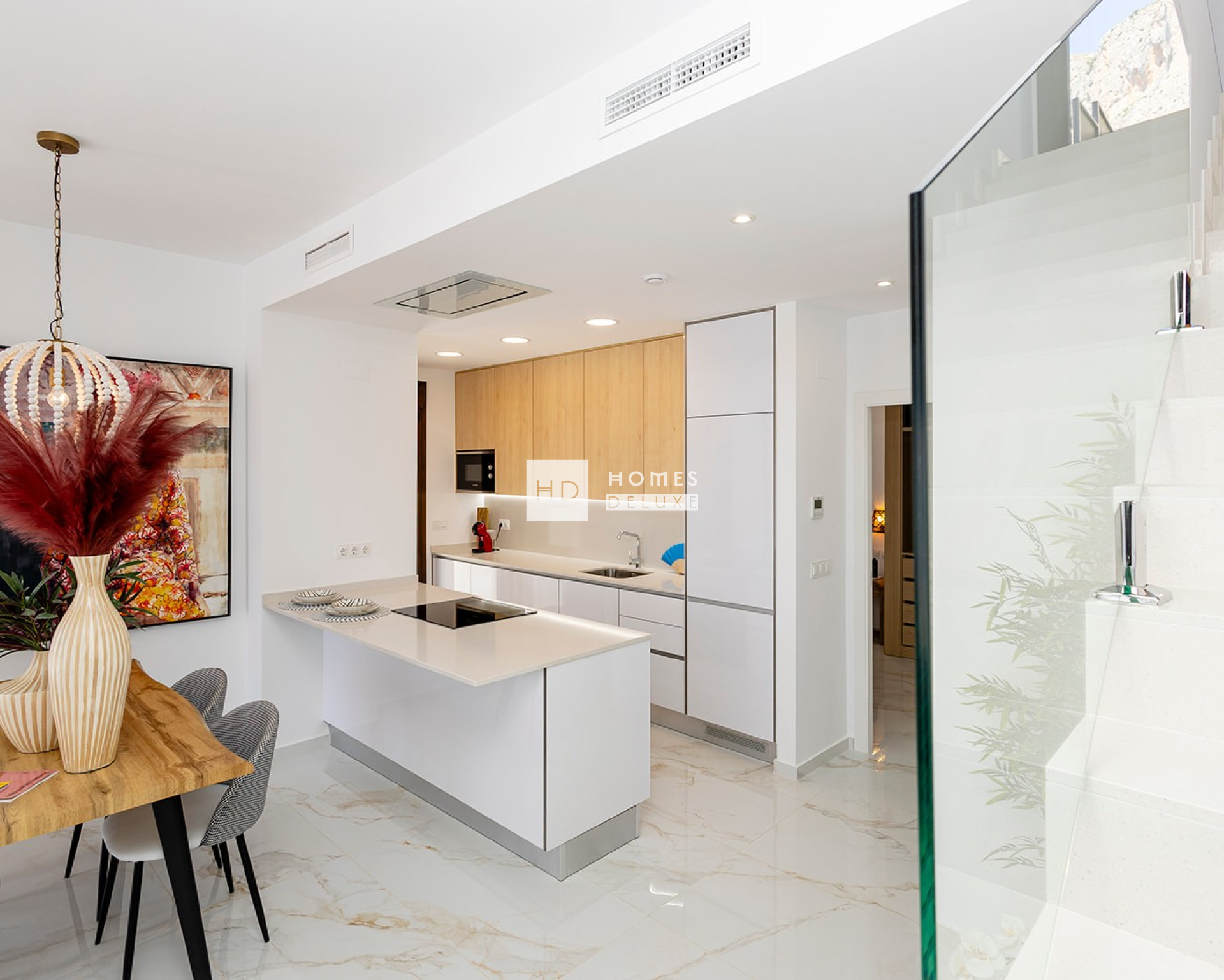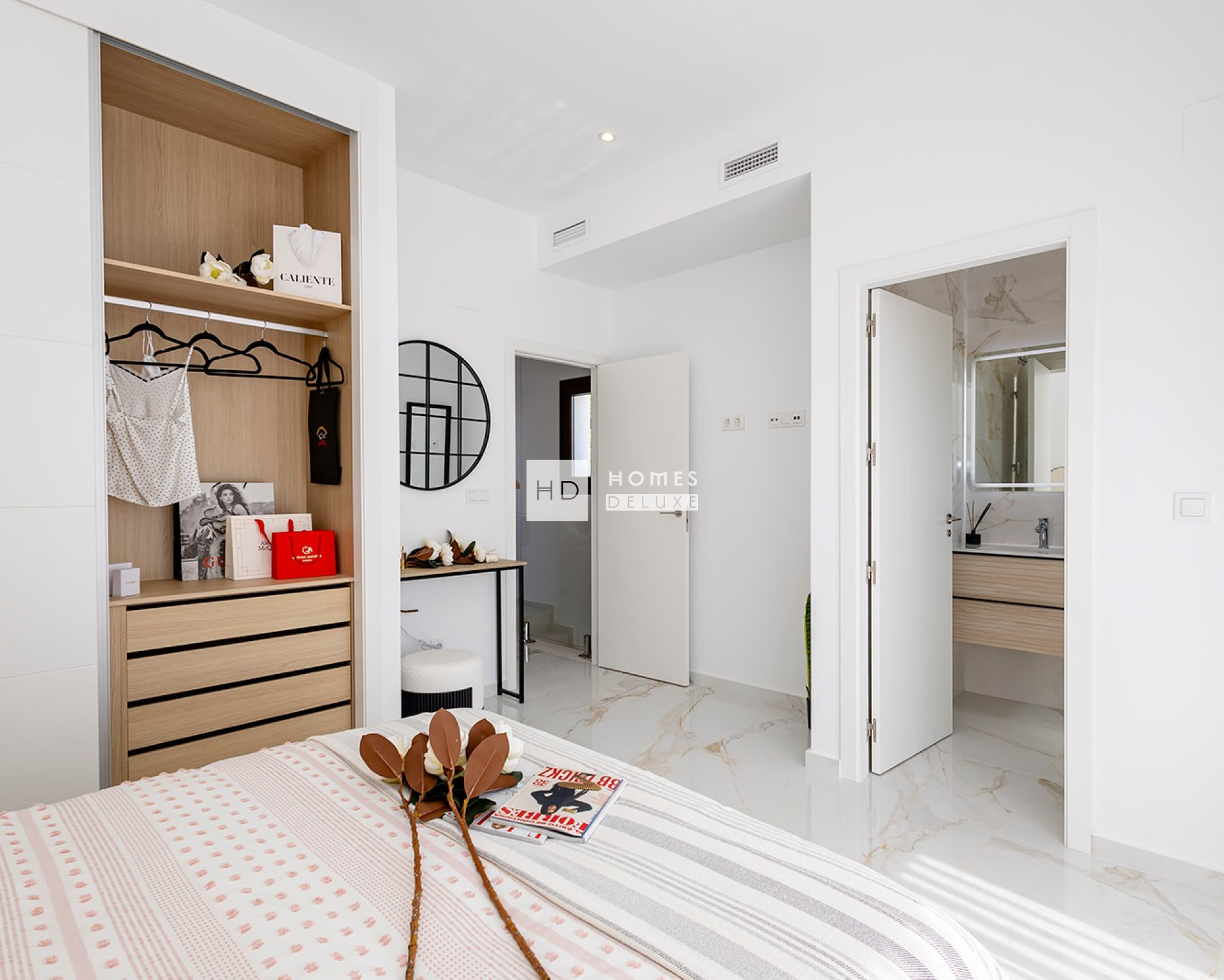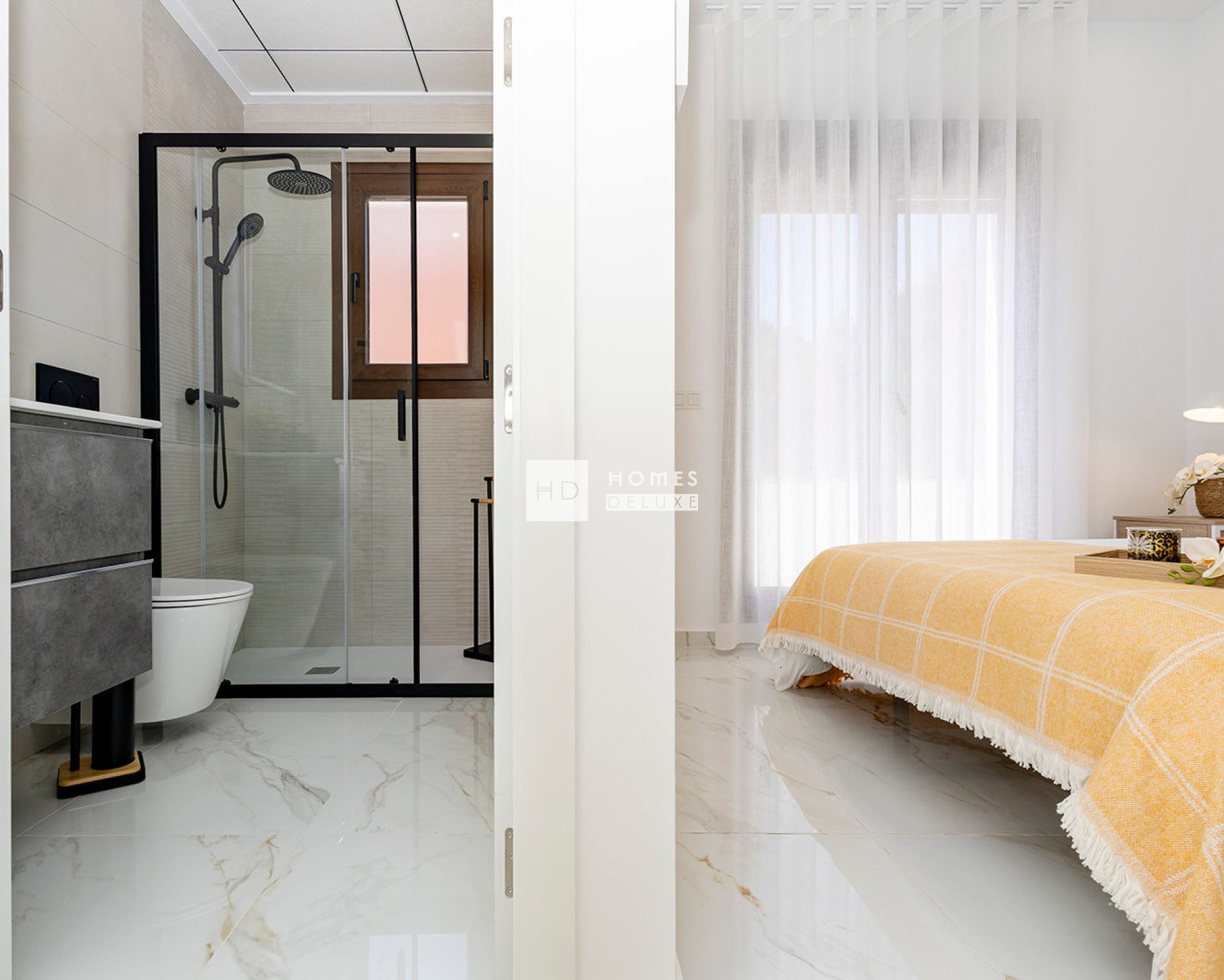 This particular villa model is over two levels and has an optional rooftop solarium. The interior layout comprises of a bright and spacious open plan lounge and dining area with large windows which open on to the terrace. Within the main living space is a modern American style kitchen equipped with low and high cupboard space plus a compact quartz worktop. The ground floor level also includes a large double bedroom with en-suite bathroom and a dressing area, and there is also a separate guest toilet. The interior staircase leads you to the first floor level with the Primary bedroom with en-suite bathroom which has access to a private sun terrace of 28m2 overlooking the pool and garden. There is another good sized double bedroom with en-suite bathroom which has private access to a smaller terrace. The optional solarium can be accessed via an exterior staircase from the rear of the property on the first floor level. The 46m2 solarium allows you to extend the outdoor living space where you can enjoy the sun all day long.