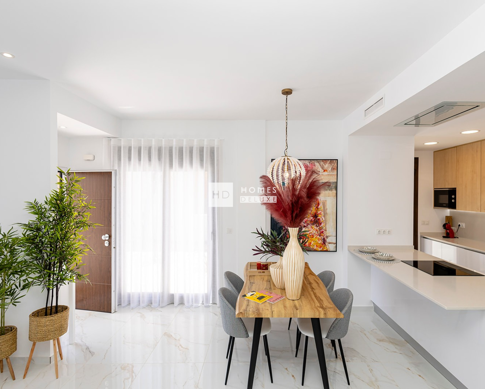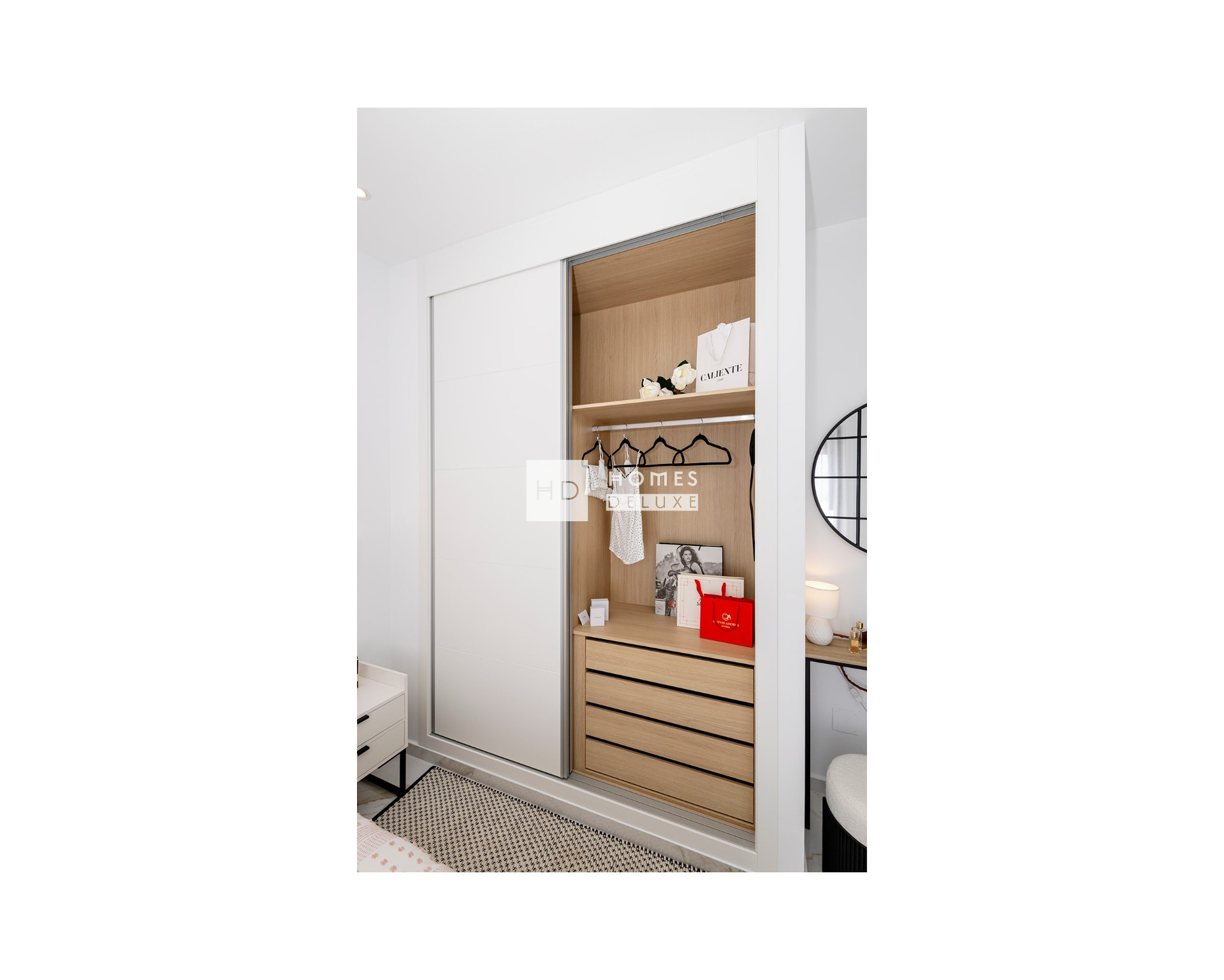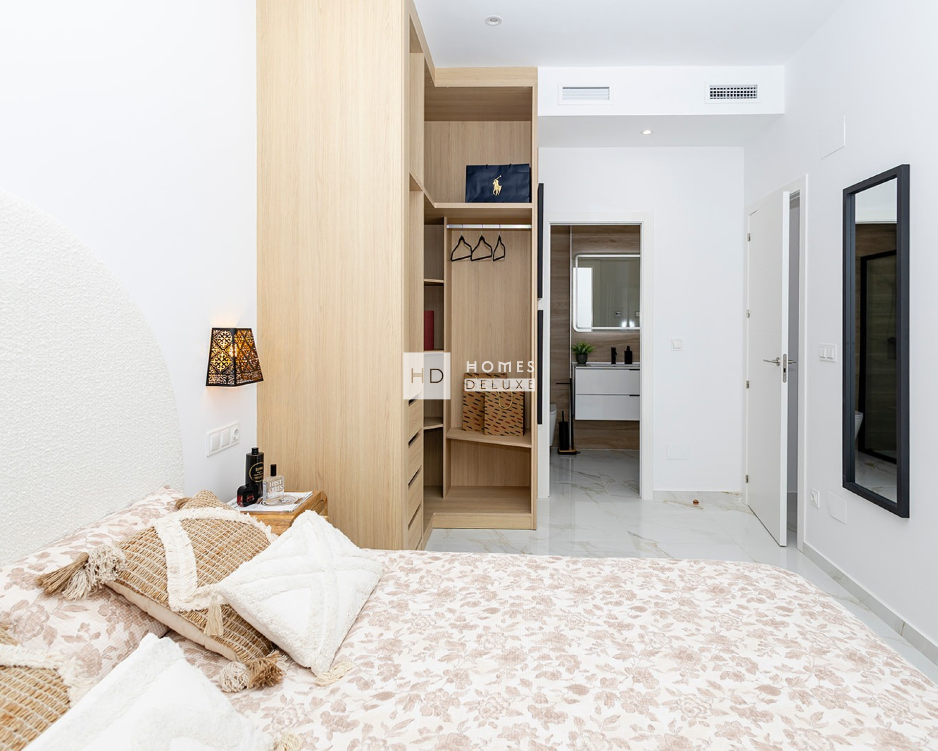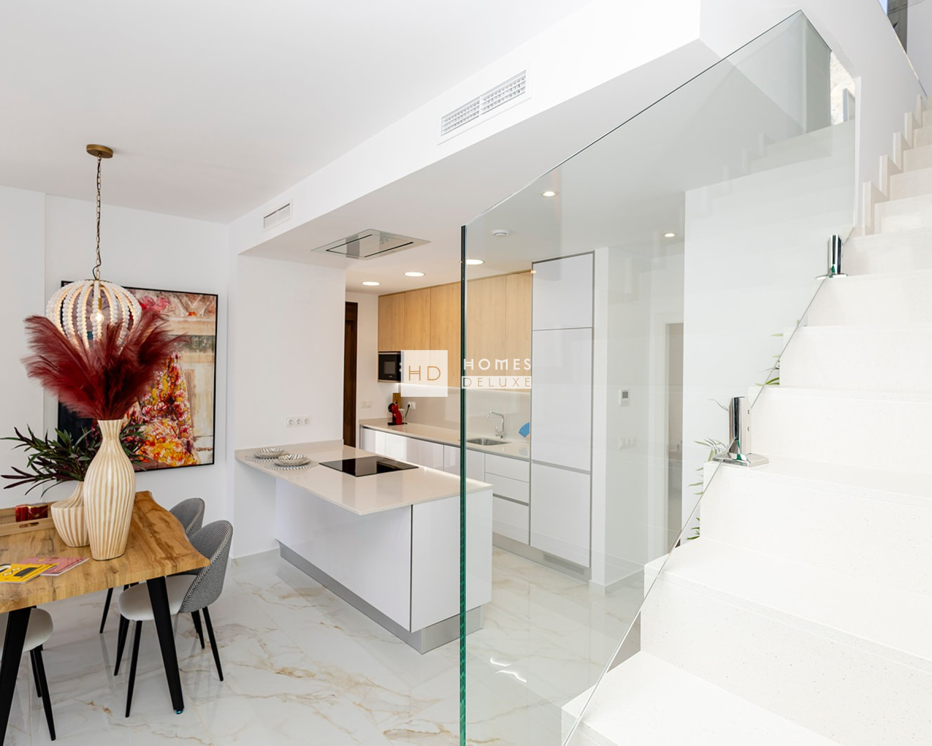 This particular villa model is over two levels and has an optional rooftop solarium. The interior layout comprises of a bright and spacious open plan lounge and dining area with large windows which open on to the terrace. Within the main living space is a modern American style kitchen equipped with low and high cupboard space plus a compact quartz worktop. The ground floor level also includes a large double bedroom with en-suite bathroom and a dressing area, and there is also a separate guest toilet. The interior staircase leads you to the first floor level with the Primary bedroom with en-suite bathroom which has access to a private sun terrace of 28m2 overlooking the pool and garden. There is another good sized double bedroom with en-suite bathroom which has private access to a smaller terrace. The optional solarium can be accessed via an exterior staircase from the rear of the property on the first floor level. The 46m2 solarium allows you to extend the outdoor living space where you can enjoy the sun all day long.