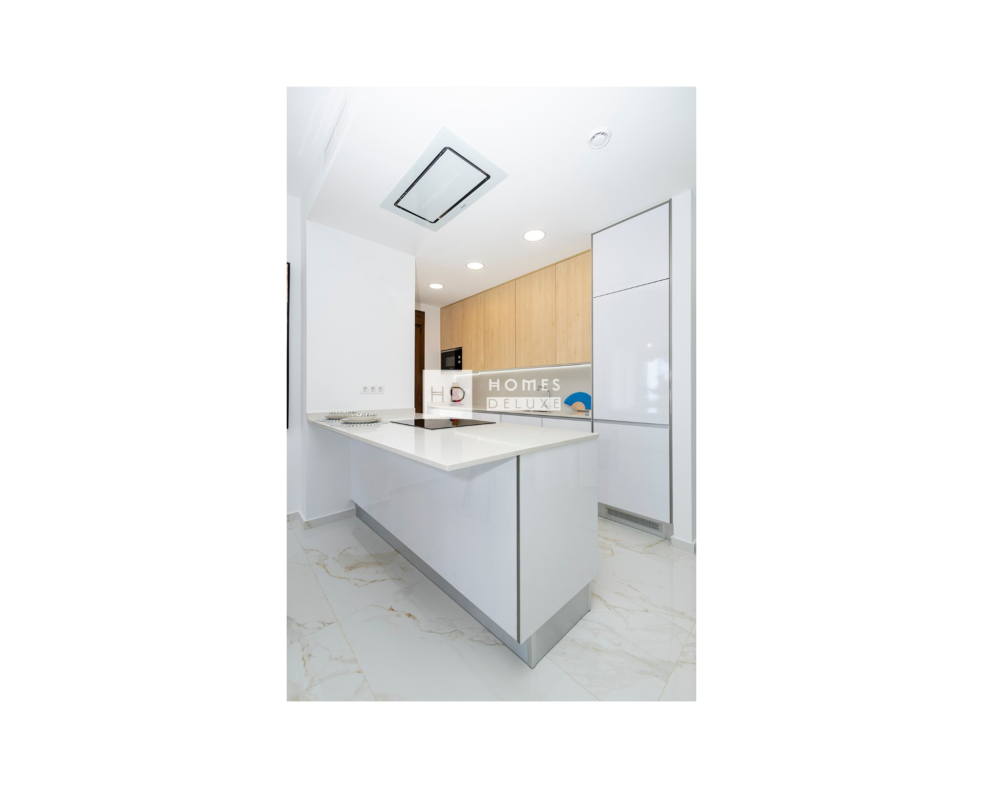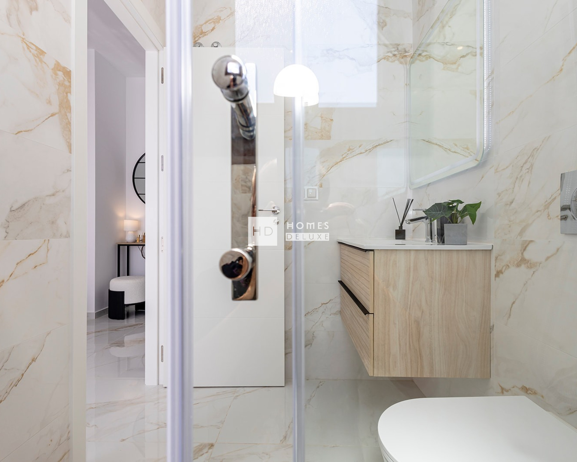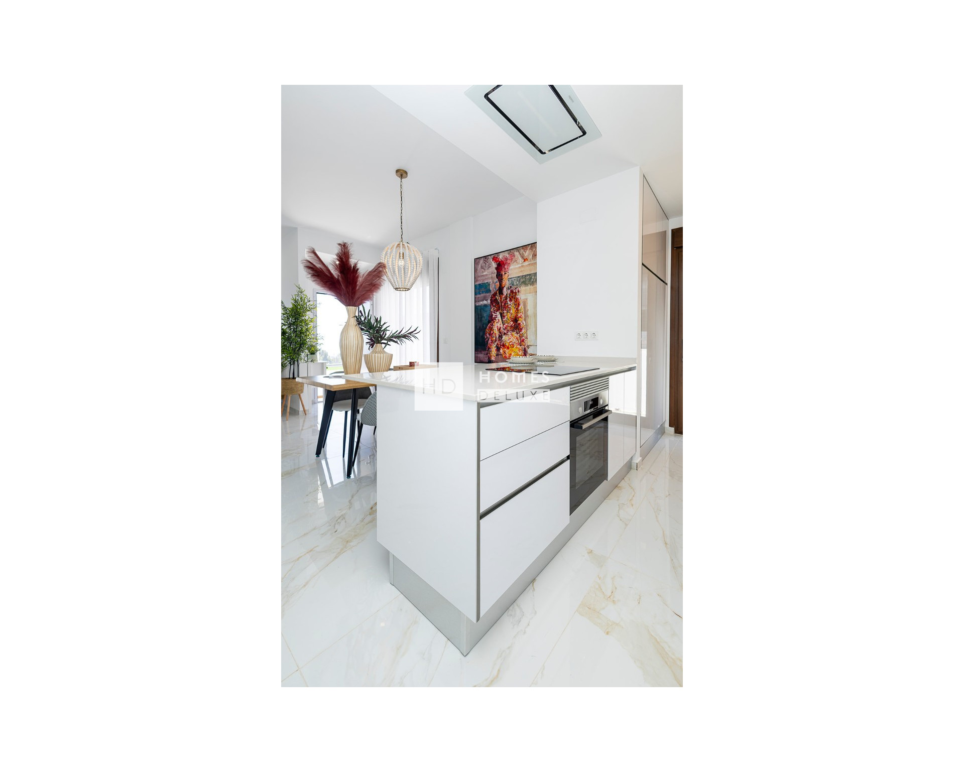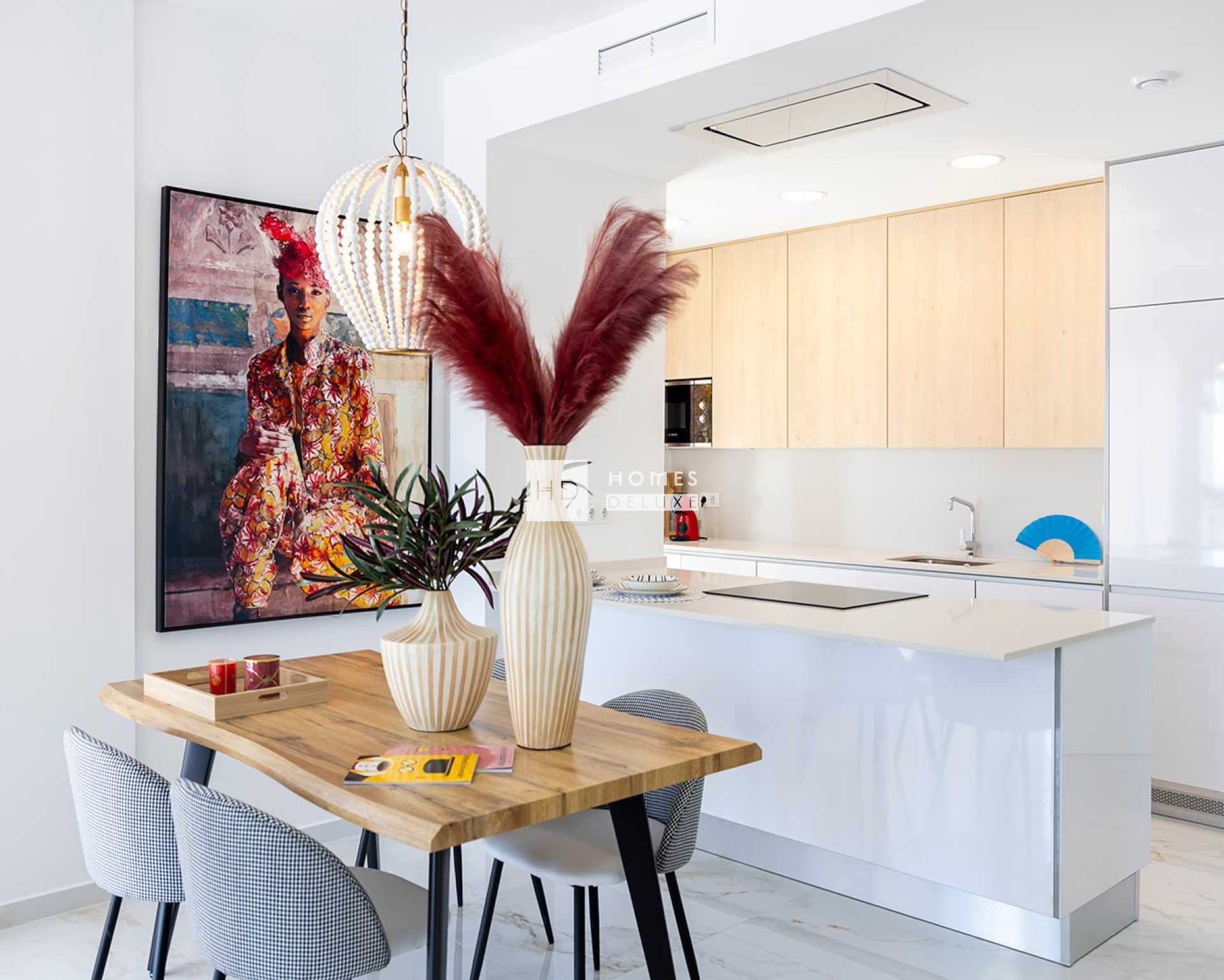 This particular villa model is over two levels and has an optional rooftop solarium. The interior layout comprises of a bright and spacious open plan lounge and dining area with large windows which open on to the terrace. Within the main living space is a modern American style kitchen equipped with low and high cupboard space plus a compact quartz worktop. The ground floor level also includes a large double bedroom with en-suite bathroom and a dressing area, and there is also a separate guest toilet. The interior staircase leads you to the first floor level with the Primary bedroom with en-suite bathroom which has access to a private sun terrace of 28m2 overlooking the pool and garden. There is another good sized double bedroom with en-suite bathroom which has private access to a smaller terrace. The optional solarium can be accessed via an exterior staircase from the rear of the property on the first floor level. The 46m2 solarium allows you to extend the outdoor living space where you can enjoy the sun all day long.