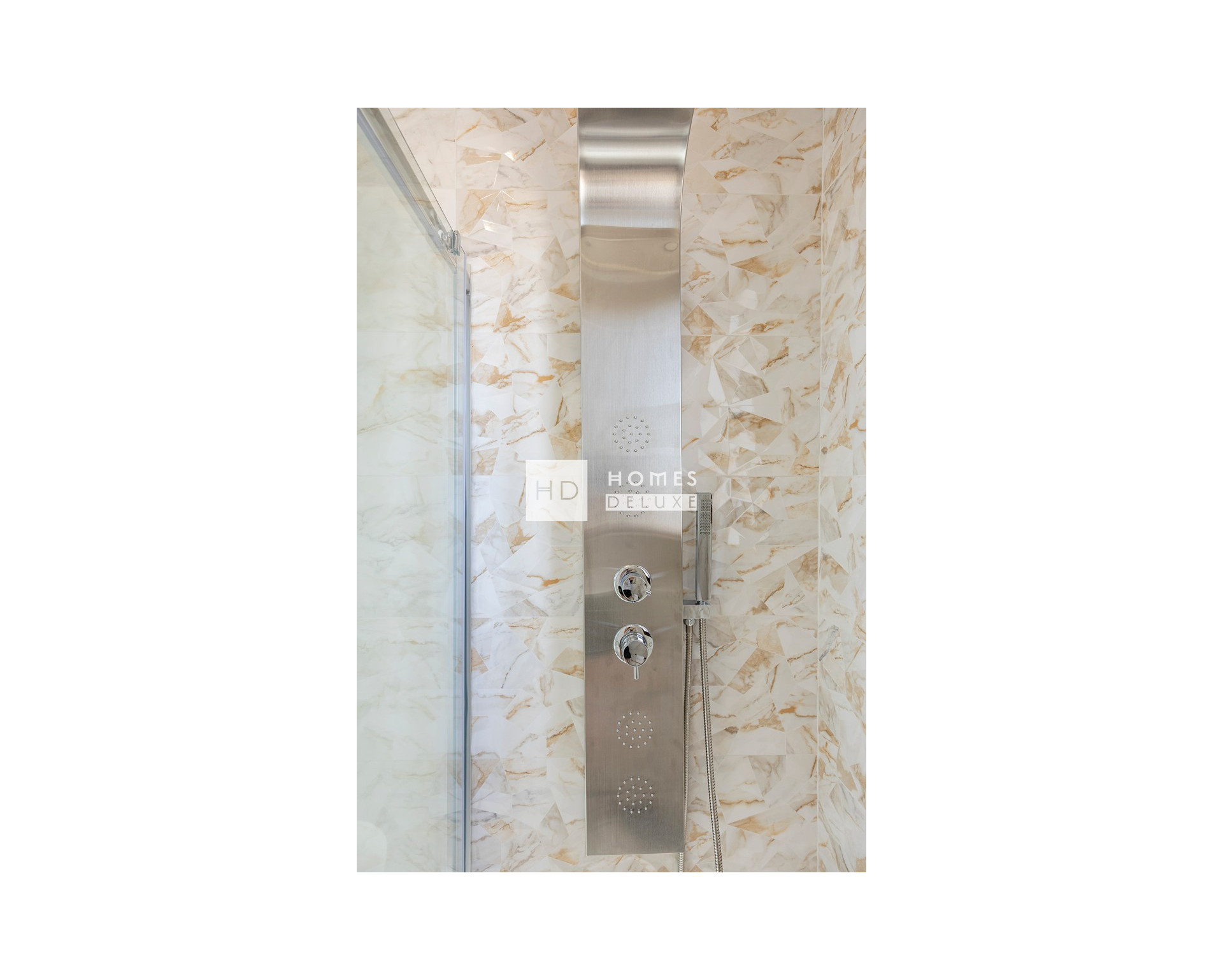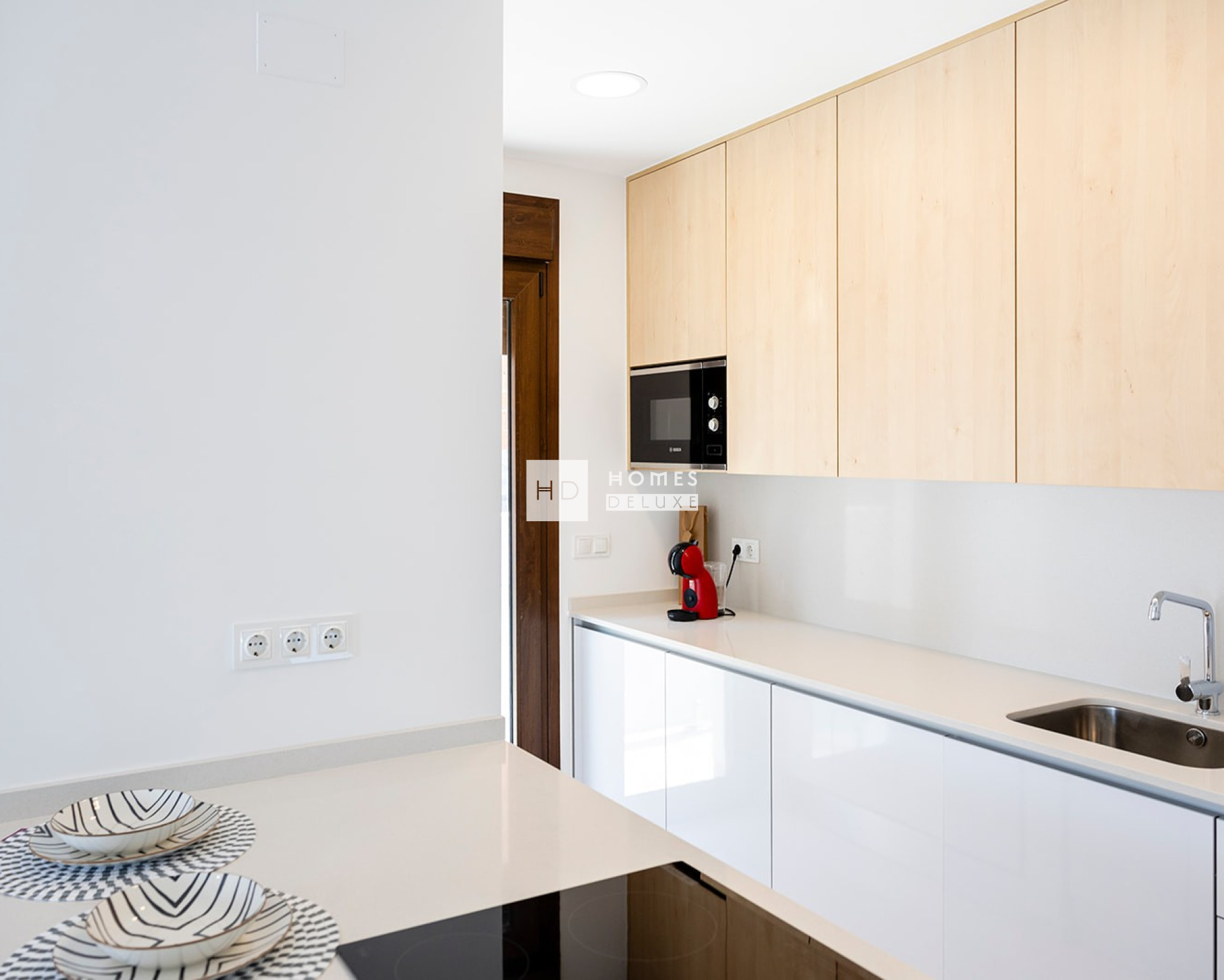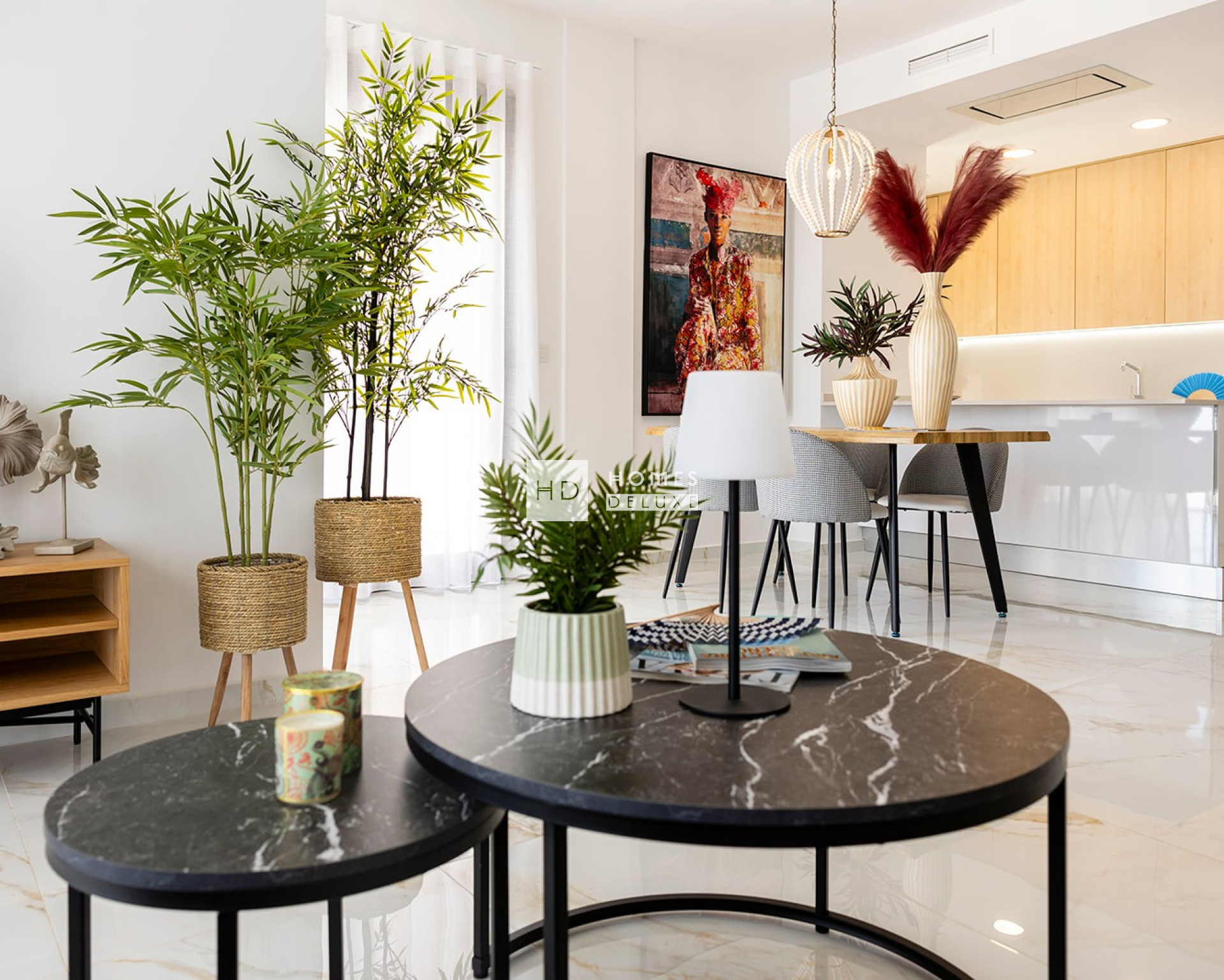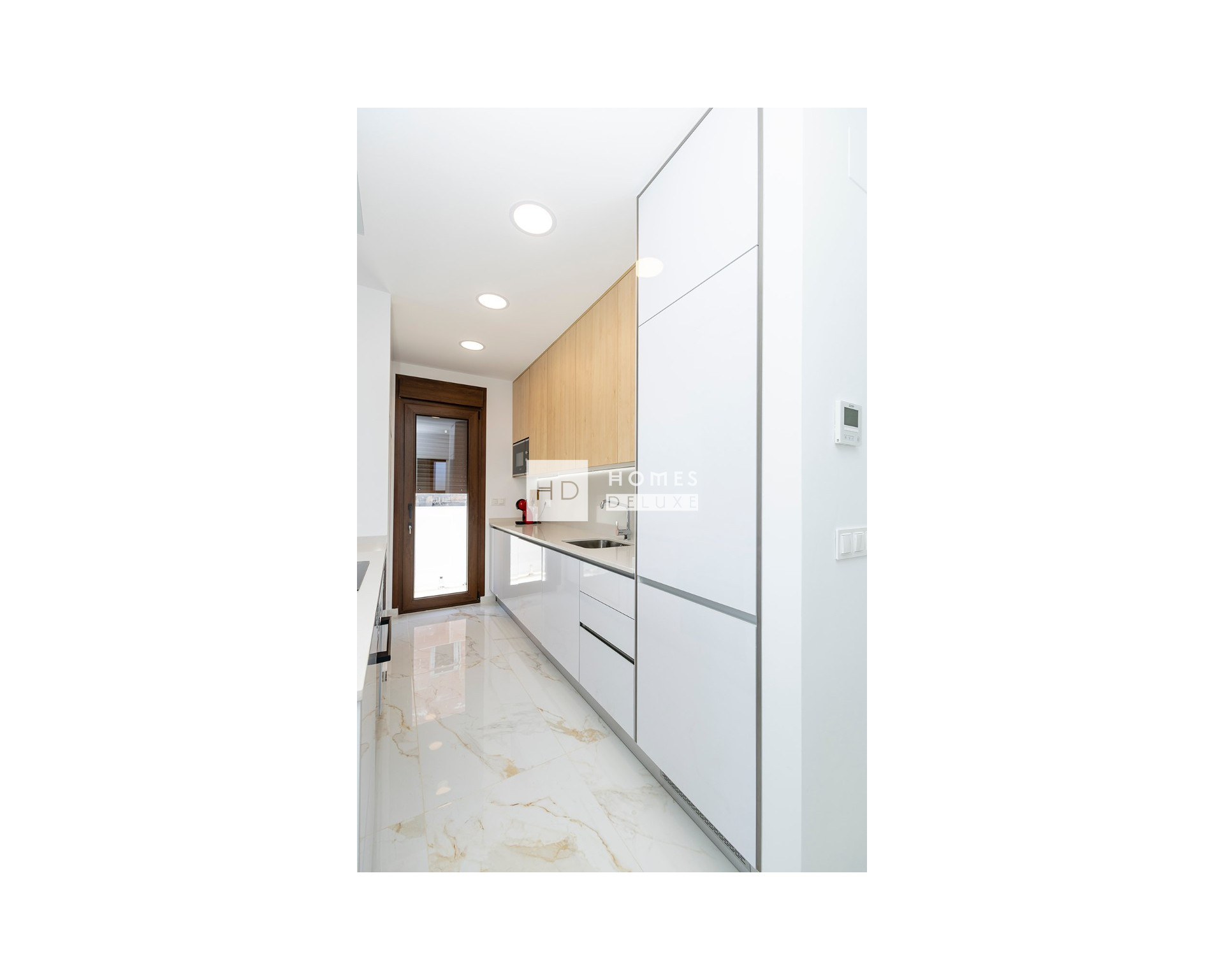 This particular villa model is over two levels and has an optional rooftop solarium. The interior layout comprises of a bright and spacious open plan lounge and dining area with large windows which open on to the terrace. Within the main living space is a modern American style kitchen equipped with low and high cupboard space plus a compact quartz worktop. The ground floor level also includes a large double bedroom with en-suite bathroom and a dressing area, and there is also a separate guest toilet. The interior staircase leads you to the first floor level with the Primary bedroom with en-suite bathroom which has access to a private sun terrace of 28m2 overlooking the pool and garden. There is another good sized double bedroom with en-suite bathroom which has private access to a smaller terrace. The optional solarium can be accessed via an exterior staircase from the rear of the property on the first floor level. The 46m2 solarium allows you to extend the outdoor living space where you can enjoy the sun all day long.