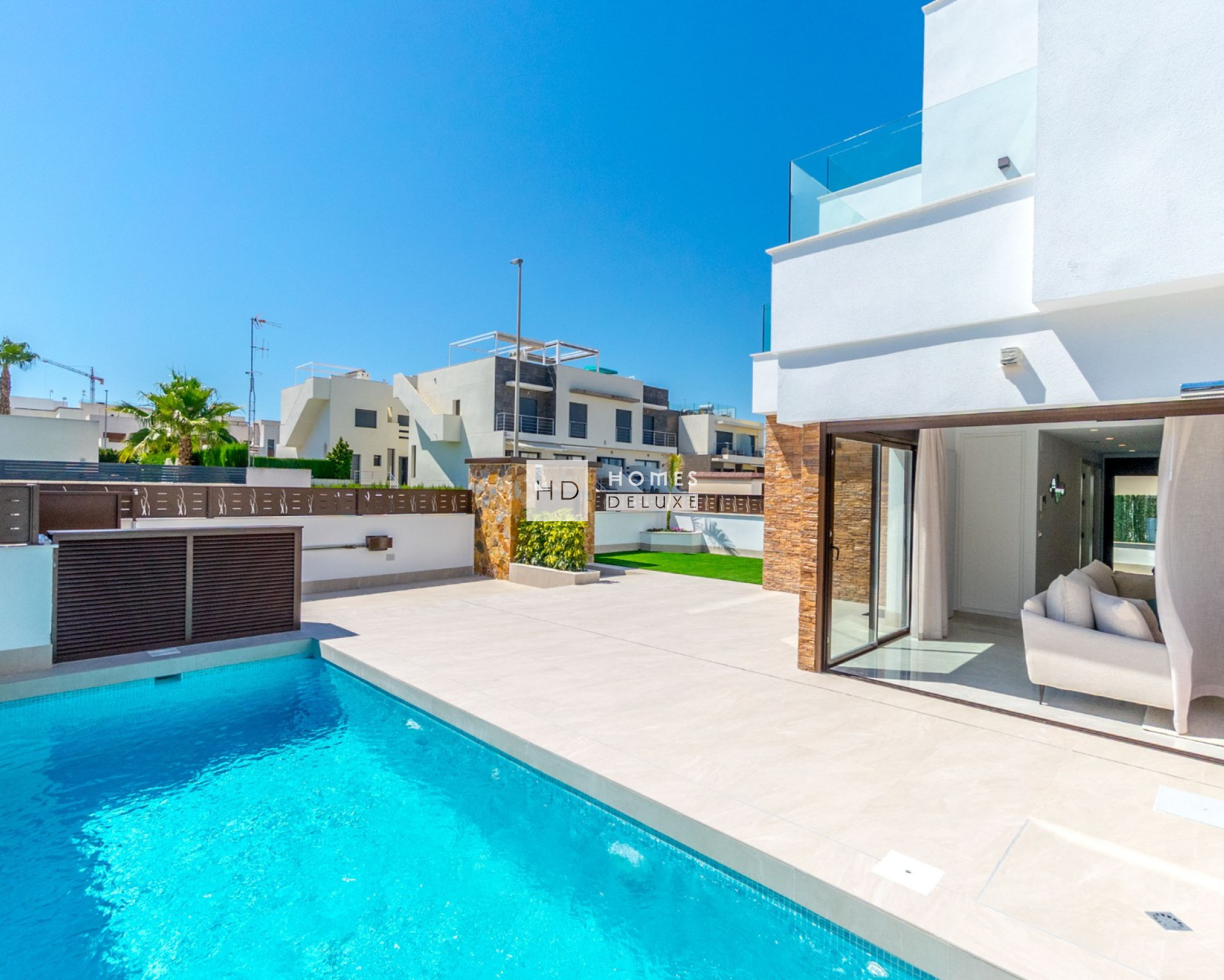 These stunning villas are built with a modern style with top quality finishes. The villas make the most of outdoor living in Spain with an ample private garden and terrace area including a private swimming pool. Extending the outdoor space further is two private sun terraces for each bedroom on the first floor level and an extensive rooftop solarium of nearly 40m2 to enjoy the sun all day long. Each of the homes has a barbecue area with sink installation either in the garden or on the solarium.